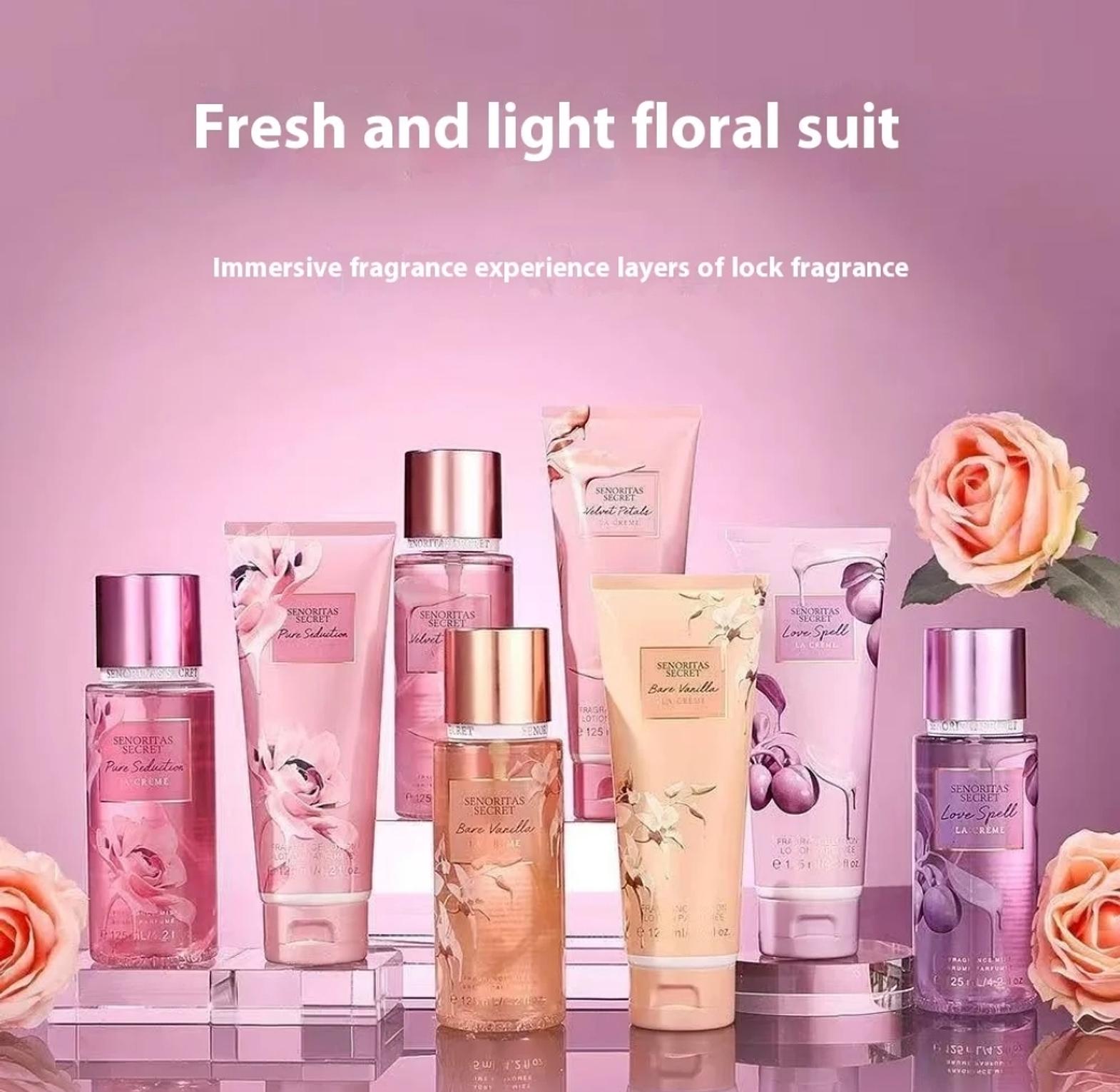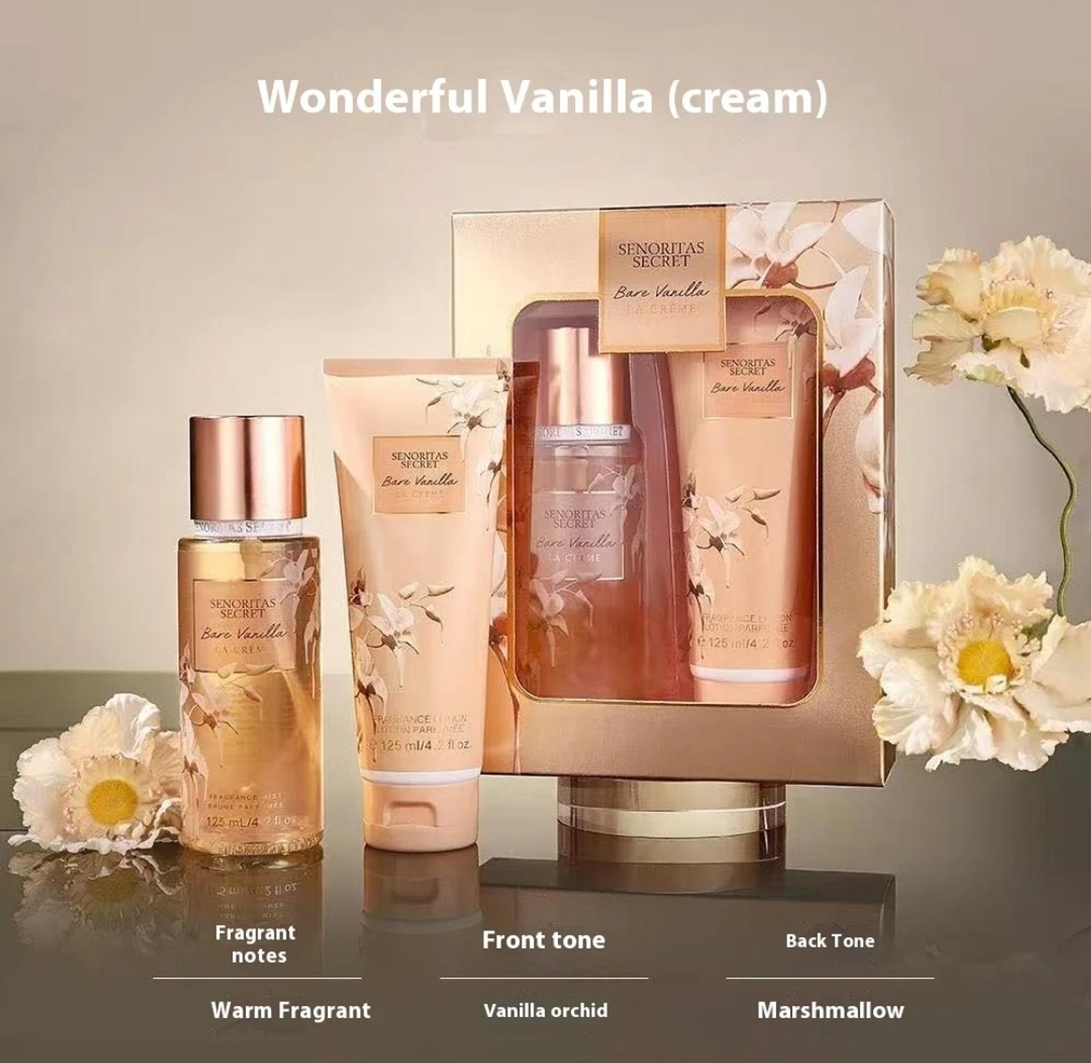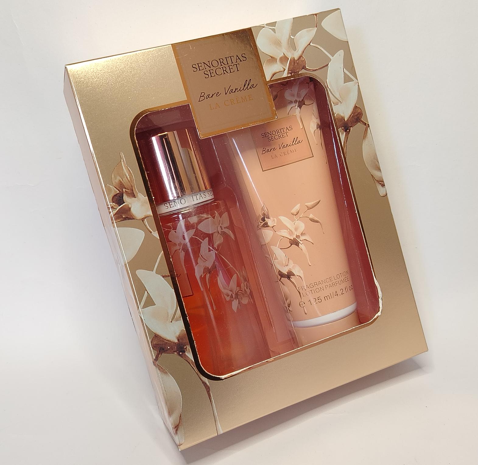 Senoritas Secret Bare Vanilla La Creme Perfume Gift Set contains 125ml Body Mist & 125ml Perfume Lotion with notes of warm fragrances, vanilla orchid and cotton candy.