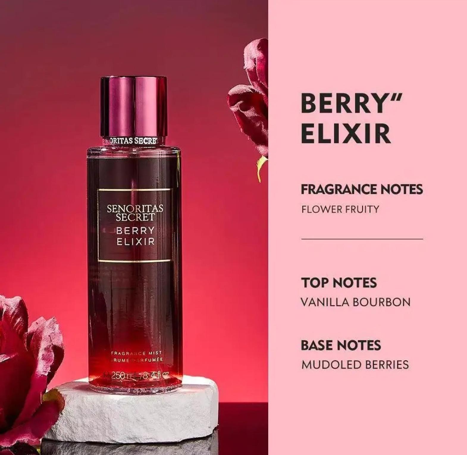 Berry Elixir Body Mist has a flower fruity fragrance with notes of vanilla bourbon and berries