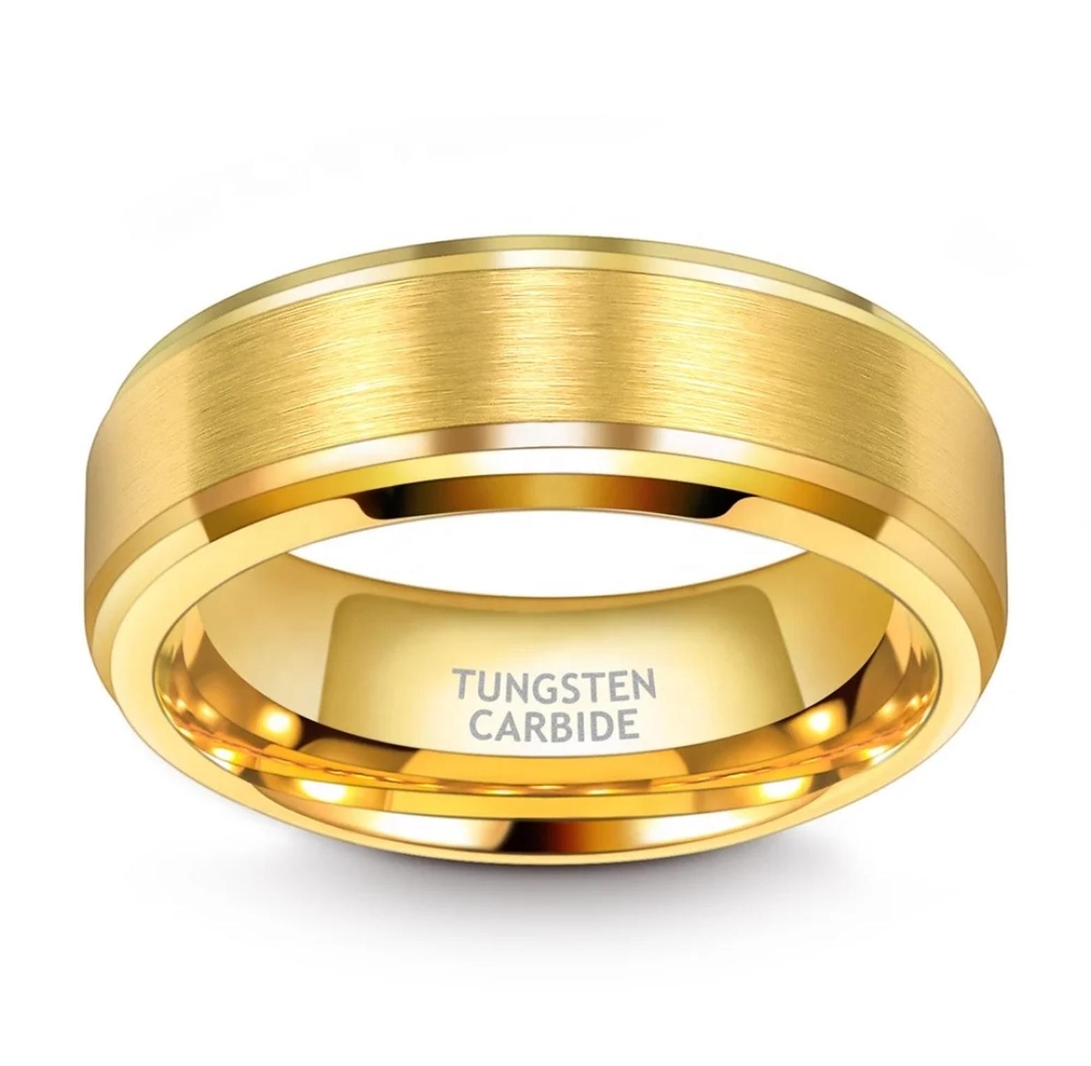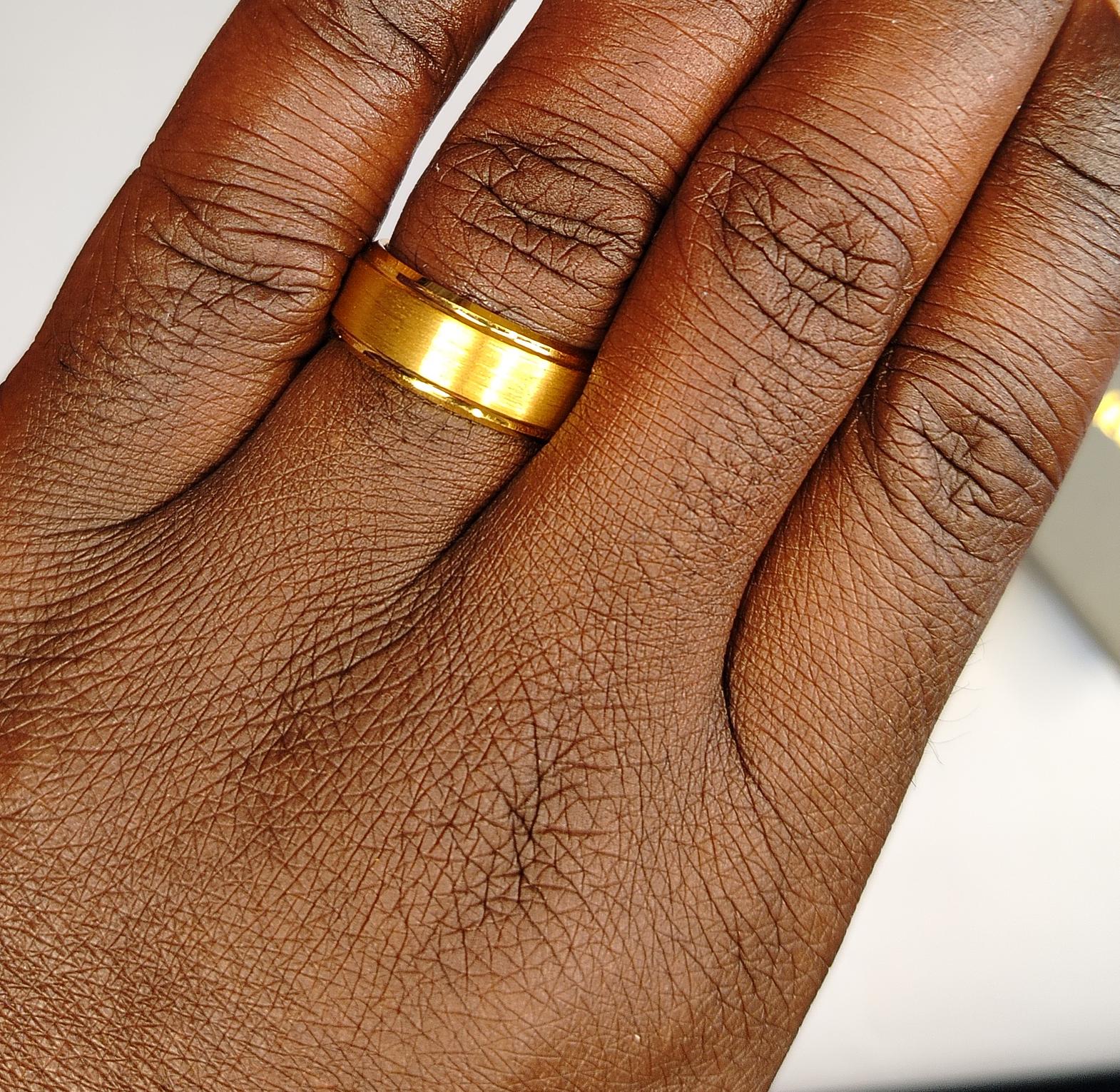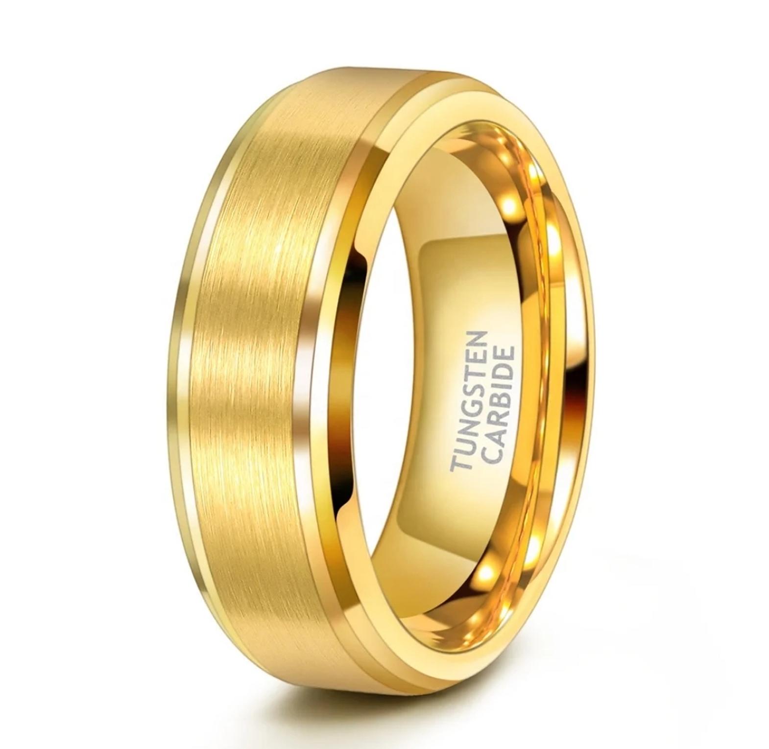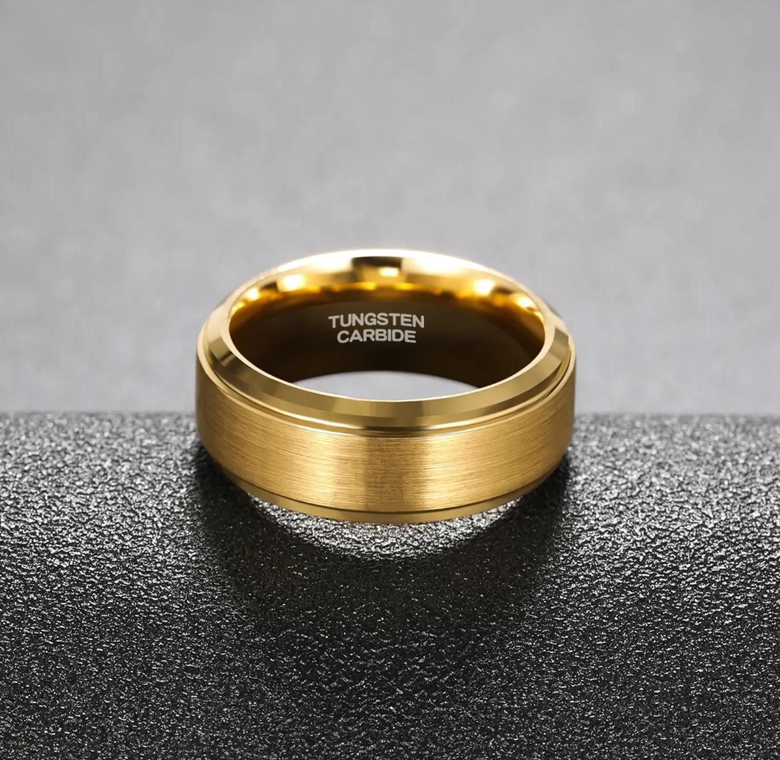 This Tungsten Carbide ring is sleek. It's finish is a textured brush gold plated finish, giving it a unique appearance. Tungsten is anti scratch so this ring will last.