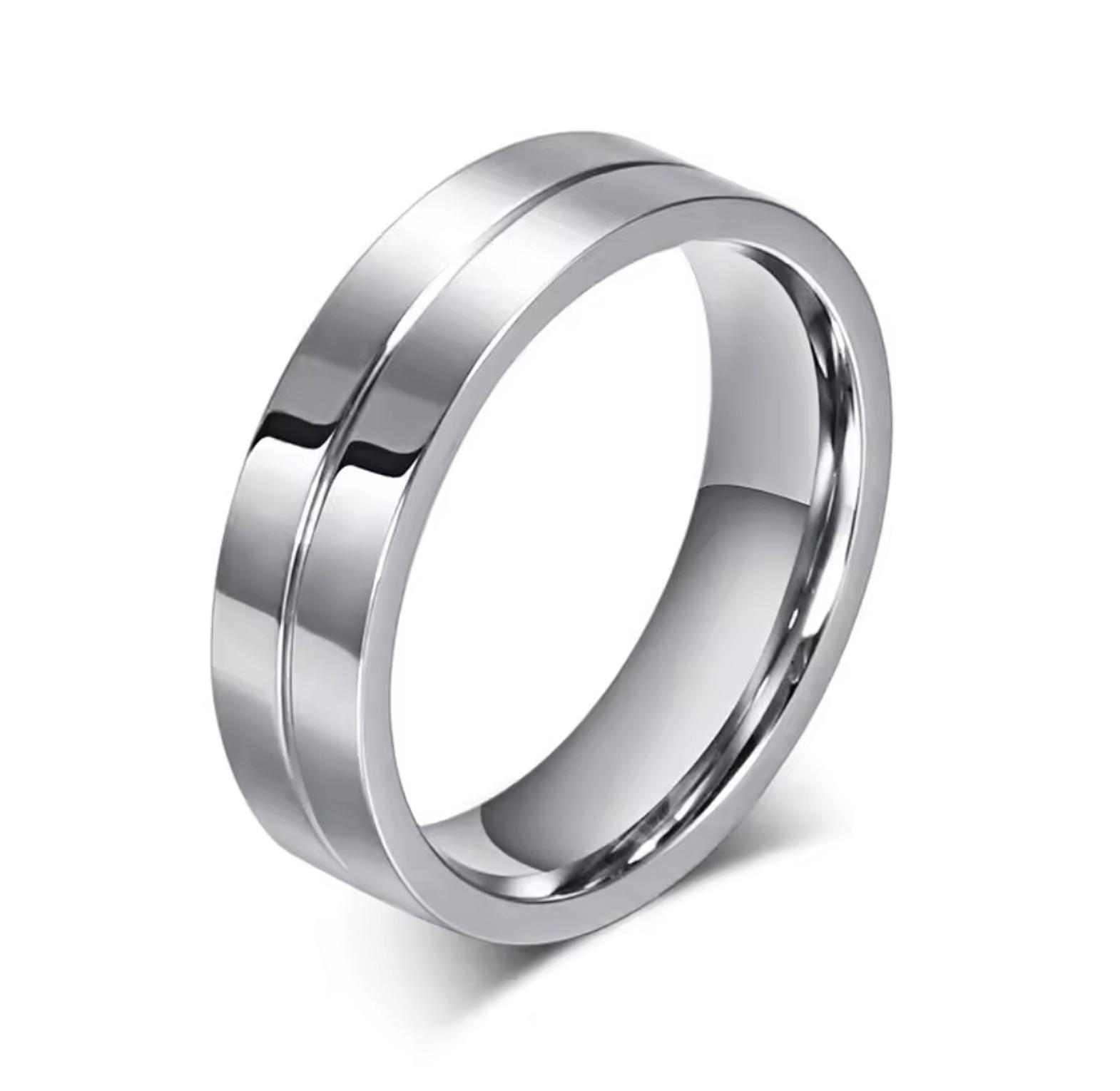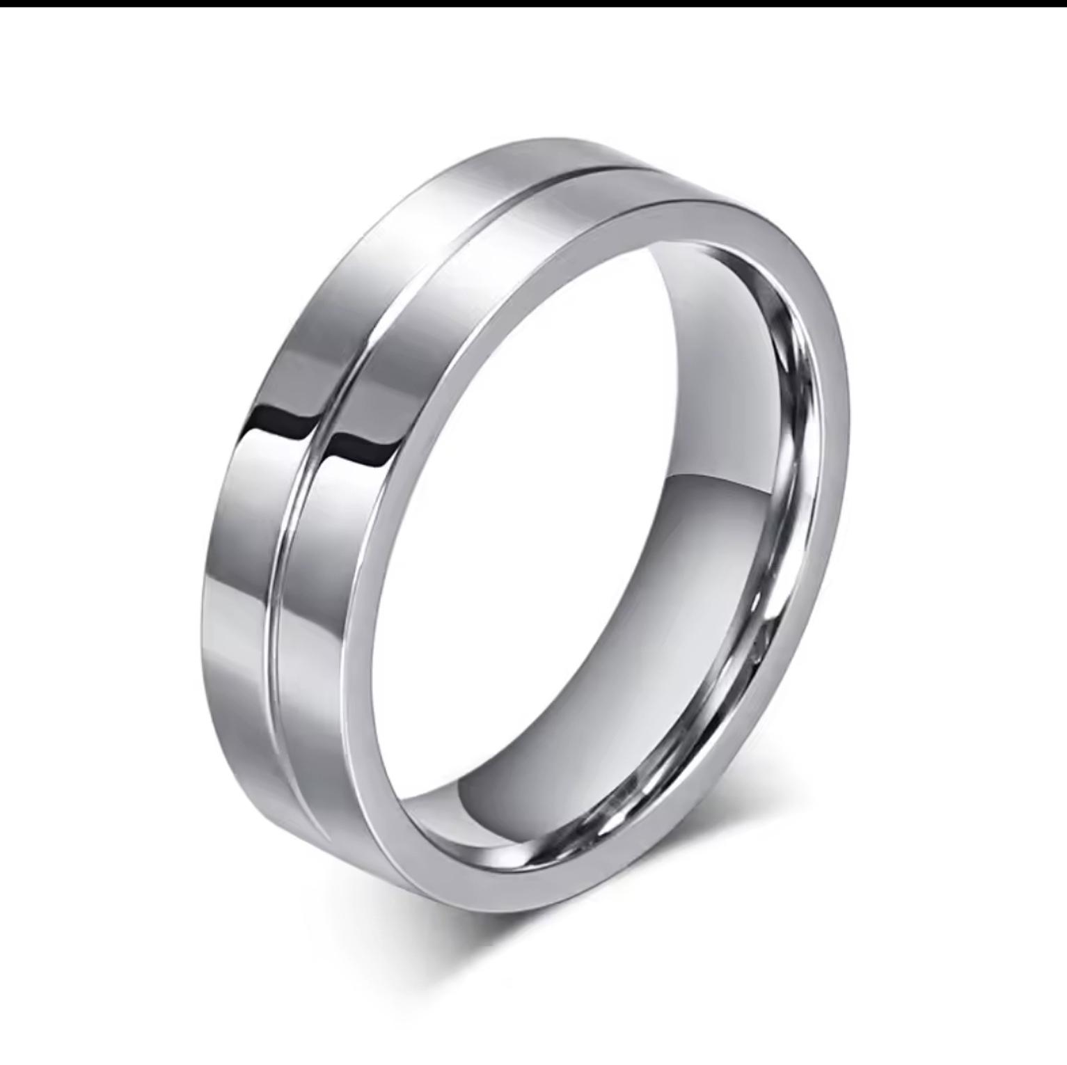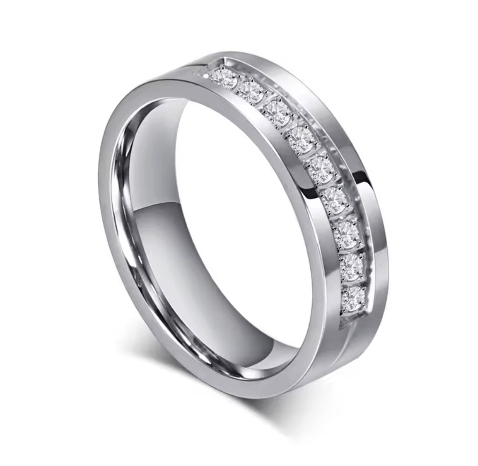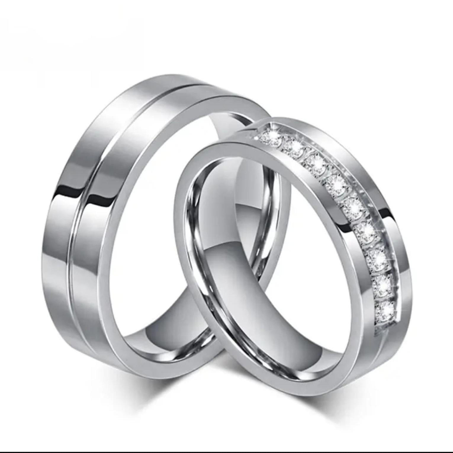 Price is for 1 ring. Symbolize your everlasting love with our Wedding Rings, a matching his and hers set crafted from resilient polished stainless steel. Her band sparkles with brilliant Cubic Zirconia, while his offers sleek, enduring style, embodying a love that's both strong and dazzling. Price is for one ring.