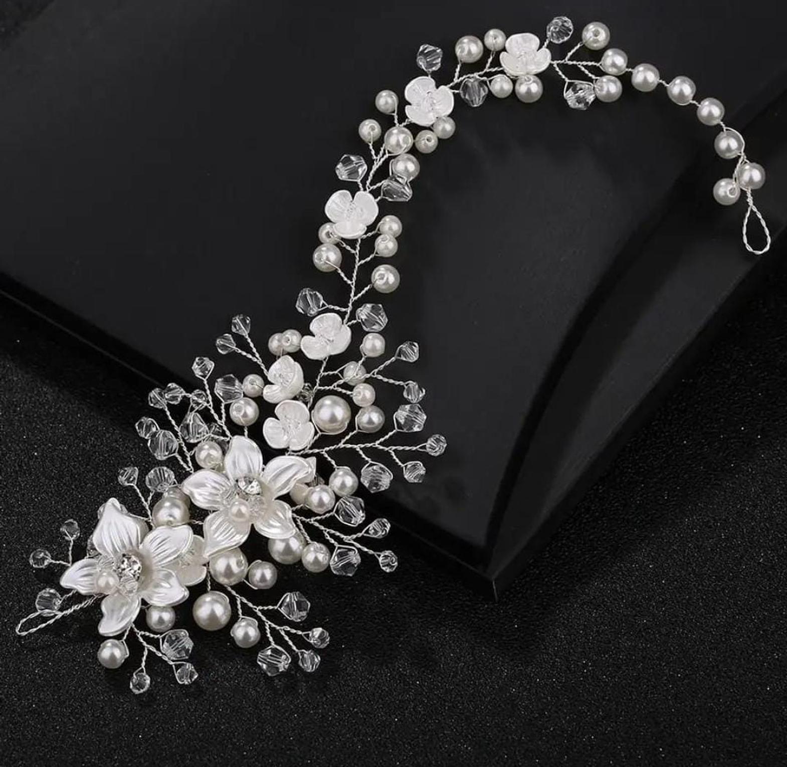 Accentuate your bridal look with this floral-inspired hairpiece, designed to bring a soft, romantic touch to your wedding day.