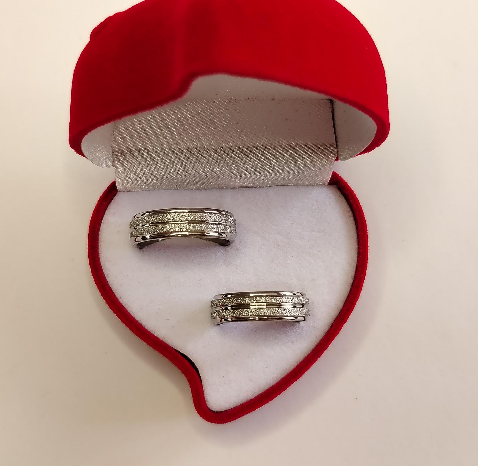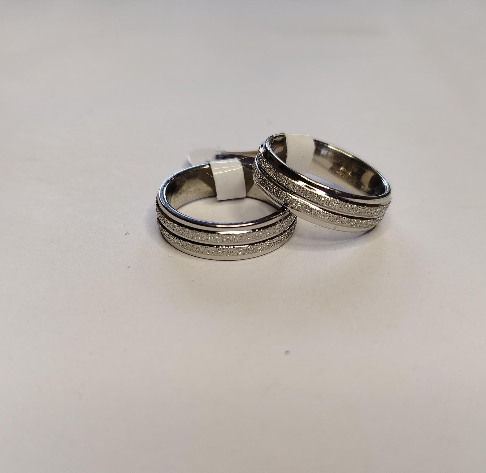Polished Stainless steel frosted wedding rings. We engrave names and dates.