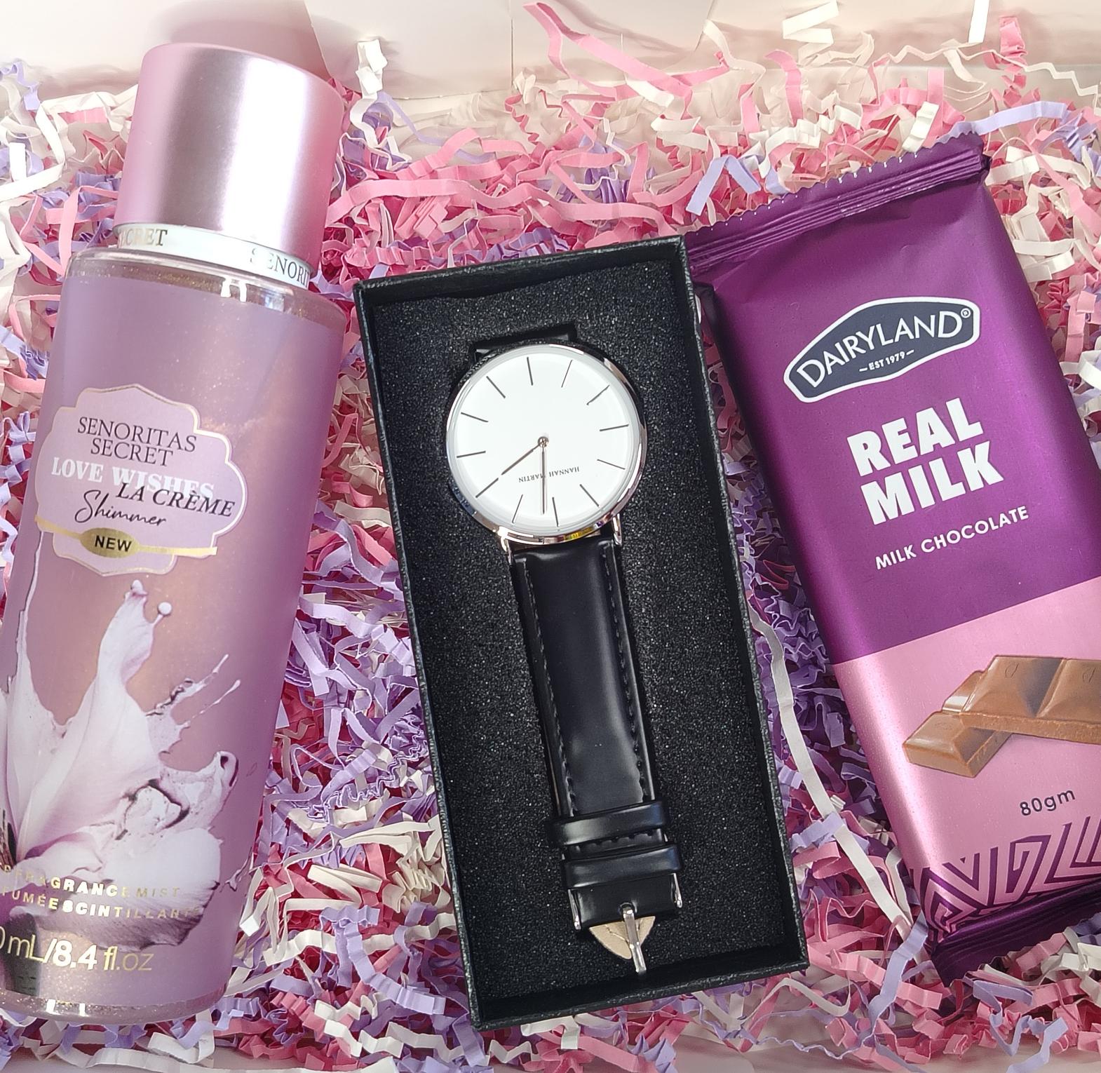 Hannah Martin Genuine Leather Watch, 250ml Senoritas Secret Body Mist and Chocolate 80g