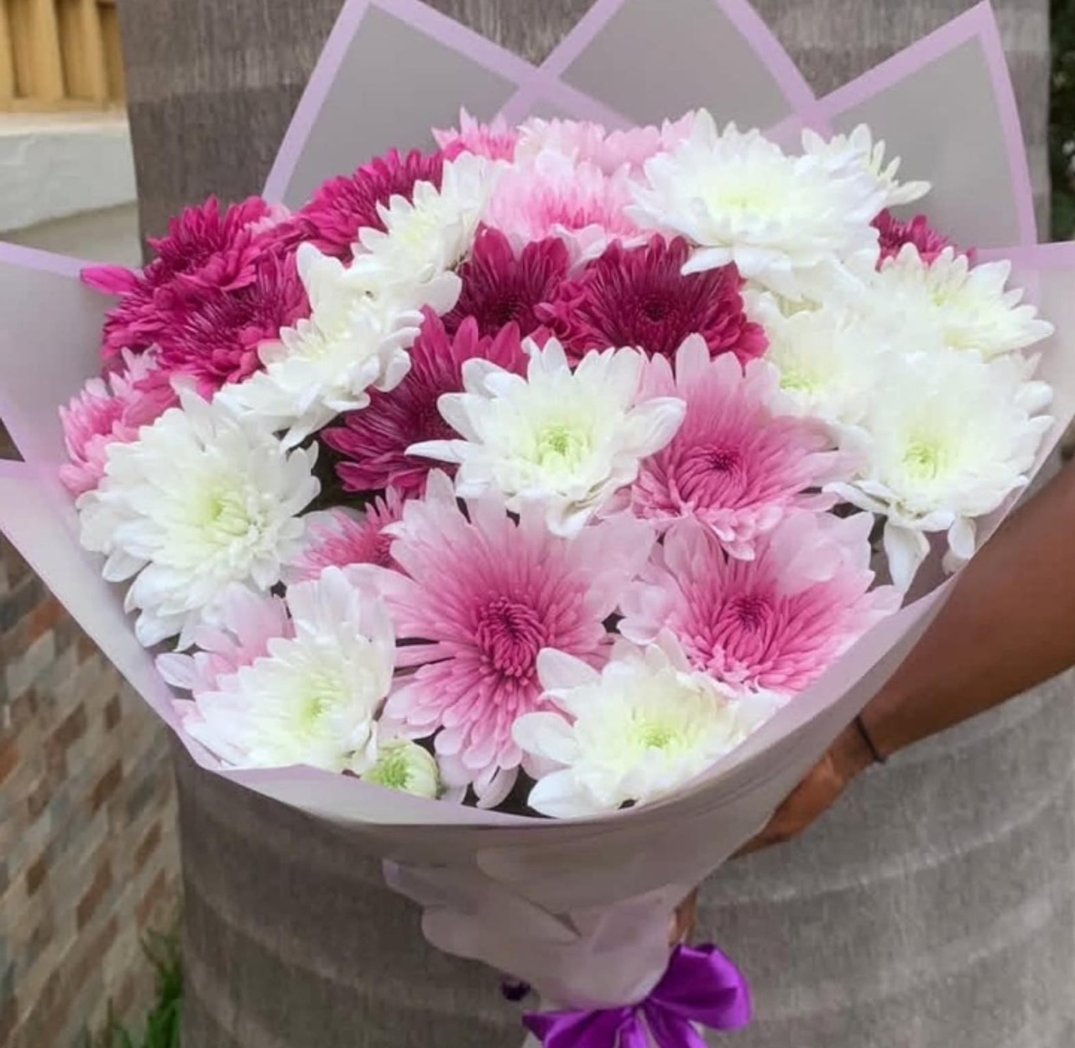 Chrysanthemums instantly brighten your day. Cheer someone up with this purple, pink and white mums bouquet