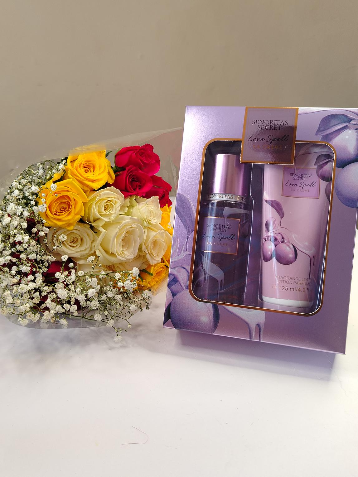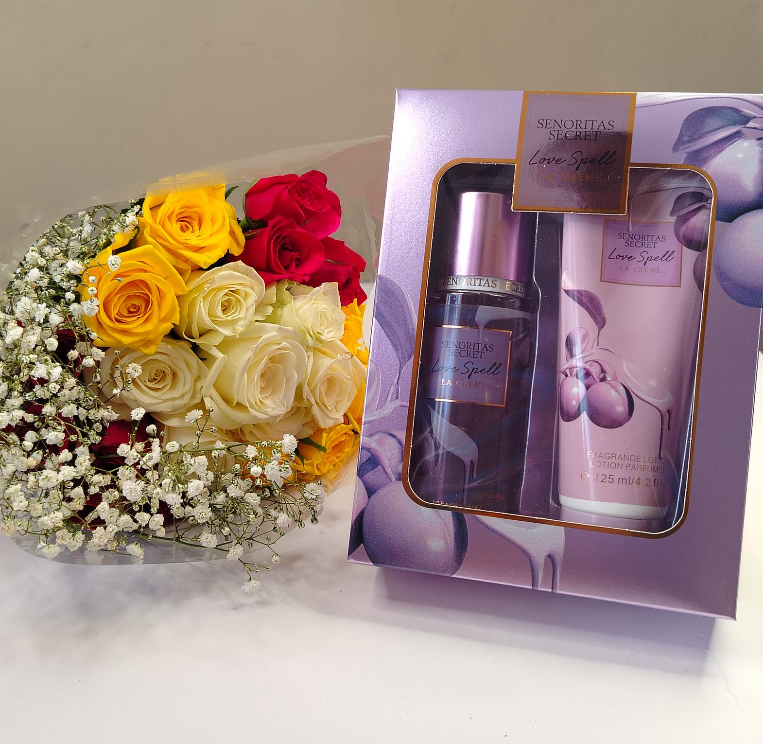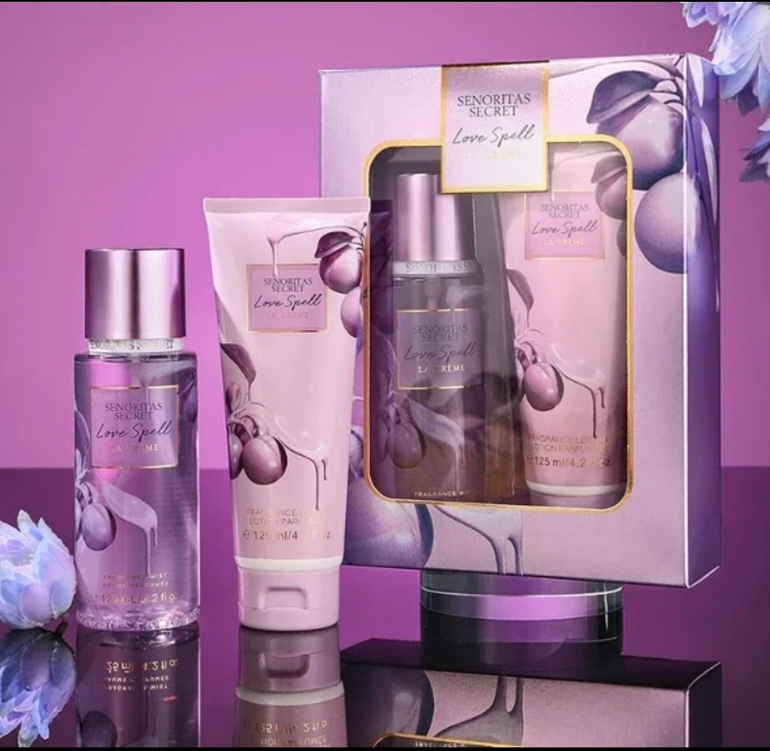 Perfume Gift Set with 125ml Perfume Lotion and 125ml Perfume Body Mist. A fruity fragrance with notes of peach blossom and hazelnut. It's a lovely non irritating and lasting scent. Comes packed as a gift.