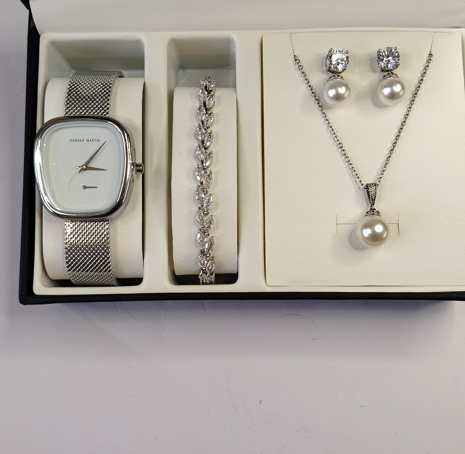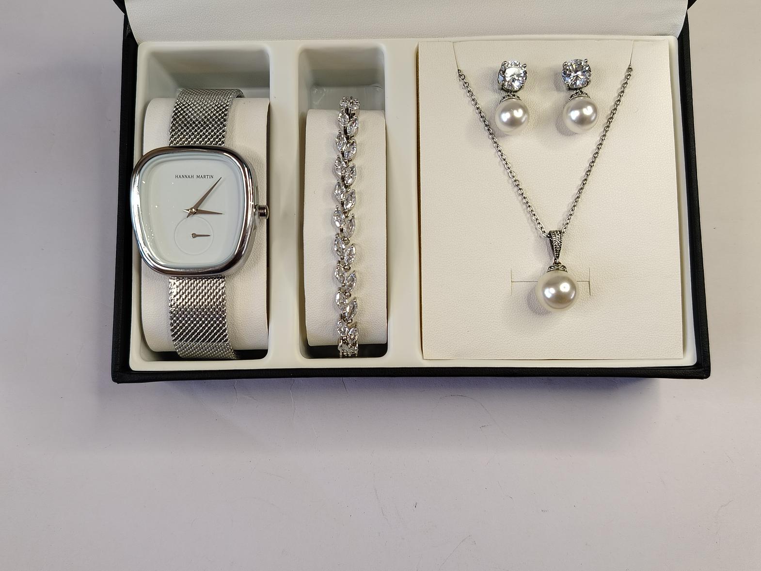 This beautiful gift set contains pearl earrings and necklace, a sparkling zirconia leaf bracelet and a stylish Hannah Martin Watch. It's a gift that's functional, and one that will last.