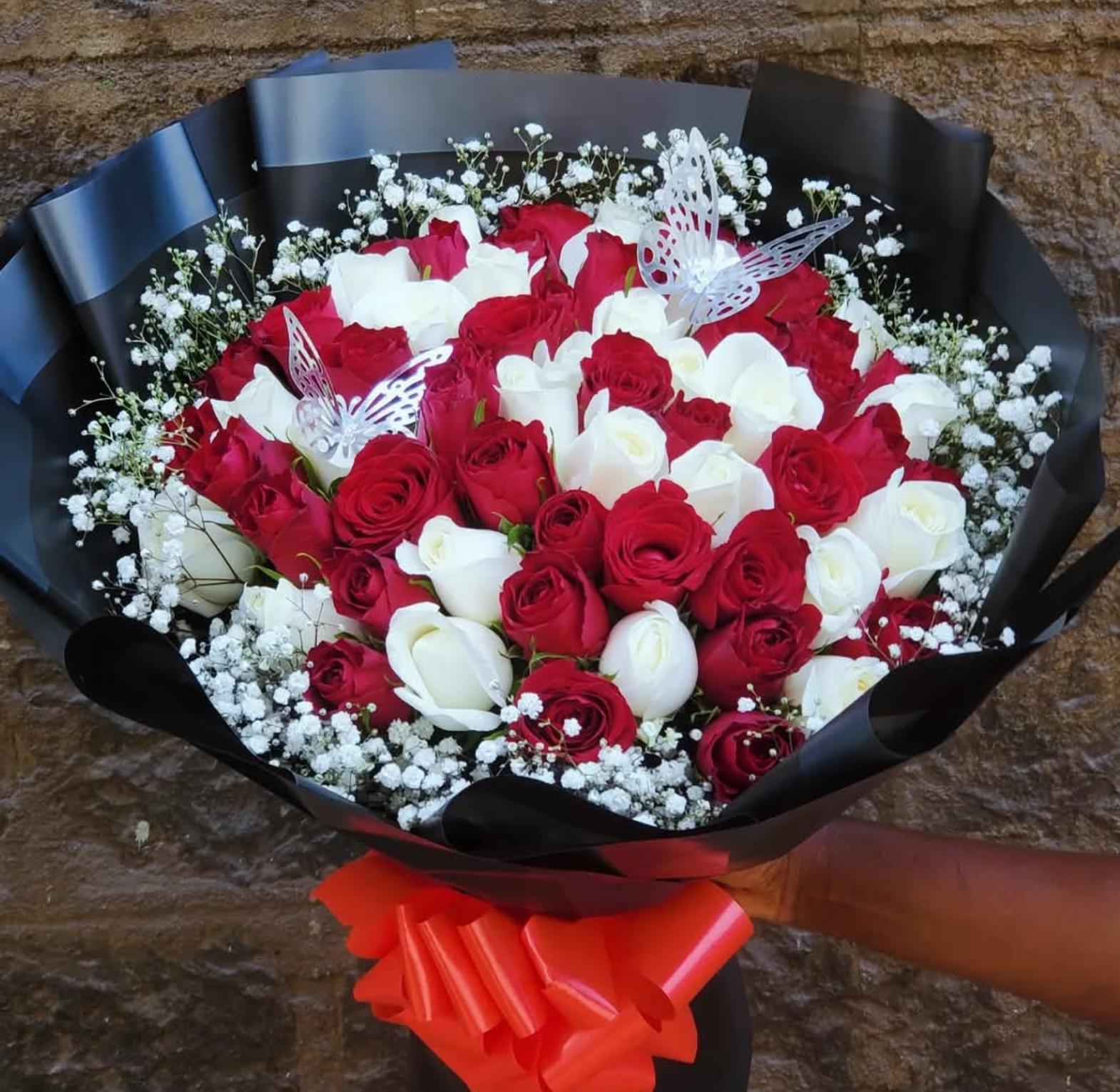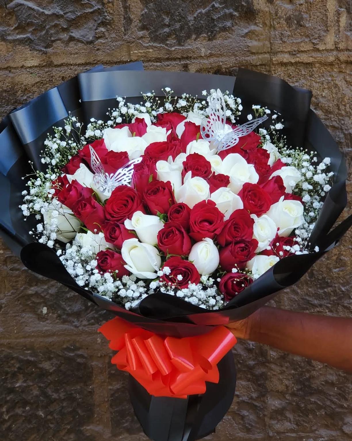 An amazing bouquet for your special someone. Made with blossoming red and white roses surrounded by white baby breathes to brighten your loved one's day.