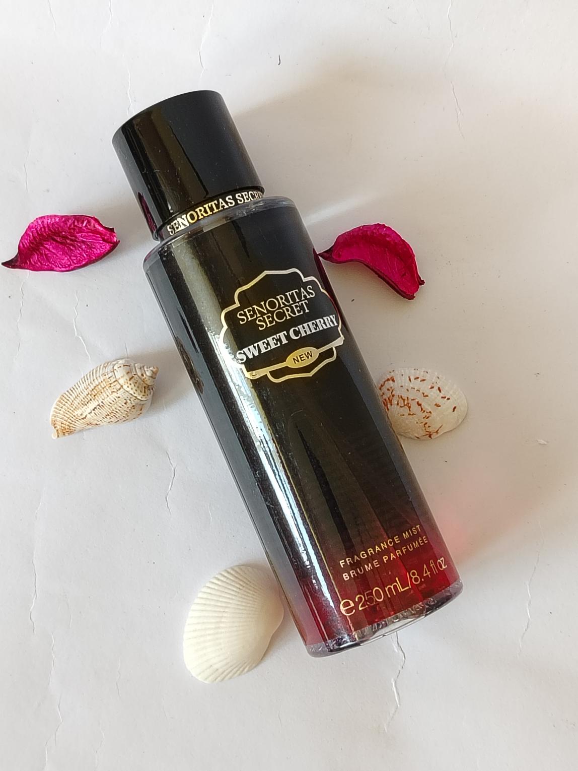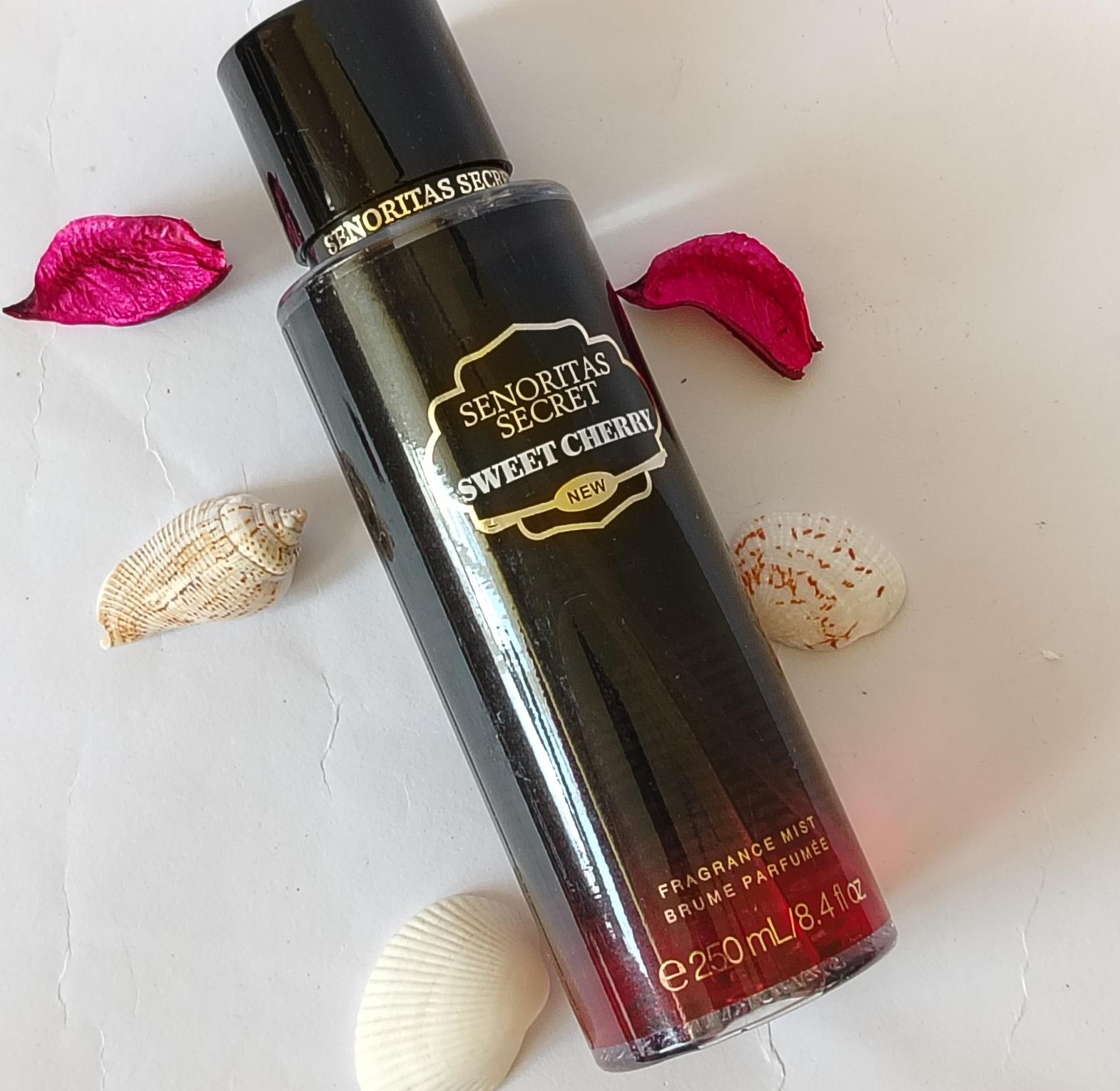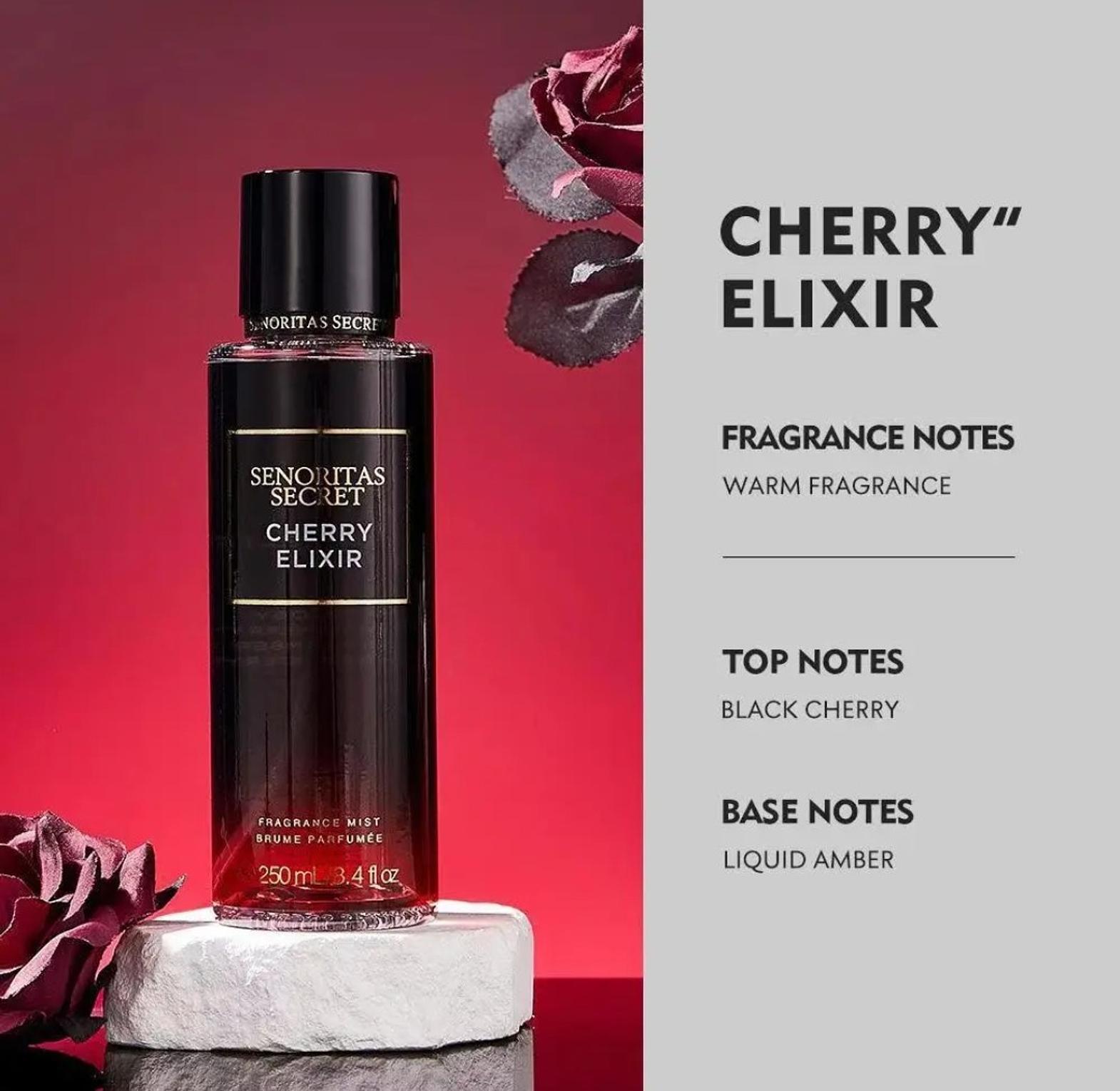 Senoritas Secret Cherry Elixir Body Mist is a warm fragrance with notes of black cherry and liquid amber. A sophisticated fragrance for a classy woman.