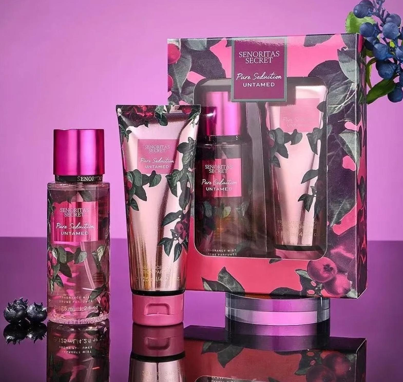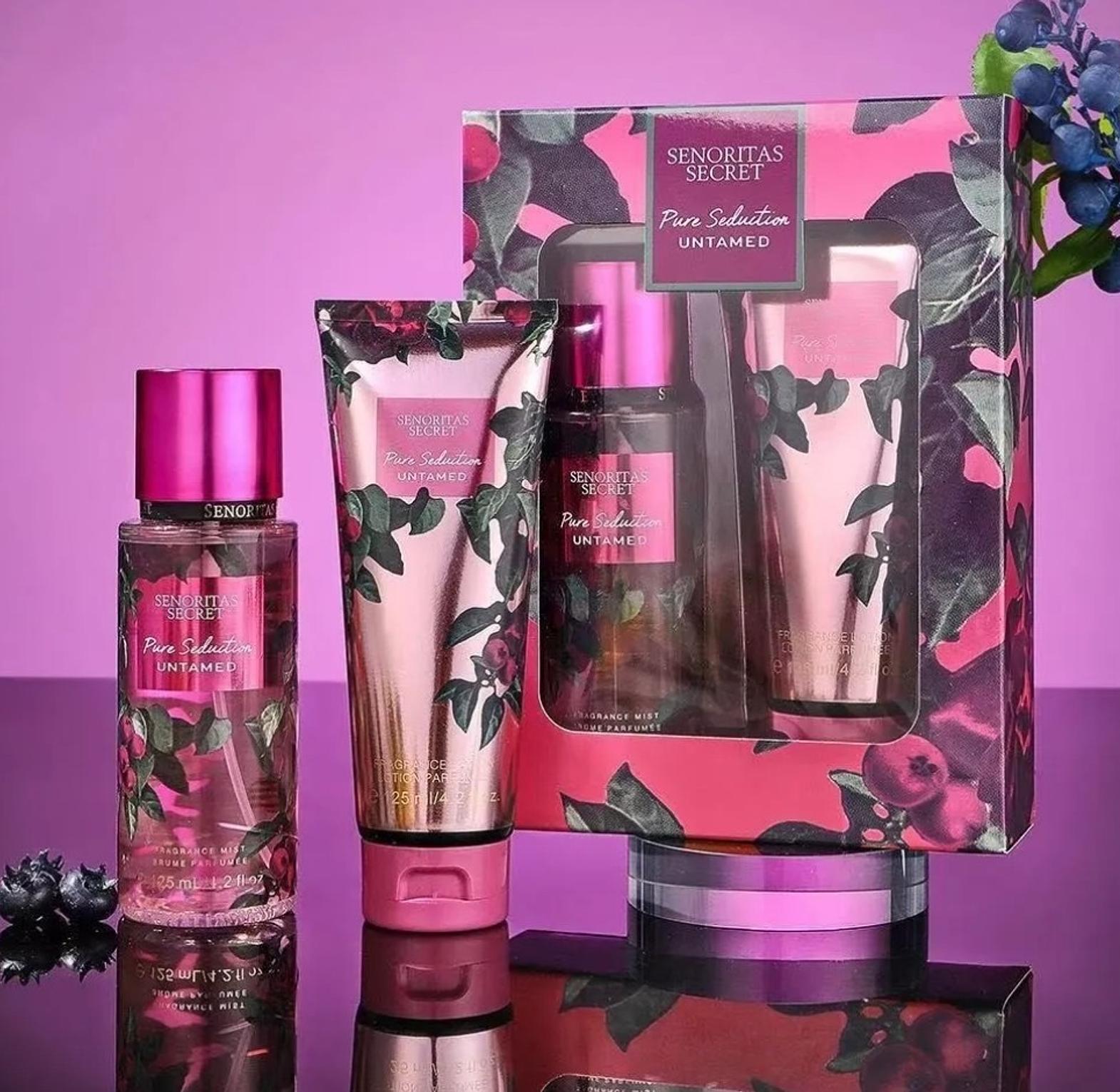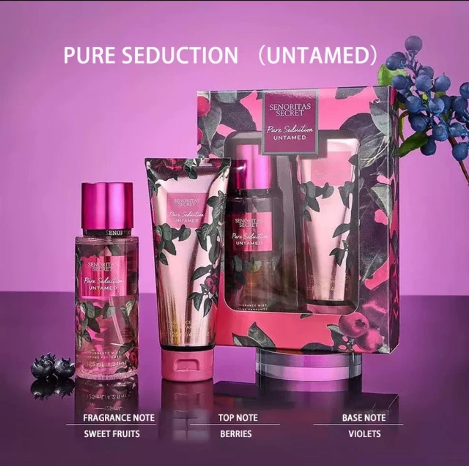 Senoritas Secret Pure Seduction Untamed Gift Set Box contains 125ml Perfume Body Mist 125ml Perfume Lotion. Comes in a beautiful box ready for gifting It's a sweet fruity fragrance with notes of berries and violet.