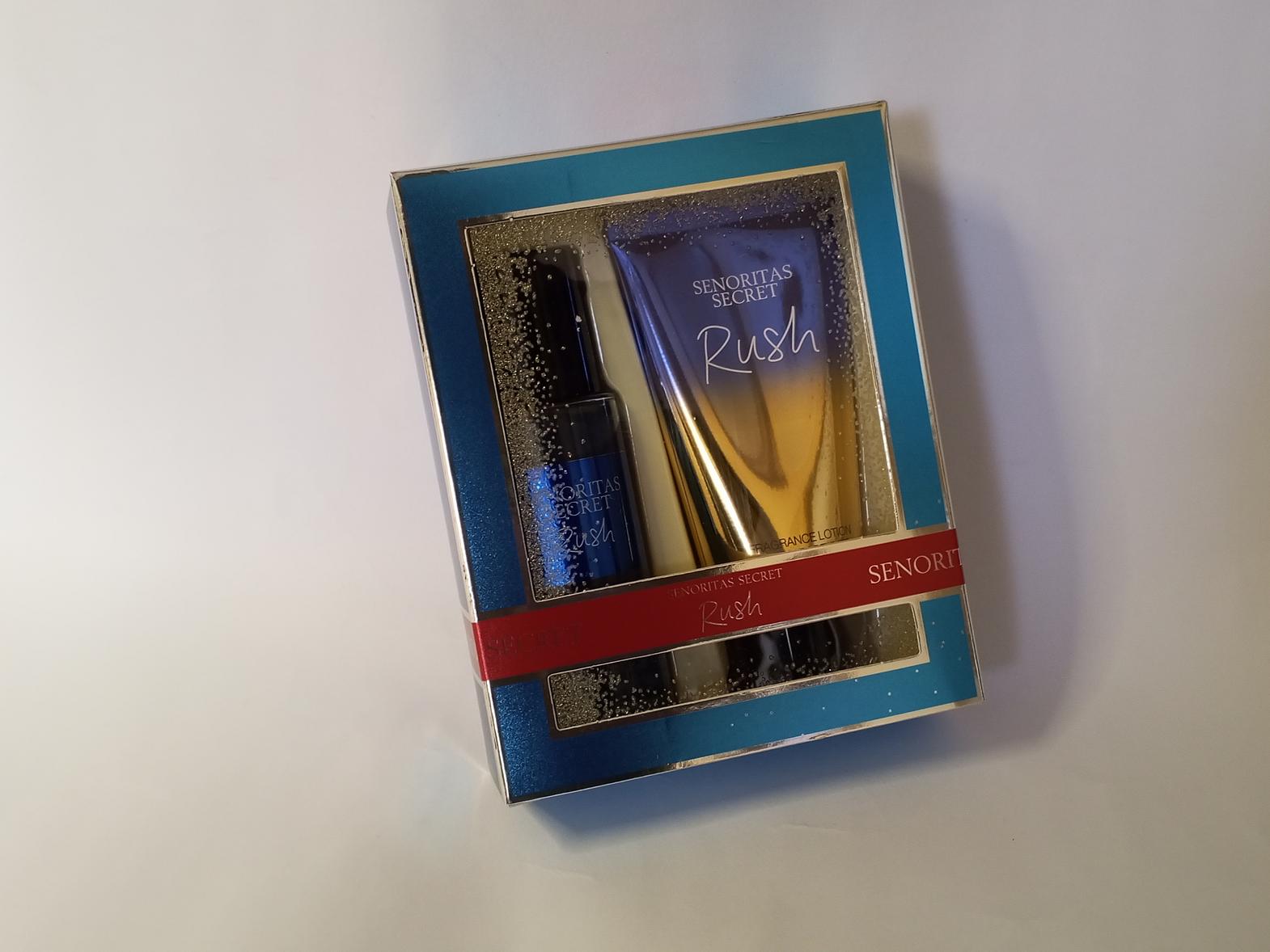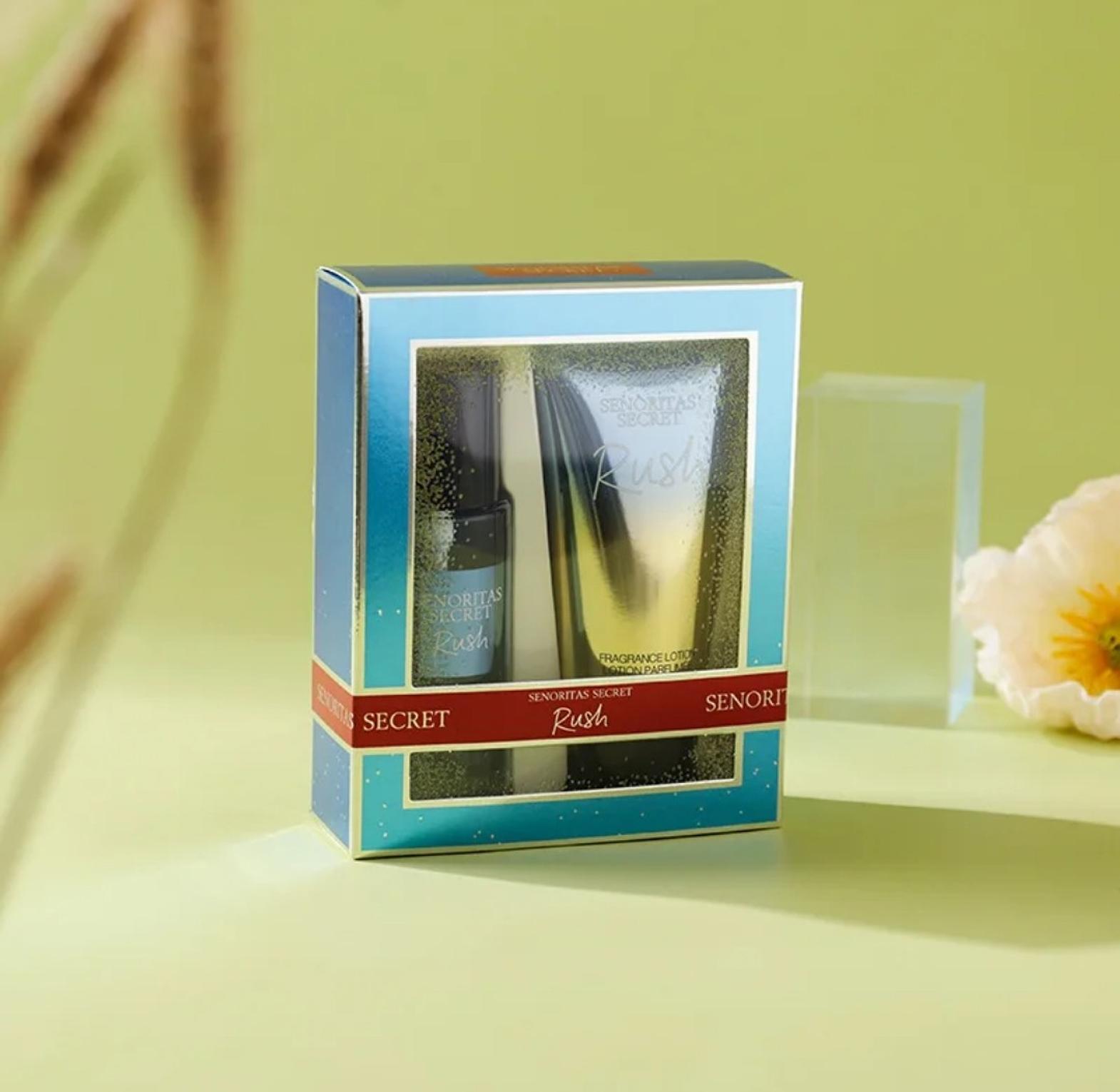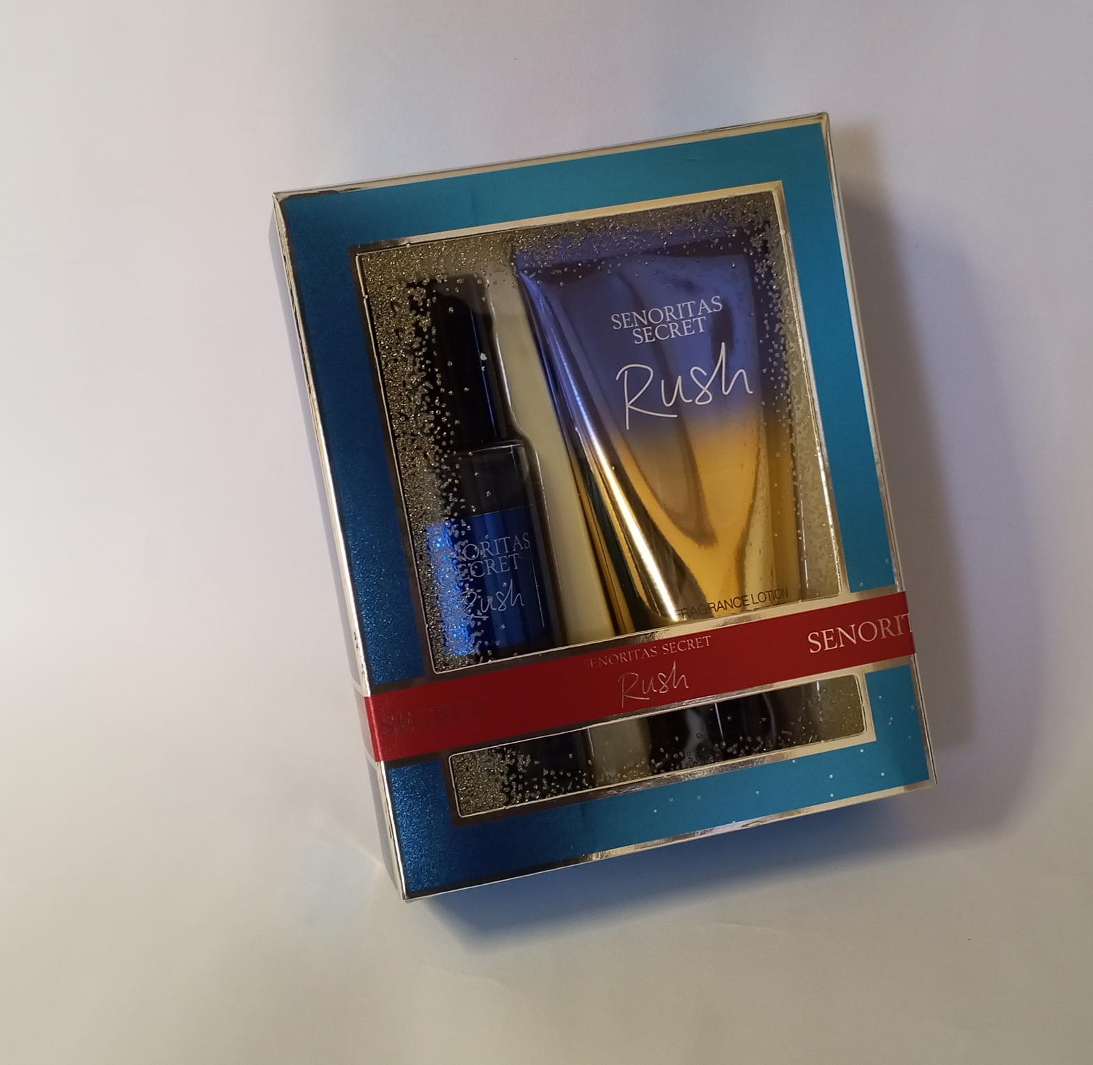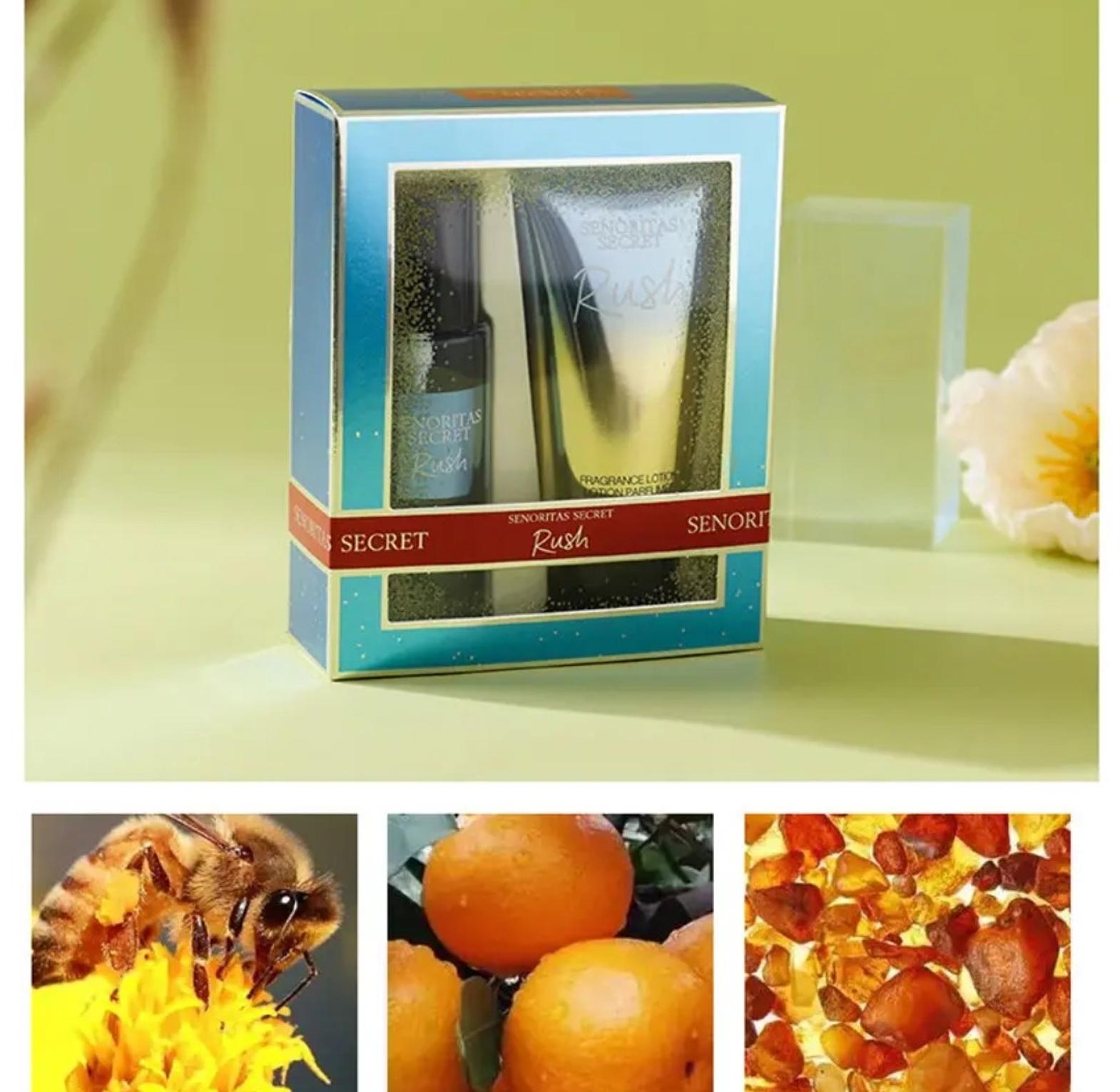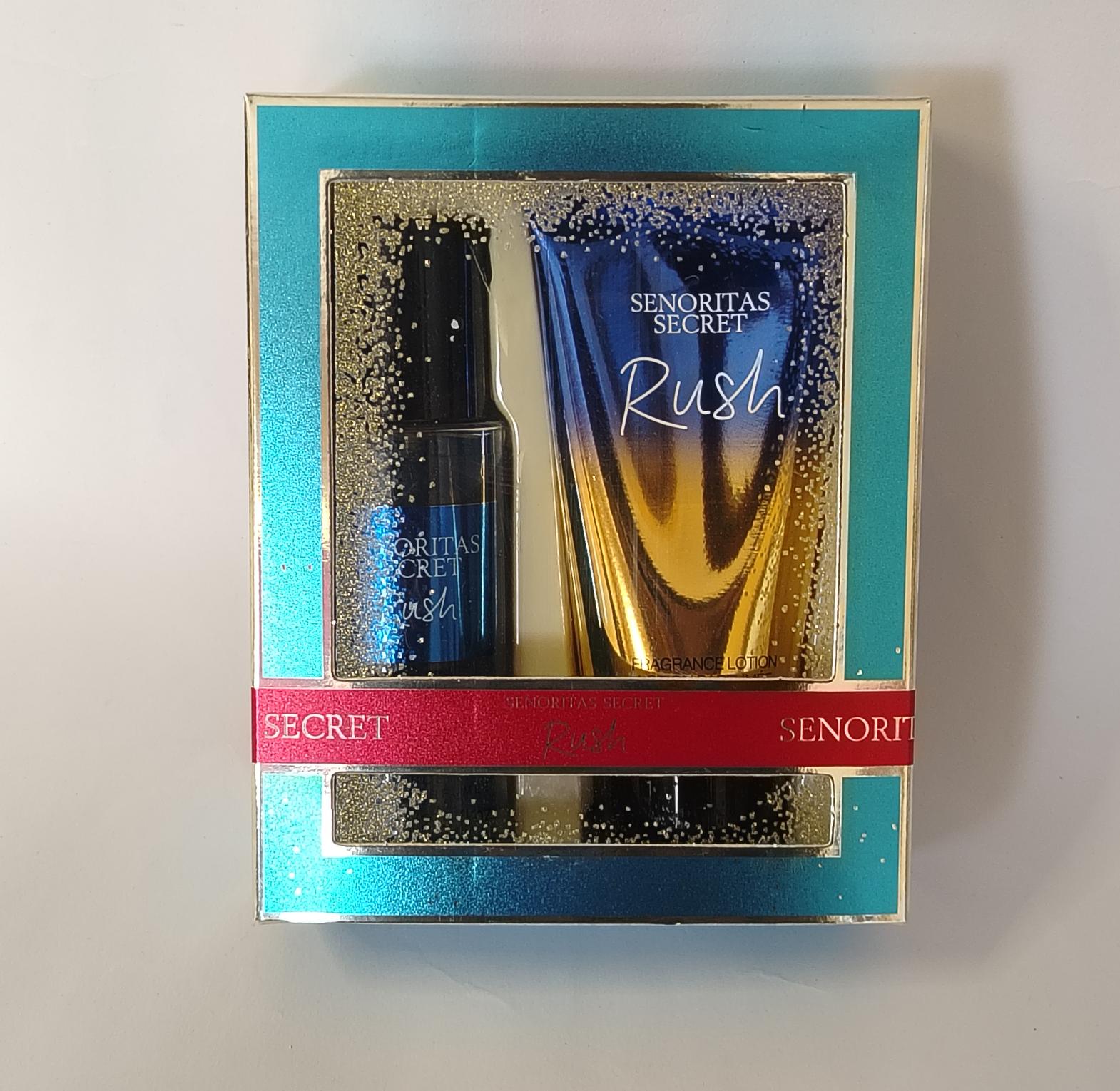 Senoritas Secret Rush Travel Size Perfume Gift Set contains 75ml Perfume Lotion & 75ml Body Mist with notes of flower, fruit, small citrus and amber fragrances.