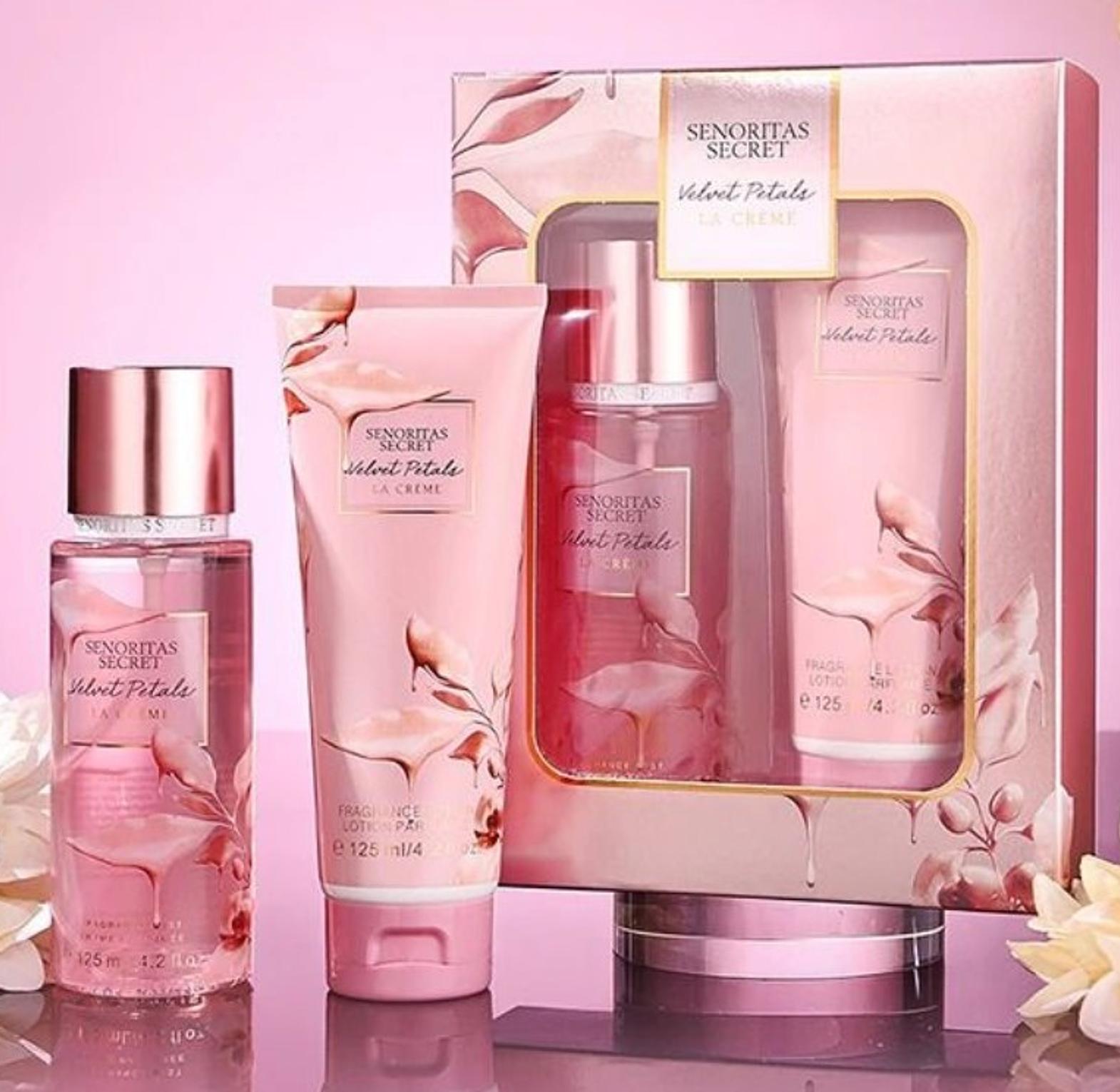 Senoritas Secret Velvet Petals La Creme Perfume Gift Set contains 125ml Body Mist & 125ml Perfume Lotion with warm scent fragrances and notes of epiphyllum and white sandalwood.