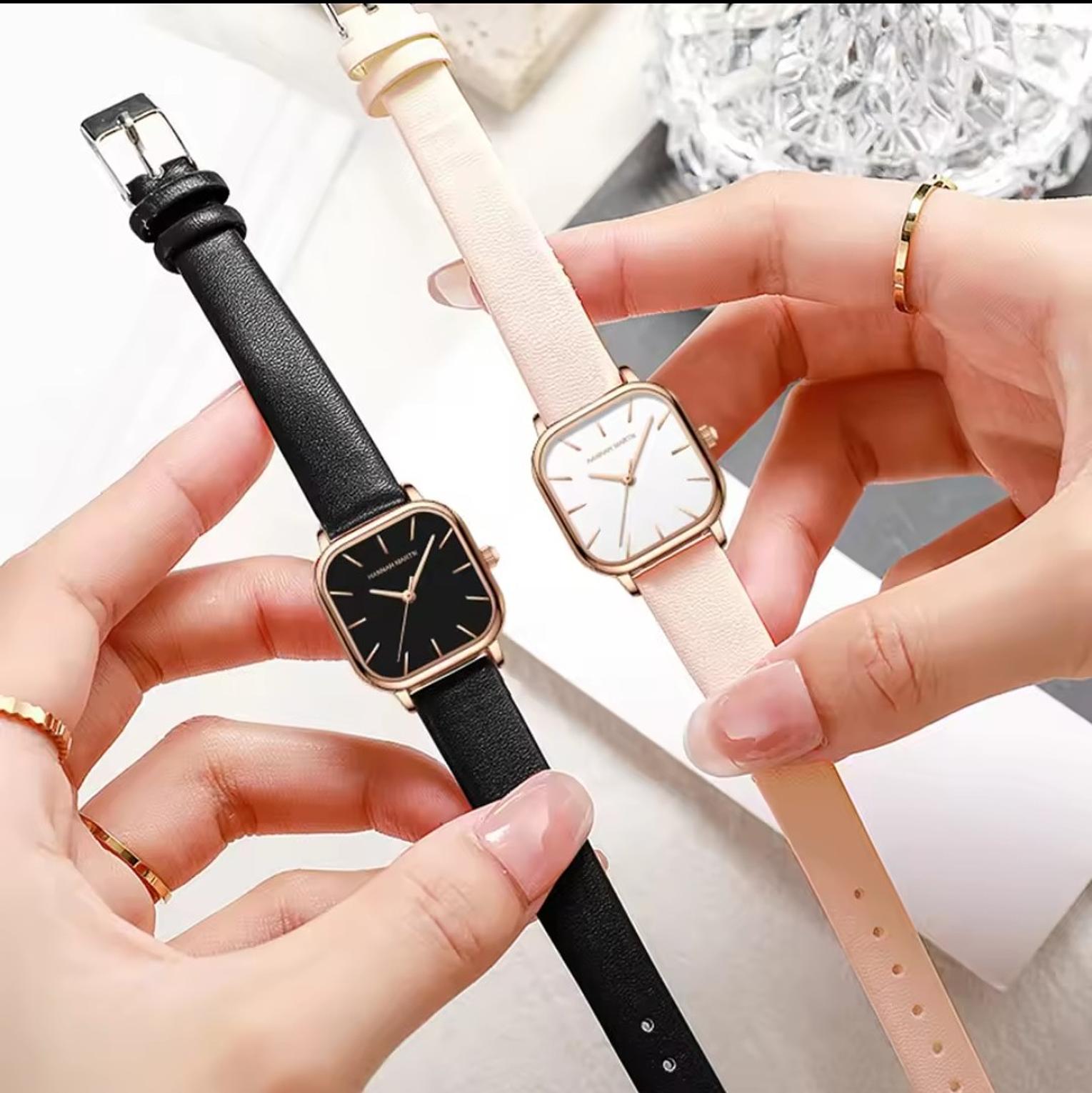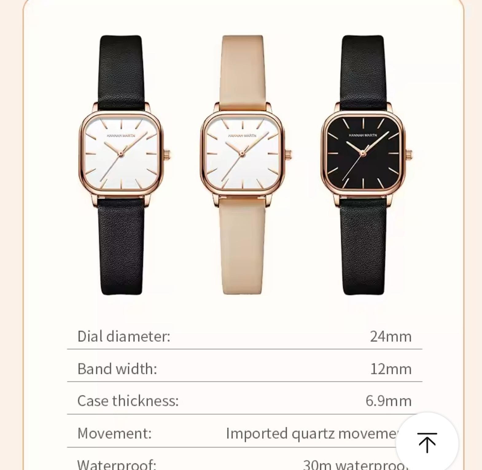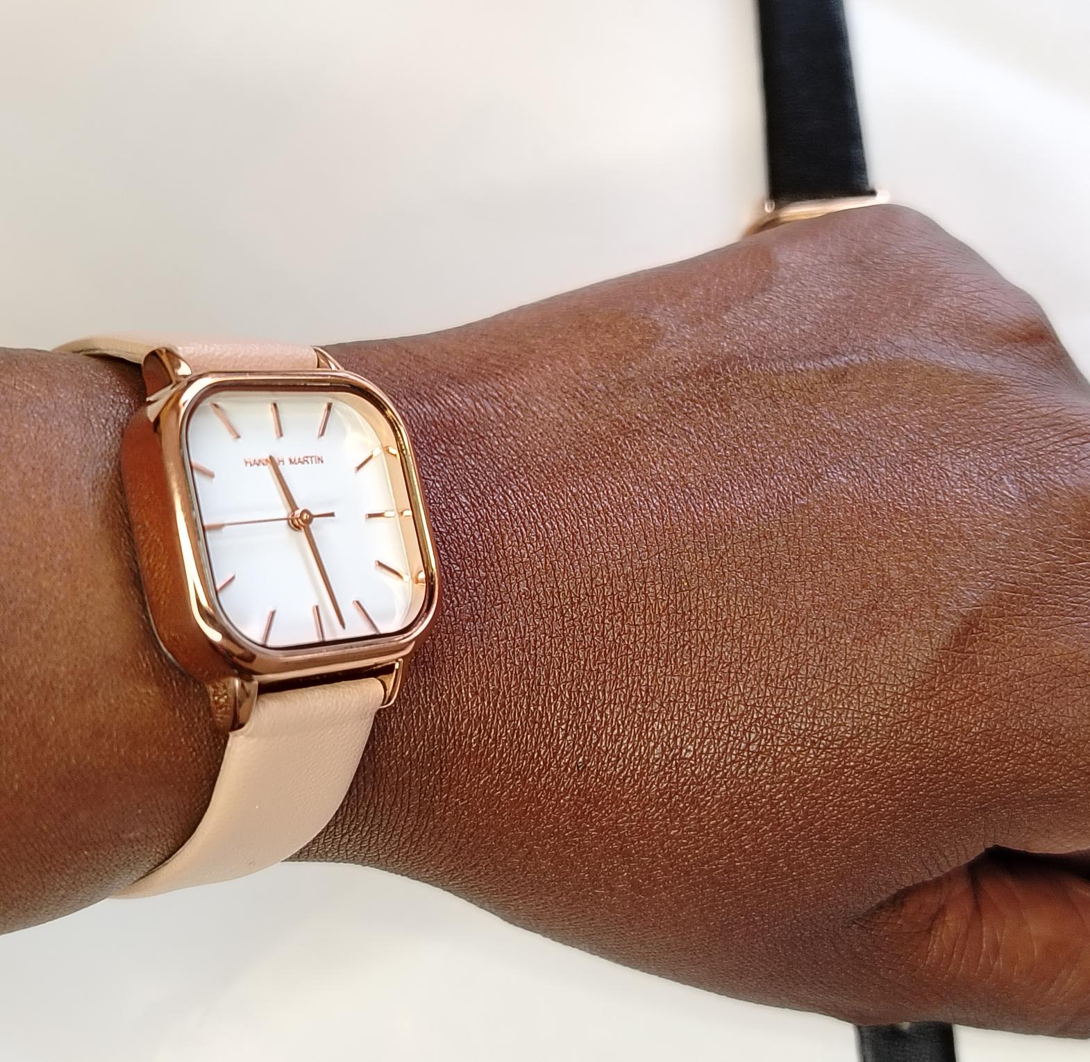 A square rose gold watch with genuine leather straps. Face is Hardlex and bands are made of genuine leather