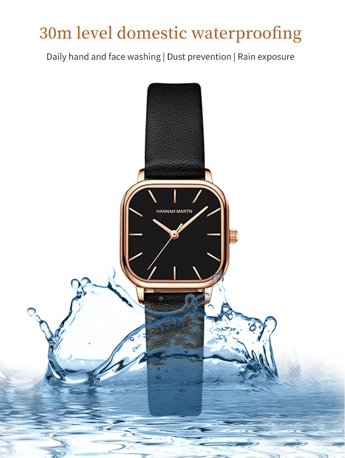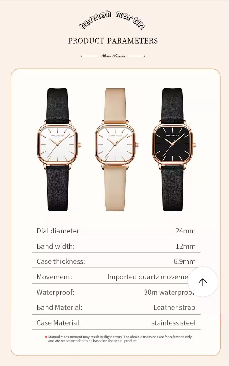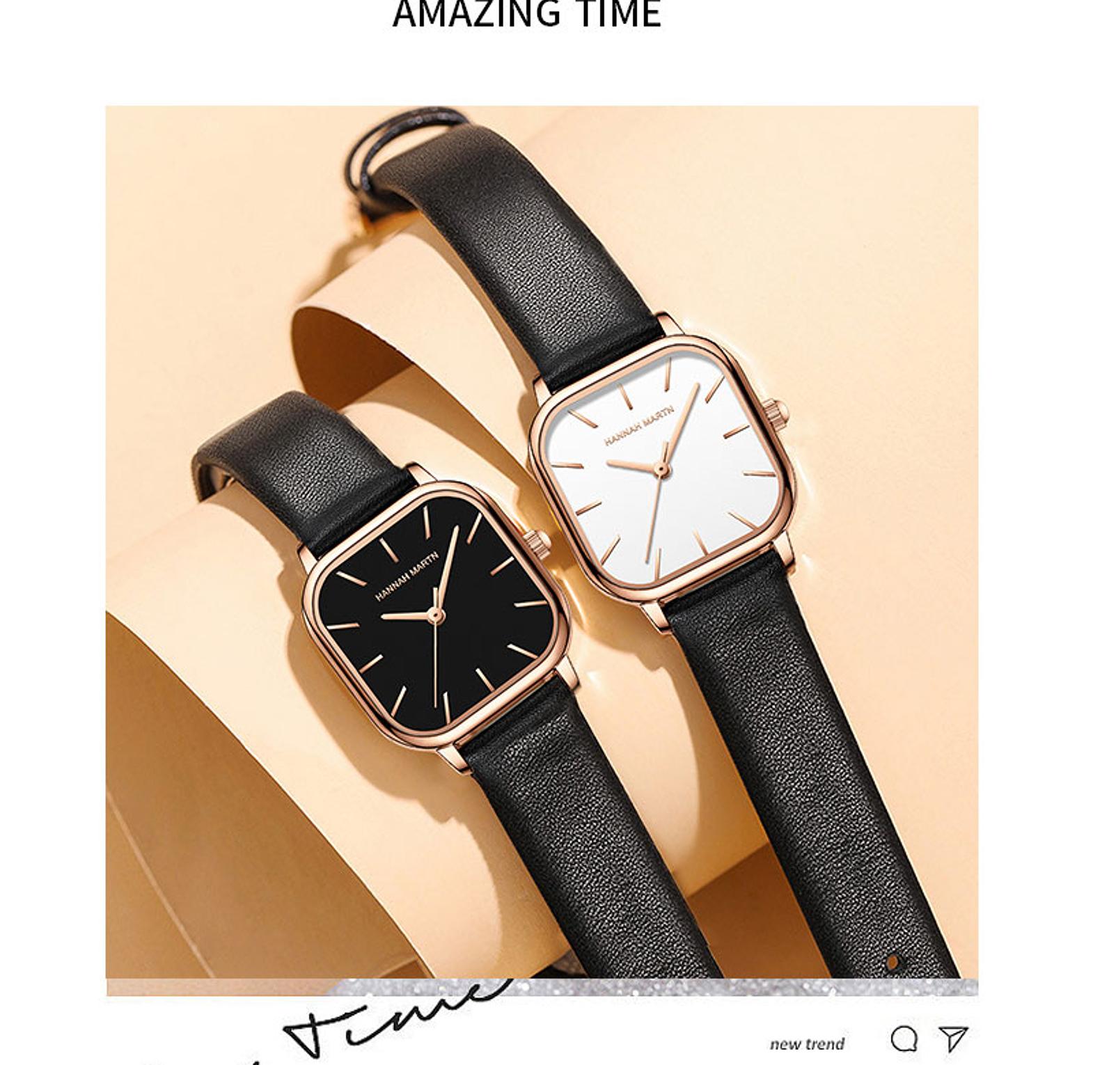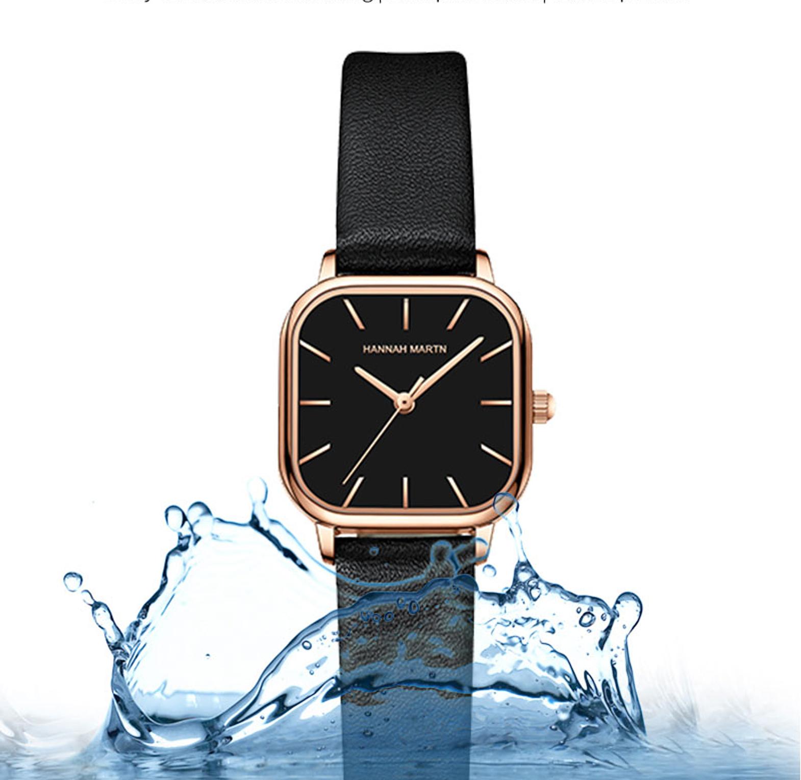 A square rose gold watch with genuine leather straps. Face is Hardlex and bands are made of genuine leather