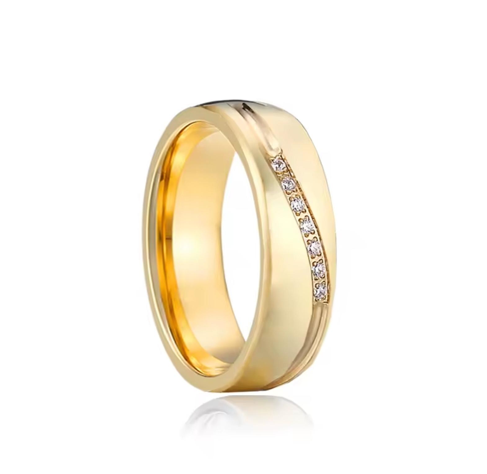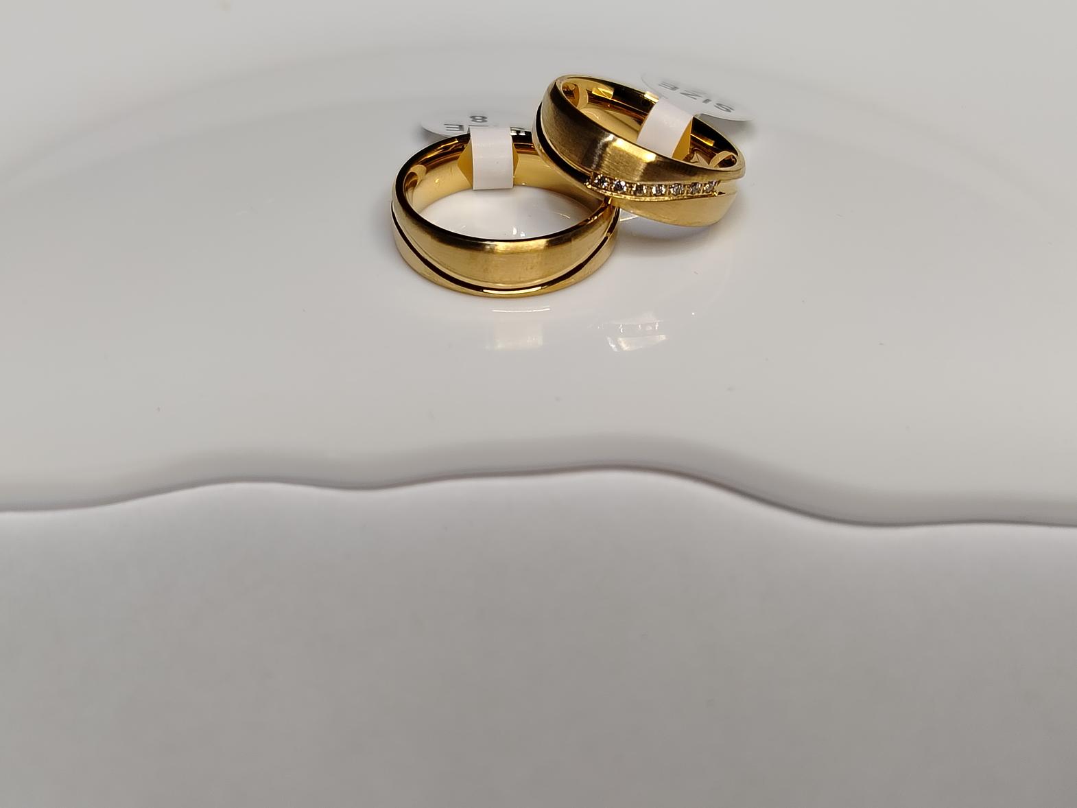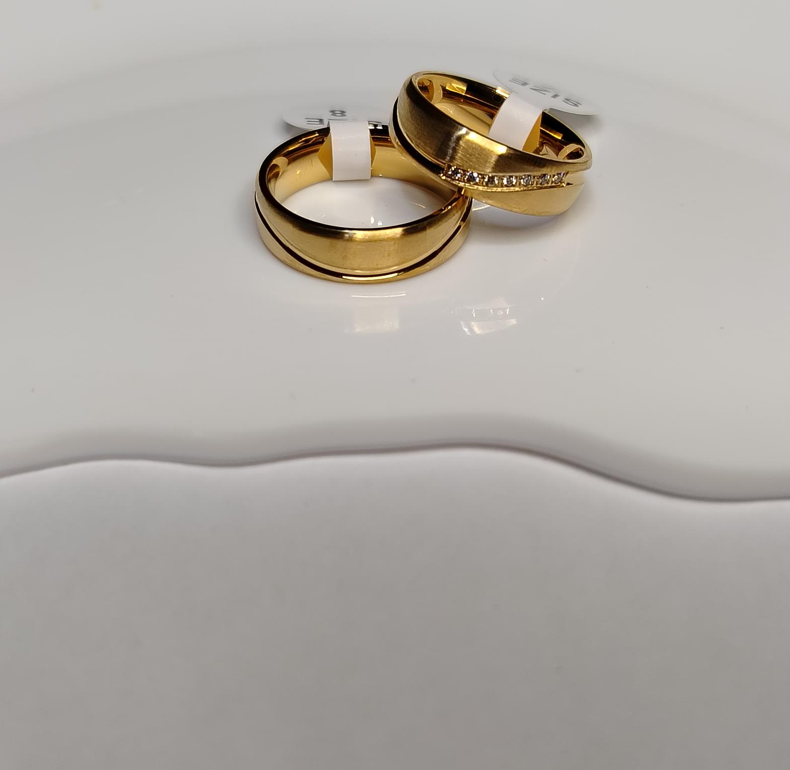 Price is for 1 ring. His and hers stainless steel gold plated wedding rings. Seal your forever with our Wedding Bands, crafted from 18k gold-plated stainless steel and personally engraved with your names and dates. Presented in a luxurious red velvet ring box, these rings are a timeless symbol of your unique love story, designed to last a lifetime.