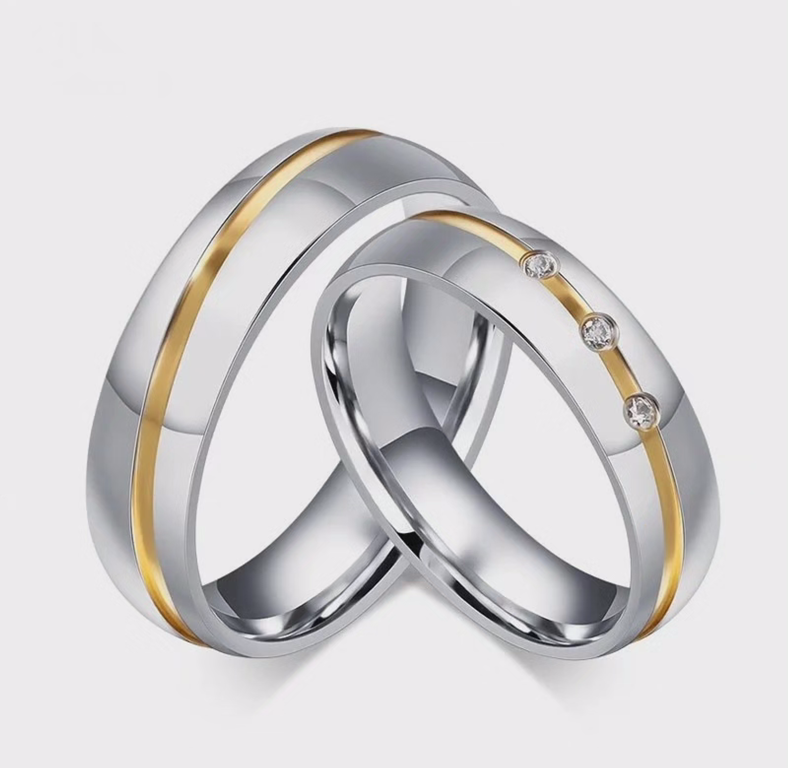 Price is for 1 ring. Unite elegance and strength with our Stainless Steel Silver Plated Wedding Band featuring a striking gold strip, perfect for celebrating your love.