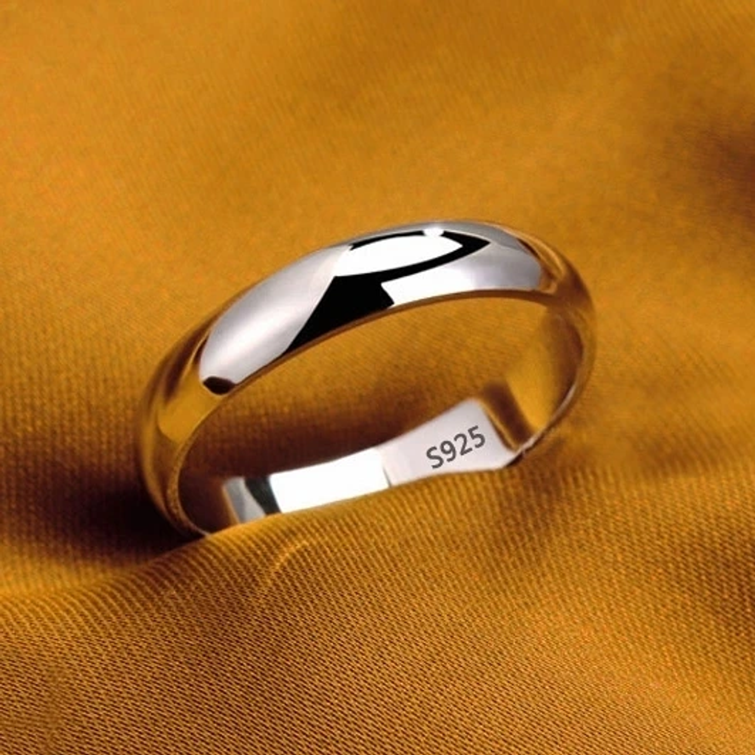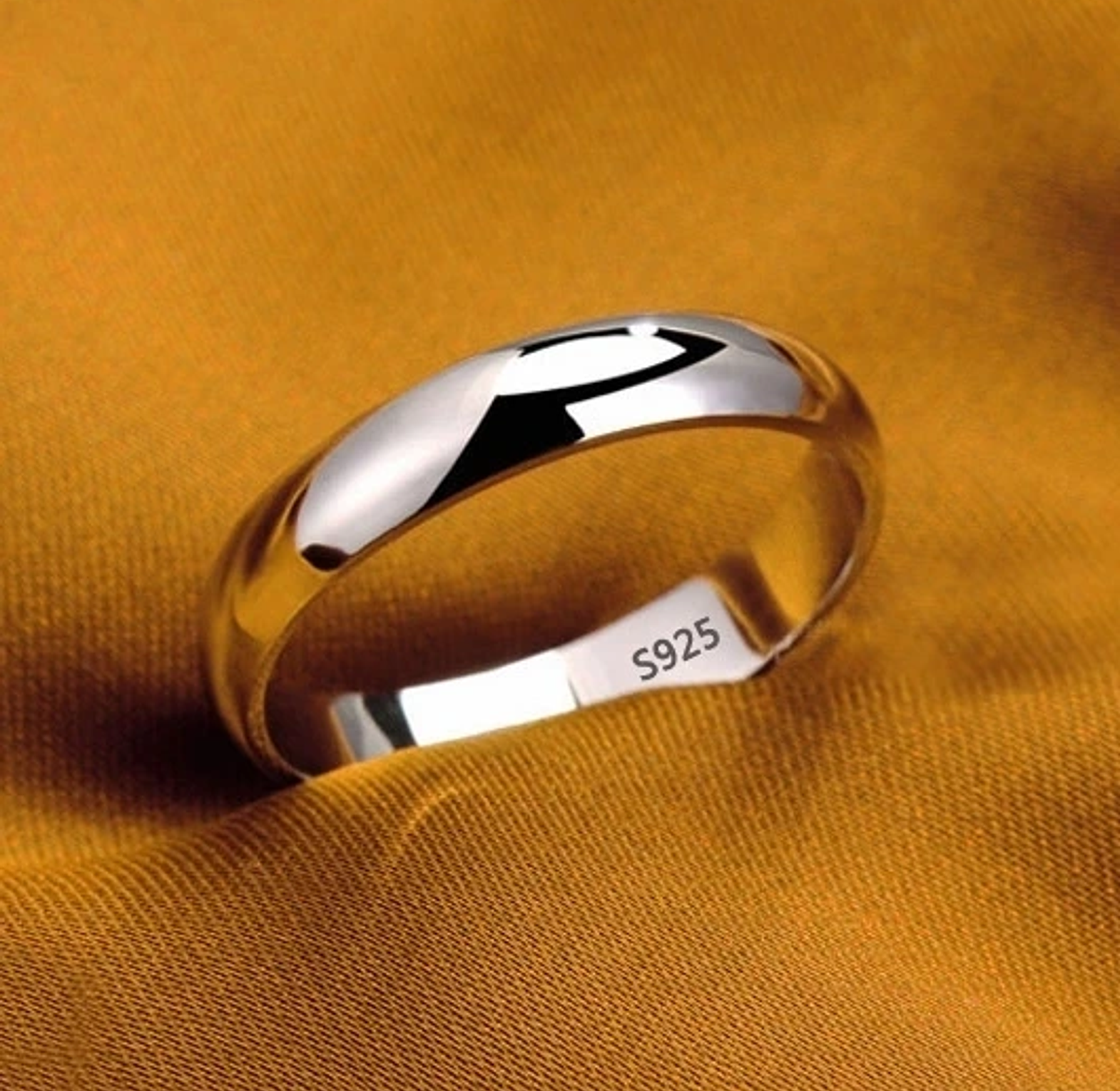 A traditional sterling silver wedding ring with a perfectly polished finish.