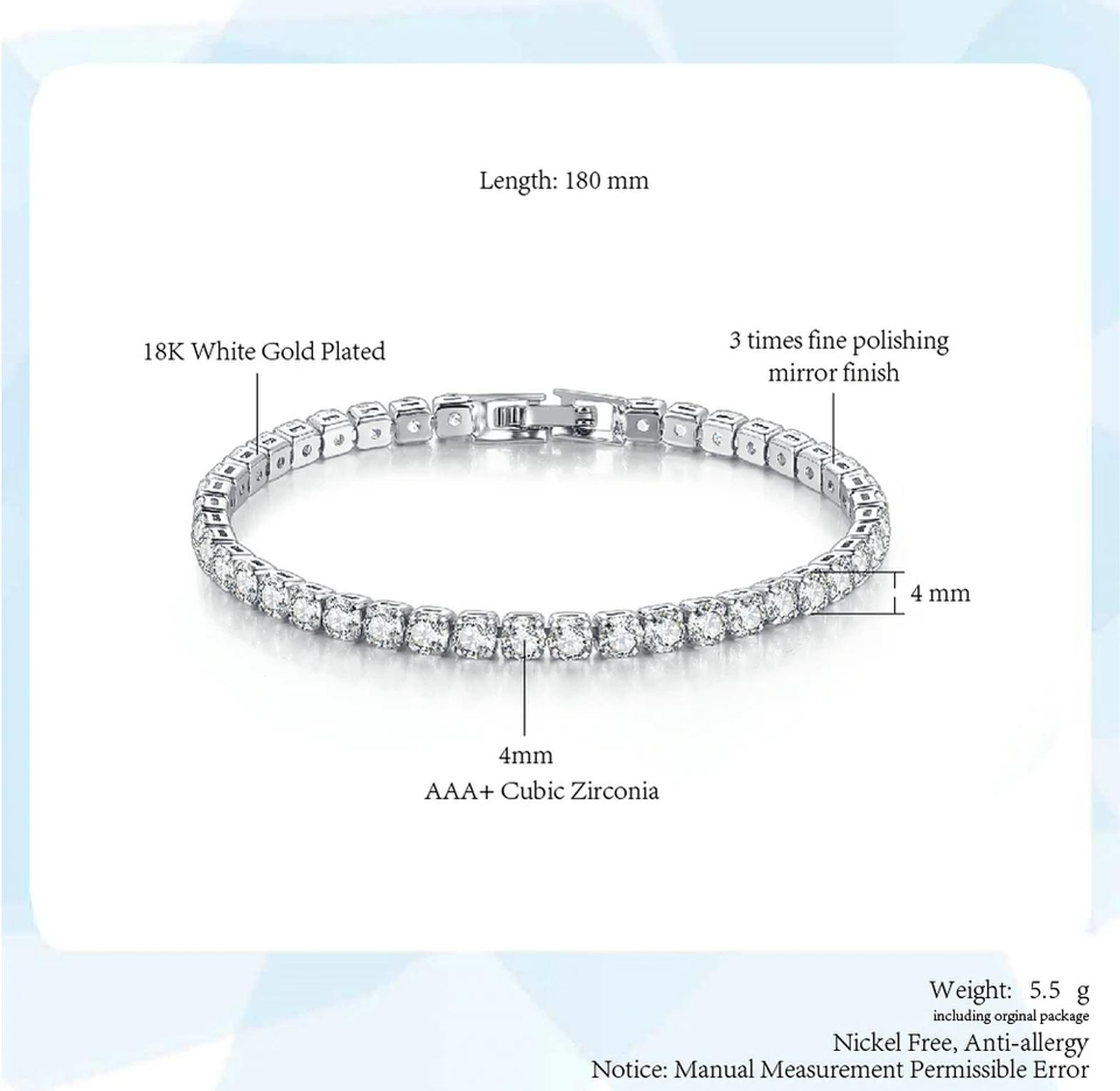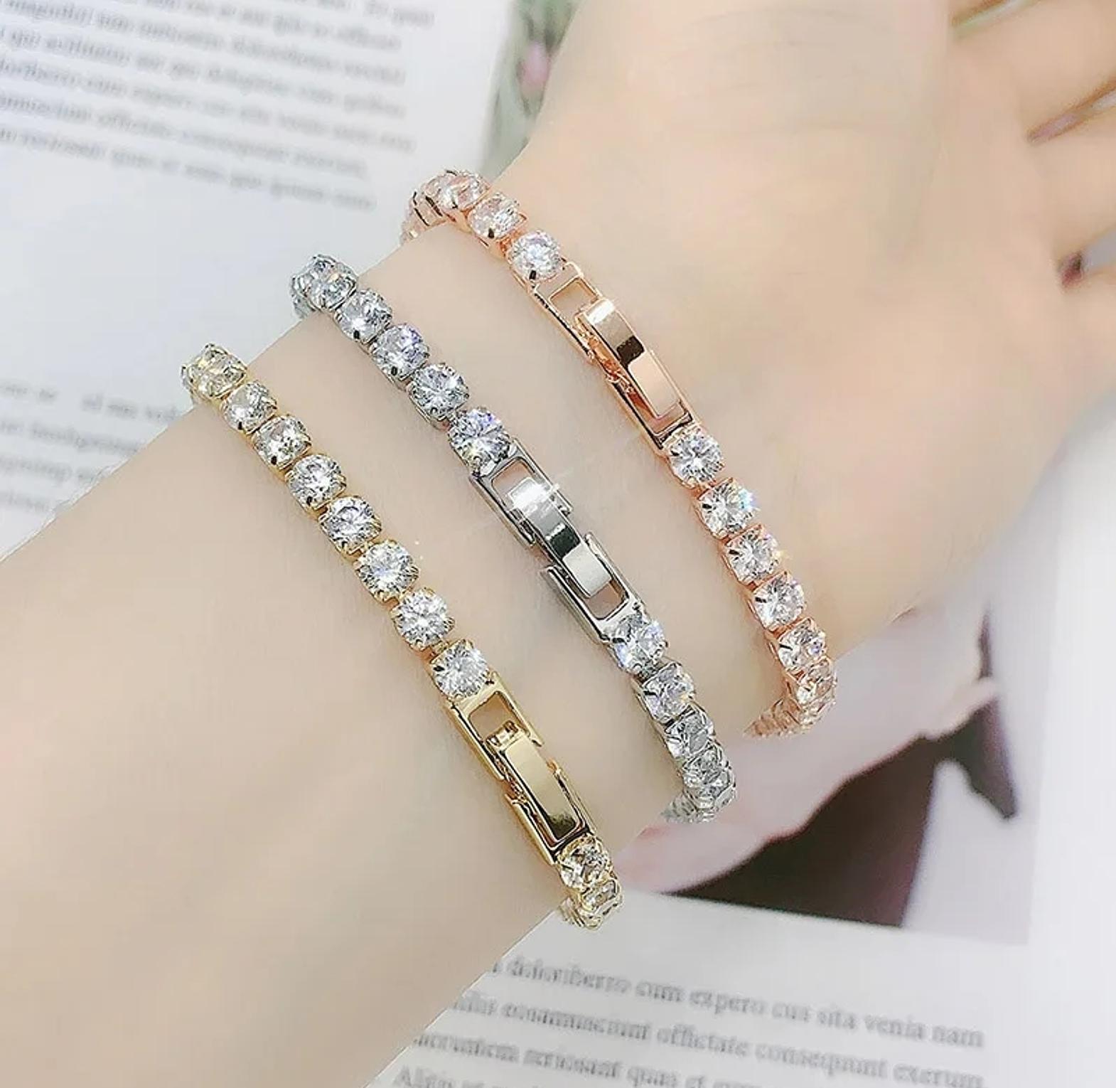 The tennis bracelet is a timeless piece of jewelry known for its understated elegance and continuous line of shimmering stones, often associated with both luxury and refinement. This particular design features a flawless row of cubic zirconia or simulated diamonds, each securely set in a polished metal chain—typically stainless steel, sterling silver, or gold-plated alloy—offering brilliance that rivals more expensive counterparts. Lightweight yet durable, it’s ideal for daily wear or adding a touch of sparkle to evening attire. The clasp is designed for both security and ease of use, ensuring the bracelet stays comfortably in place throughout the day. Whether worn alone for a minimalist statement or stacked with other bangles for a layered look, this tennis bracelet is a staple accessory that transcends trends and occasions, making it a smart and stylish addition to any jewelry collection.
