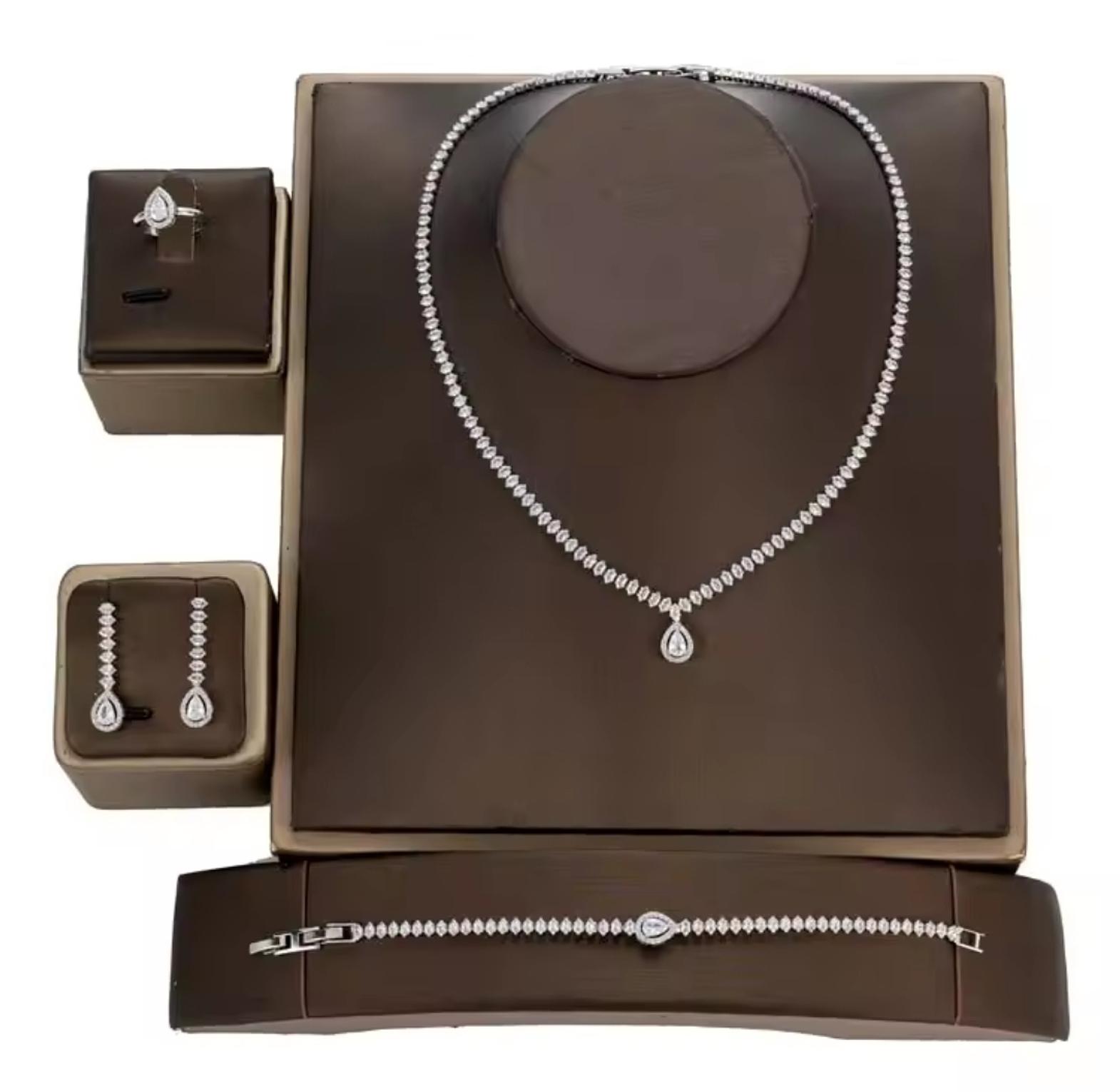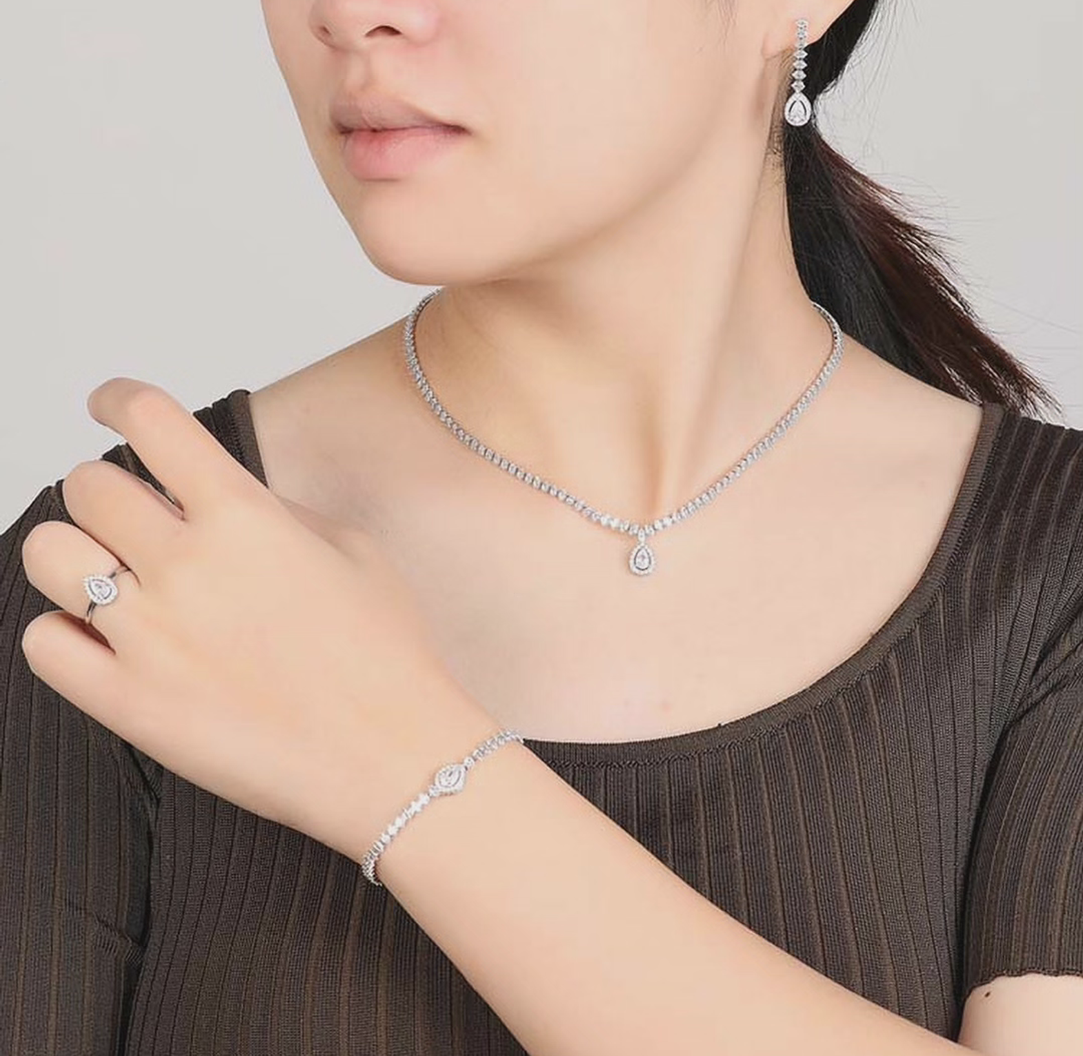 Adorn yourself in unparalleled brilliance with our radiant Bridal Set, a complete collection featuring a dazzling tennis necklace, matching earrings, a graceful bracelet, and an adjustable ring, all gleaming with exquisite Cubic Zirconia. This set promises an unforgettable sparkle for your special day.