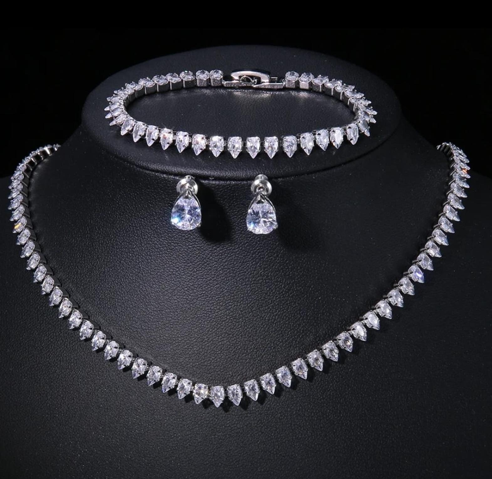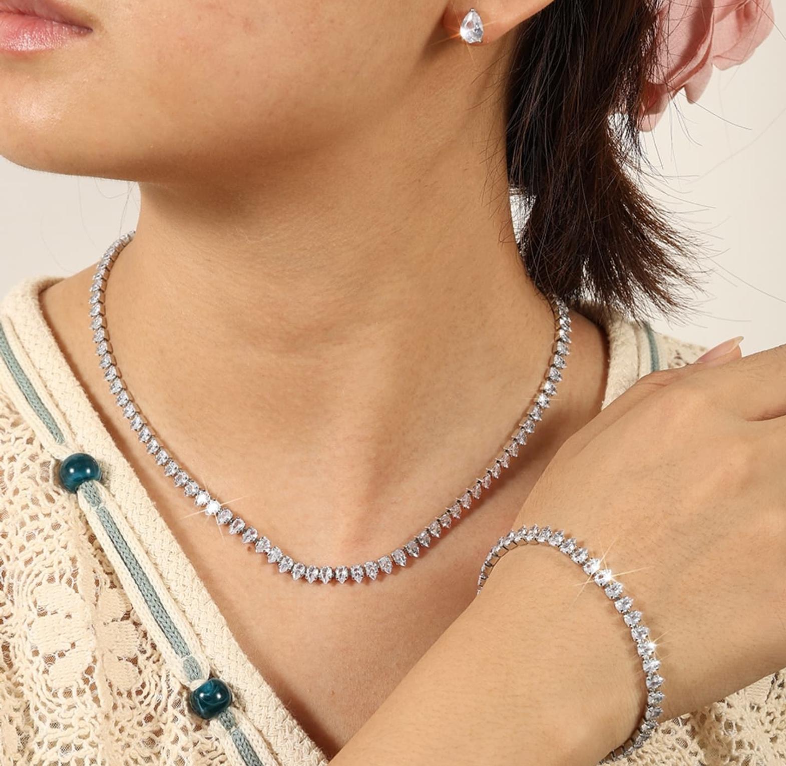 These Tennis Set is the epitome of classic glamour, designed to envelop you in continuous, magnificent sparkle. Each piece in this exquisite collection is meticulously adorned with brilliant Cubic Zirconia stones, renowned for their exceptional fire, clarity, and luminosity, precisely cut to mirror the captivating radiance of genuine diamonds. The signature "tennis" style ensures a continuous line of shimmering gems, creating a fluid and luxurious drape that catches light from every angle.