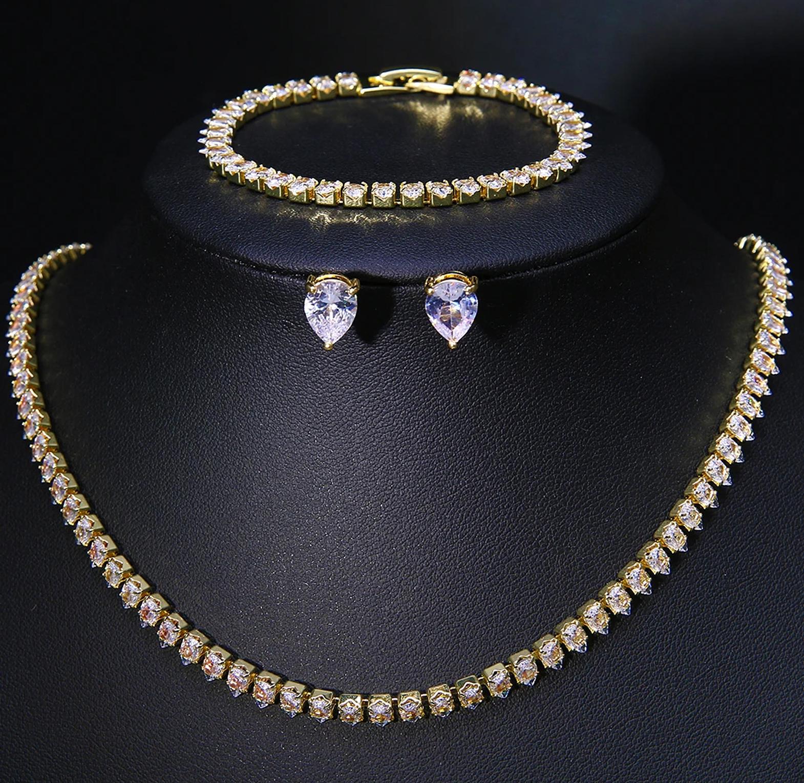 This versatile set is available in three stunning plated finishes to perfectly complement your personal style: classic silver-toned for a timeless and sophisticated gleam, opulent gold-toned for a rich, warm glow, and romantic rose gold-toned for a touch of modern femininity. While the specific base metal for plating provides durability, the high-quality plating ensures a long-lasting, brilliant finish. The Tennis Set typically includes a necklace, bracelet, and earrings, making it an ideal choice for special occasions like weddings, galas, or anniversaries, or for adding a touch of everyday luxury. It offers accessible elegance, allowing you to shine with breathtaking brilliance without compromise.