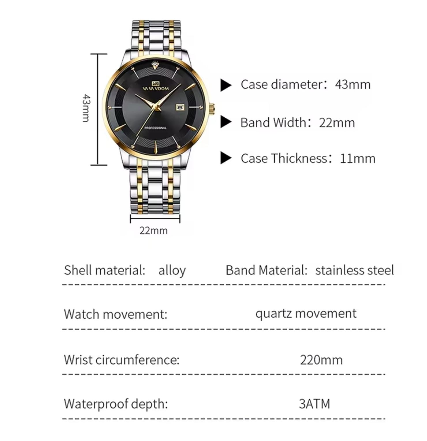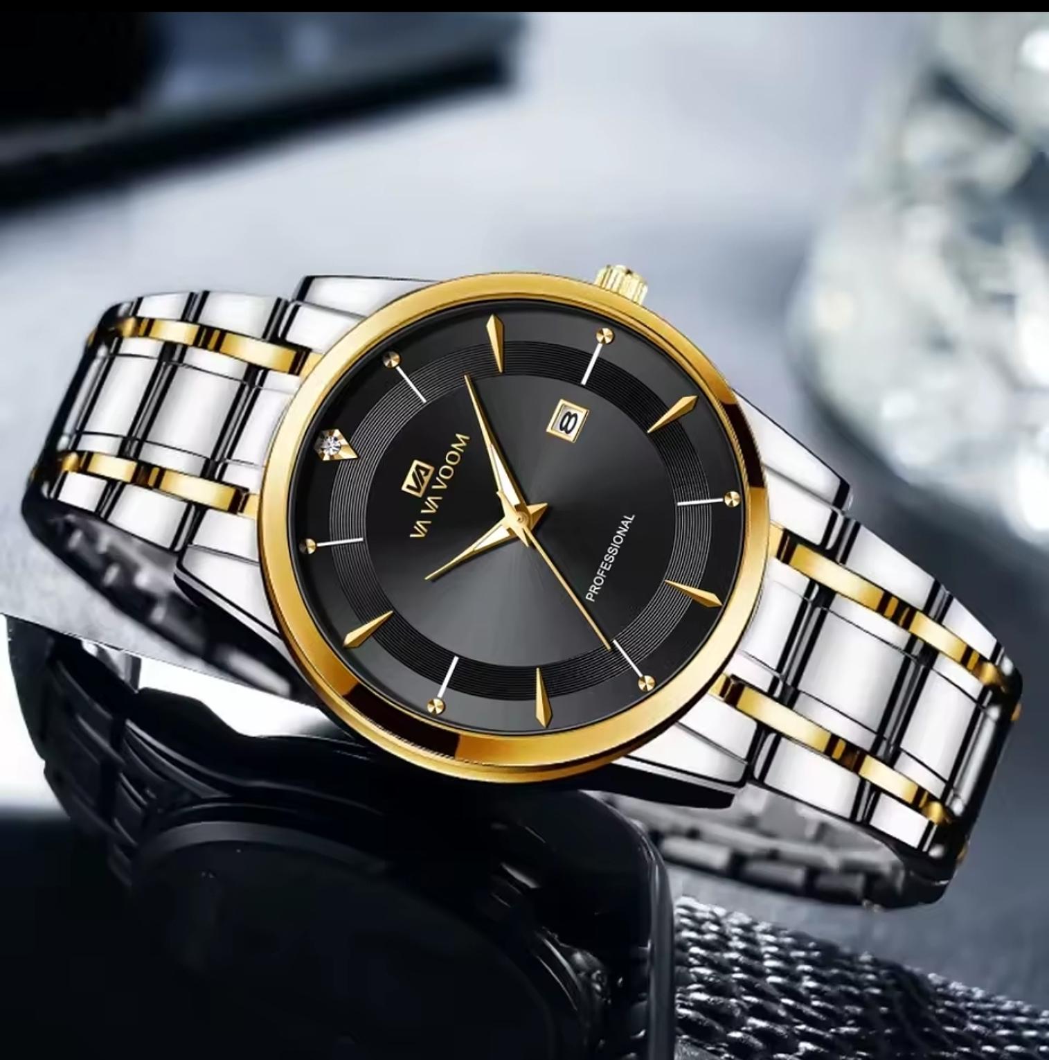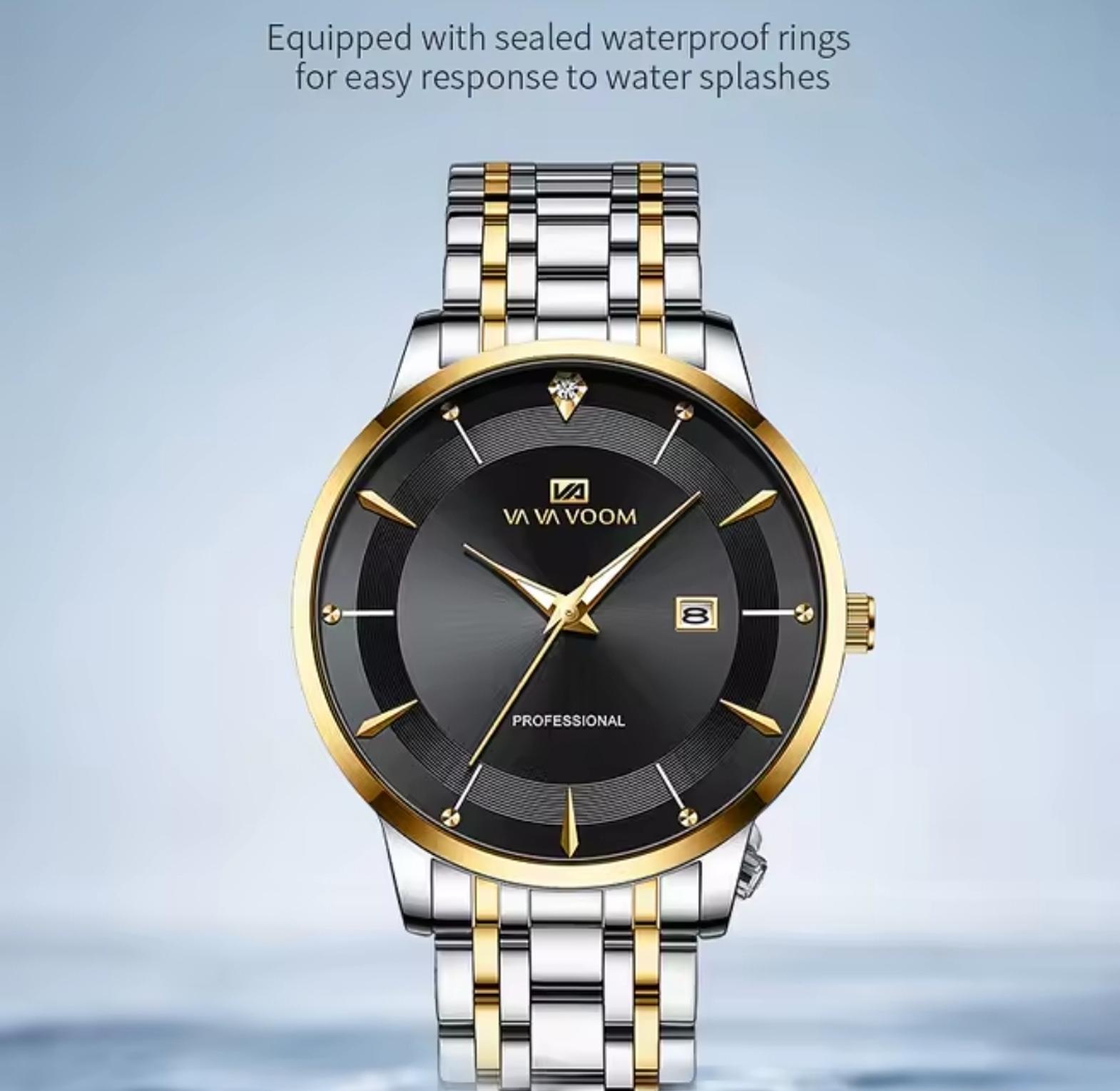 A sleek gentleman's watch for official & casual wear. Crafted with a perfect blend of black, silver and touches of gold. It is stainless steel and water resistant