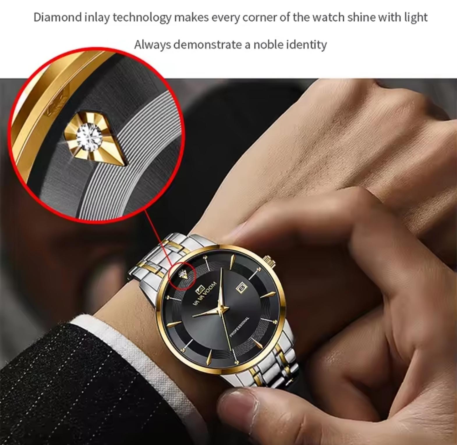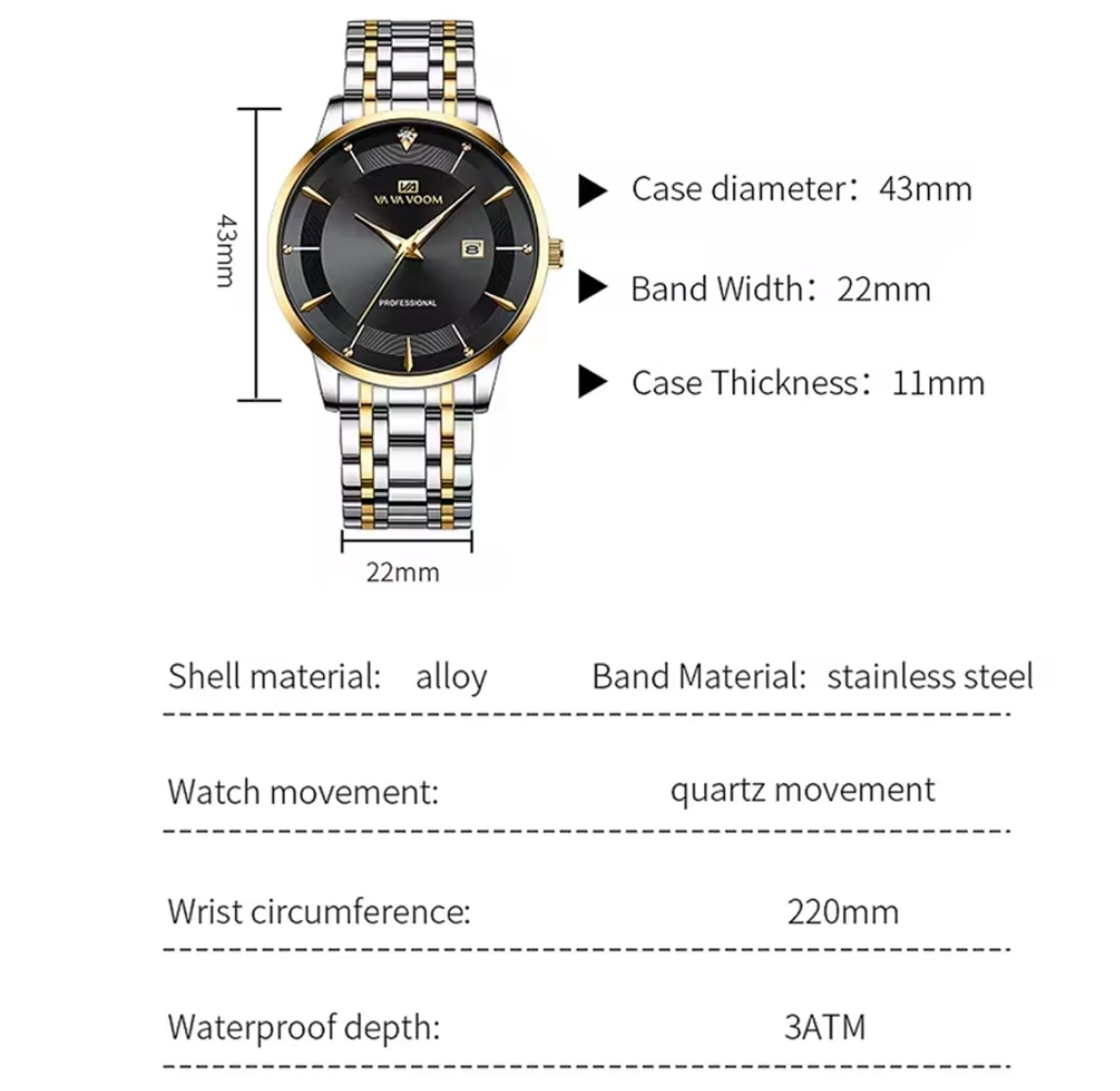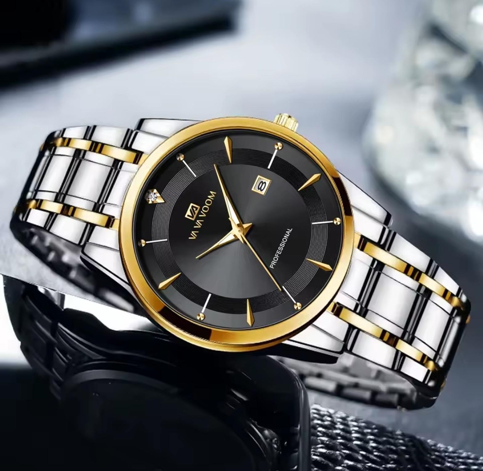 A sleek gentleman's watch for official & casual wear. Crafted with a perfect blend of black, silver and touches of gold. It is stainless steel and water resistant