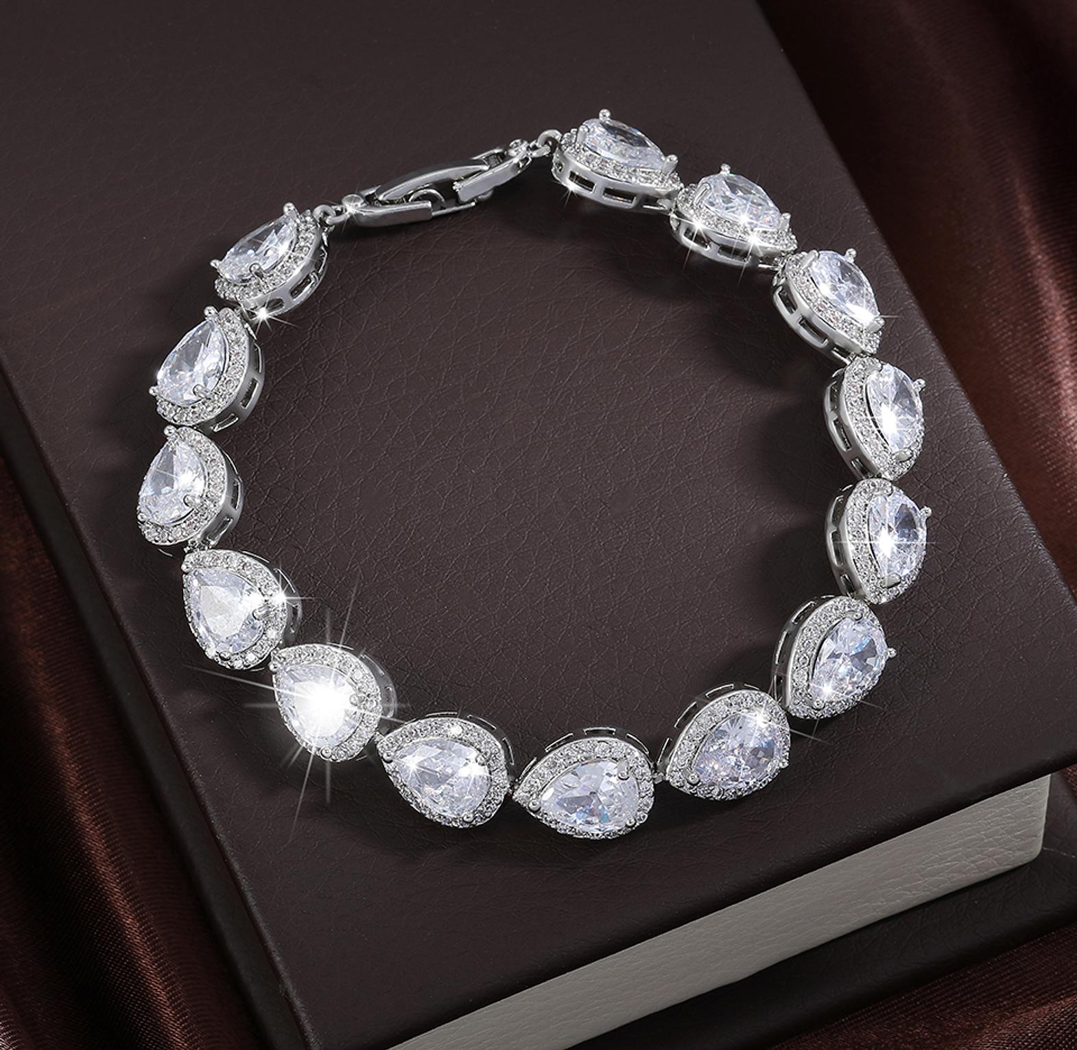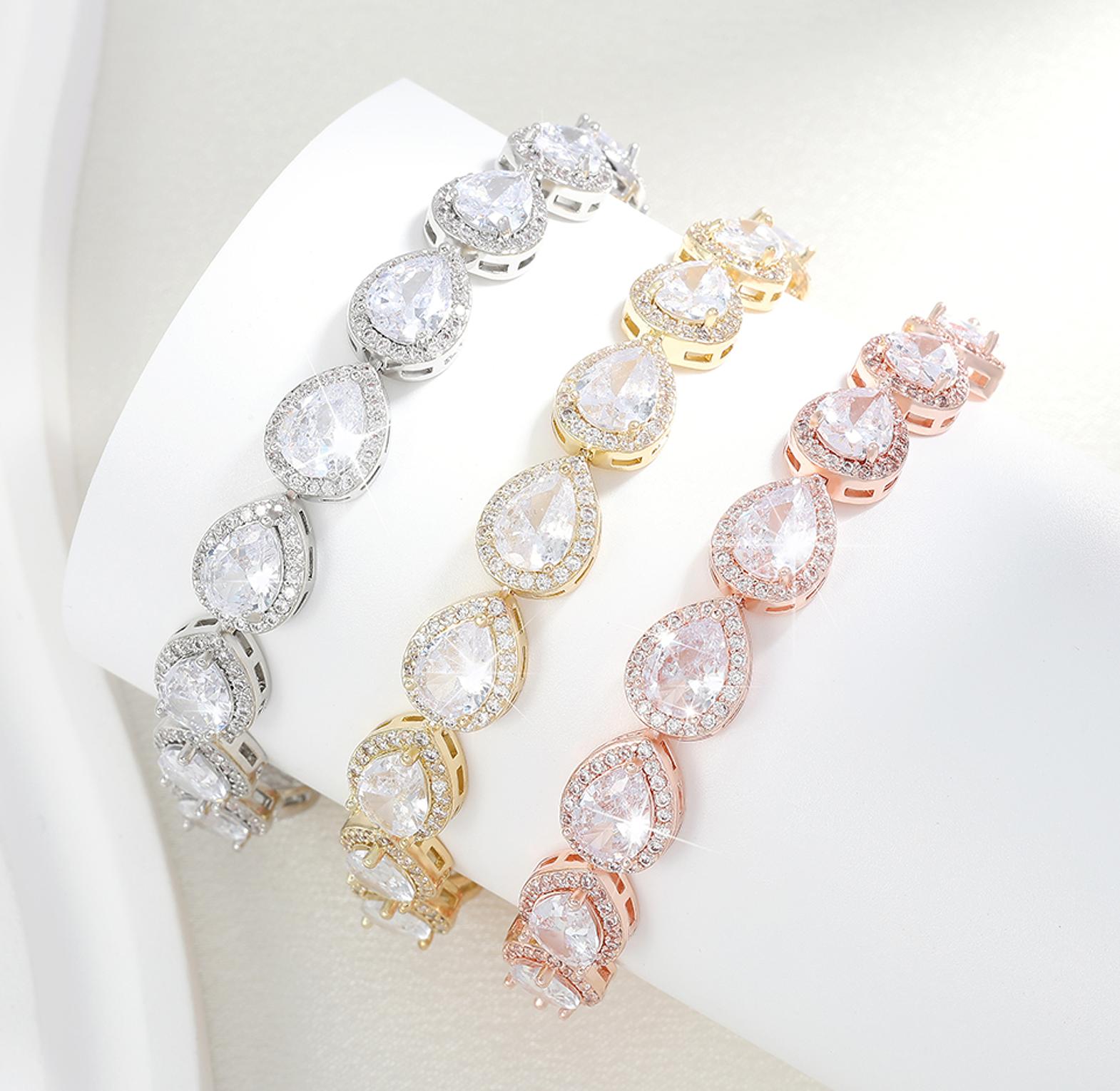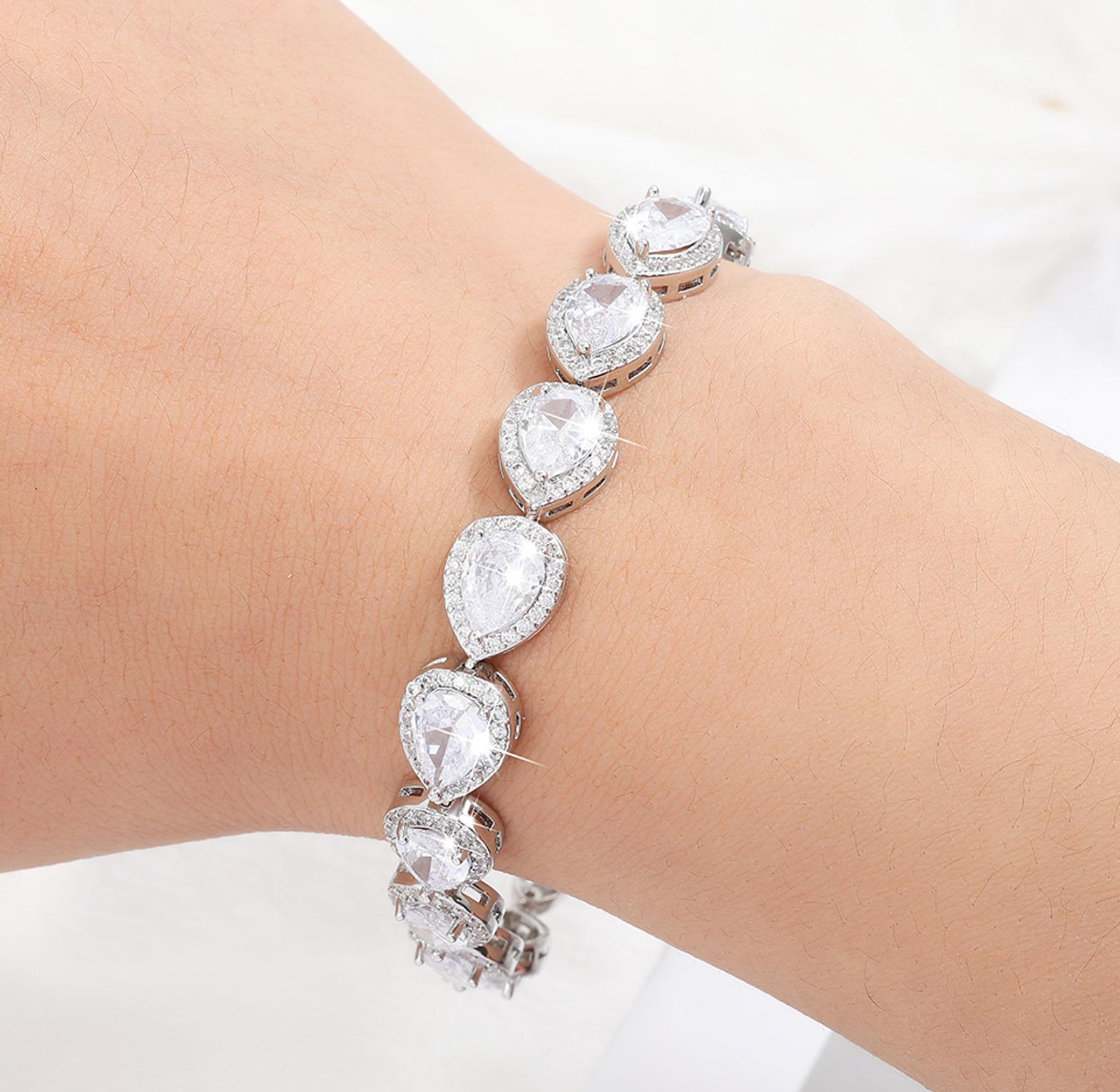 This exquisite water drop Cubic Zirconia bracelet captures the essence of elegance and sophistication, featuring delicately designed water drop-shaped stones that shimmer with brilliance. Each Cubic Zirconia stone is expertly cut to mimic the beauty of water droplets, creating a captivating effect that adds a luxurious touch to your wrist. Crafted from high-quality materials, this bracelet combines durability with a lightweight feel, making it perfect for both everyday wear and special occasions. The adjustable clasp ensures a comfortable fit, allowing you to wear it with ease throughout the day. Whether worn alone for a subtle statement or paired with other pieces for a layered look, this water drop Cubic Zirconia bracelet is a versatile addition to any jewelry collection. Ideal as a gift for a loved one or a treat for yourself, it embodies timeless beauty and charm, making it a must-have accessory for any jewelry lover