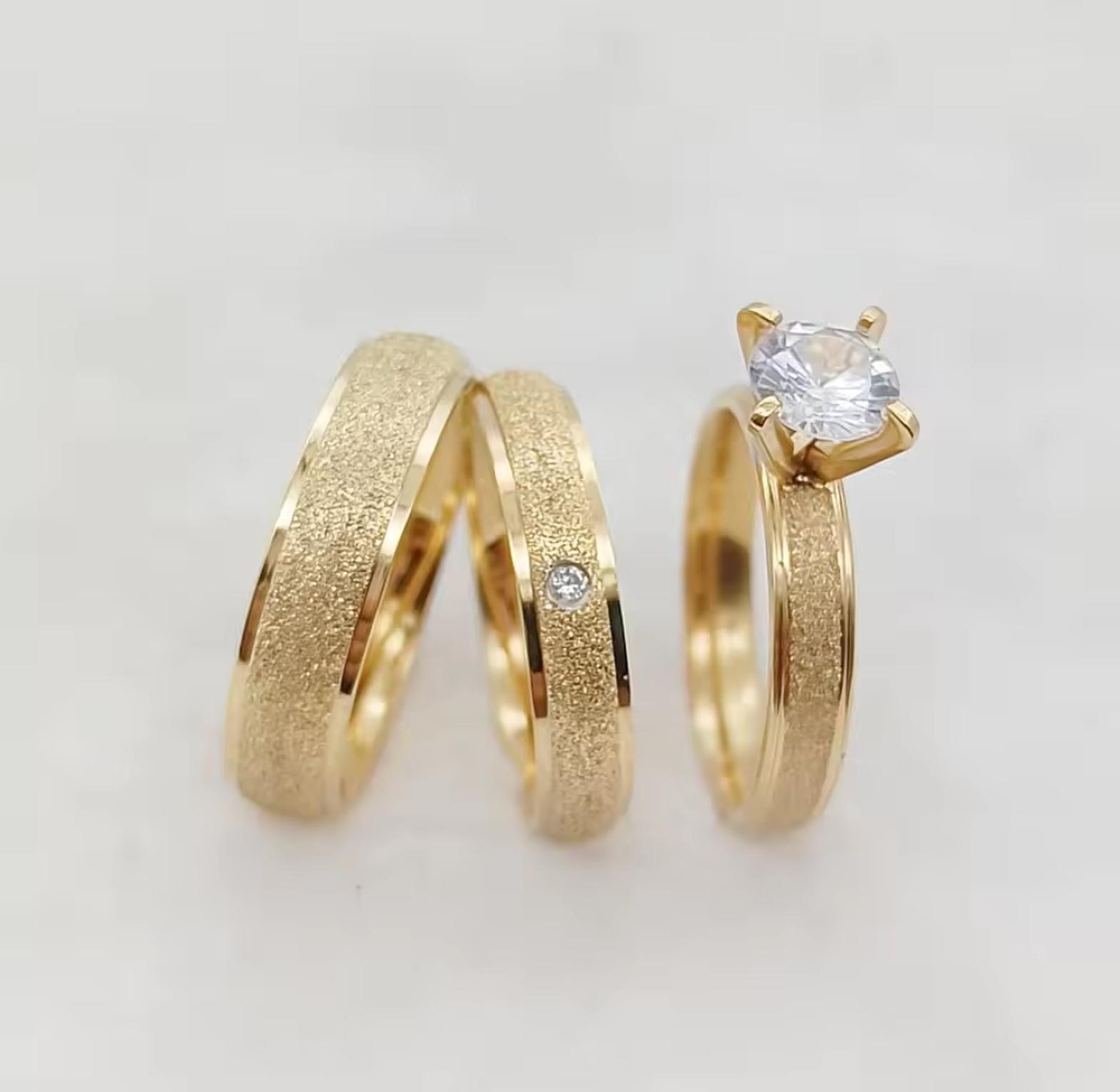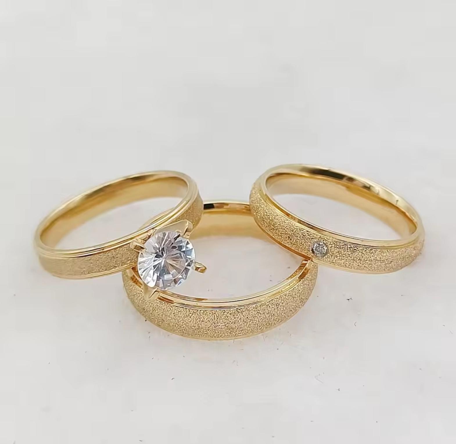 Mark your forever with these Wedding Set, a captivating pair of frosted gold-plated stainless steel rings designed for the bride and groom. Their unique matte finish offers a modern yet timeless symbol of enduring love and sophisticated unity.