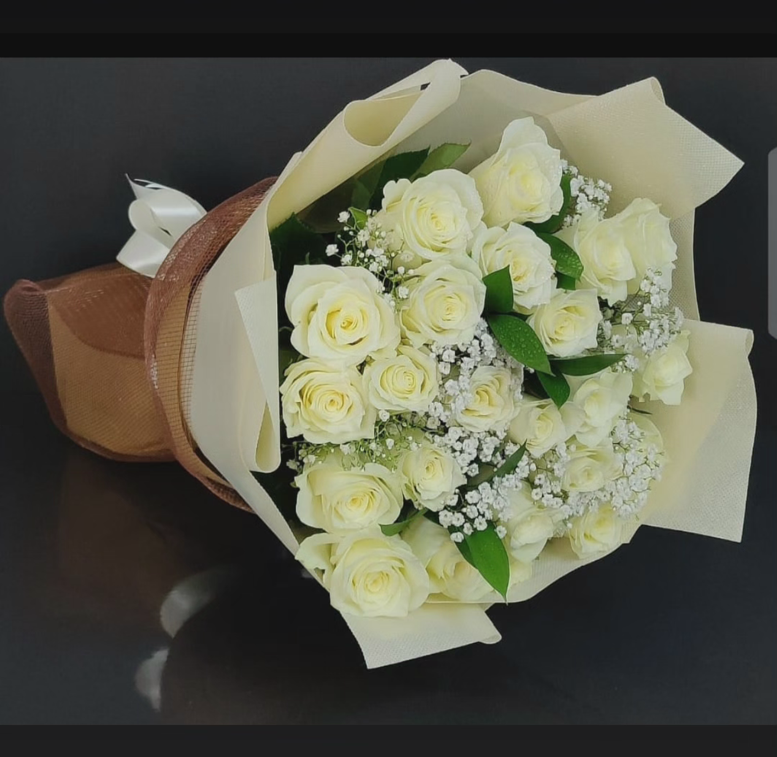 A timeless classic, this elegant bouquet features a stunning collection of pure white roses, symbolizing purity, new beginnings, and reverence. Perfect for conveying heartfelt sentiments with grace and sophistication.