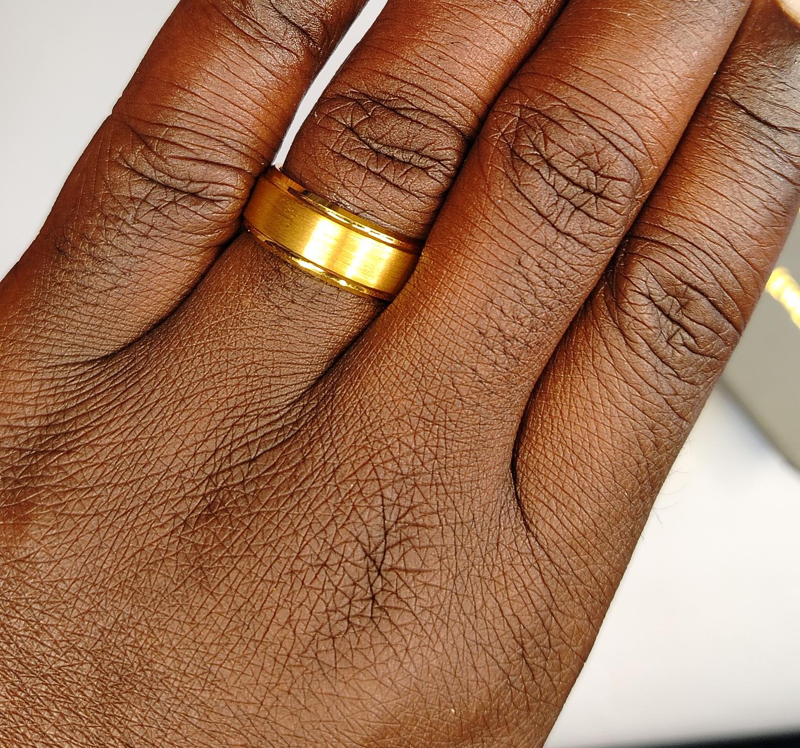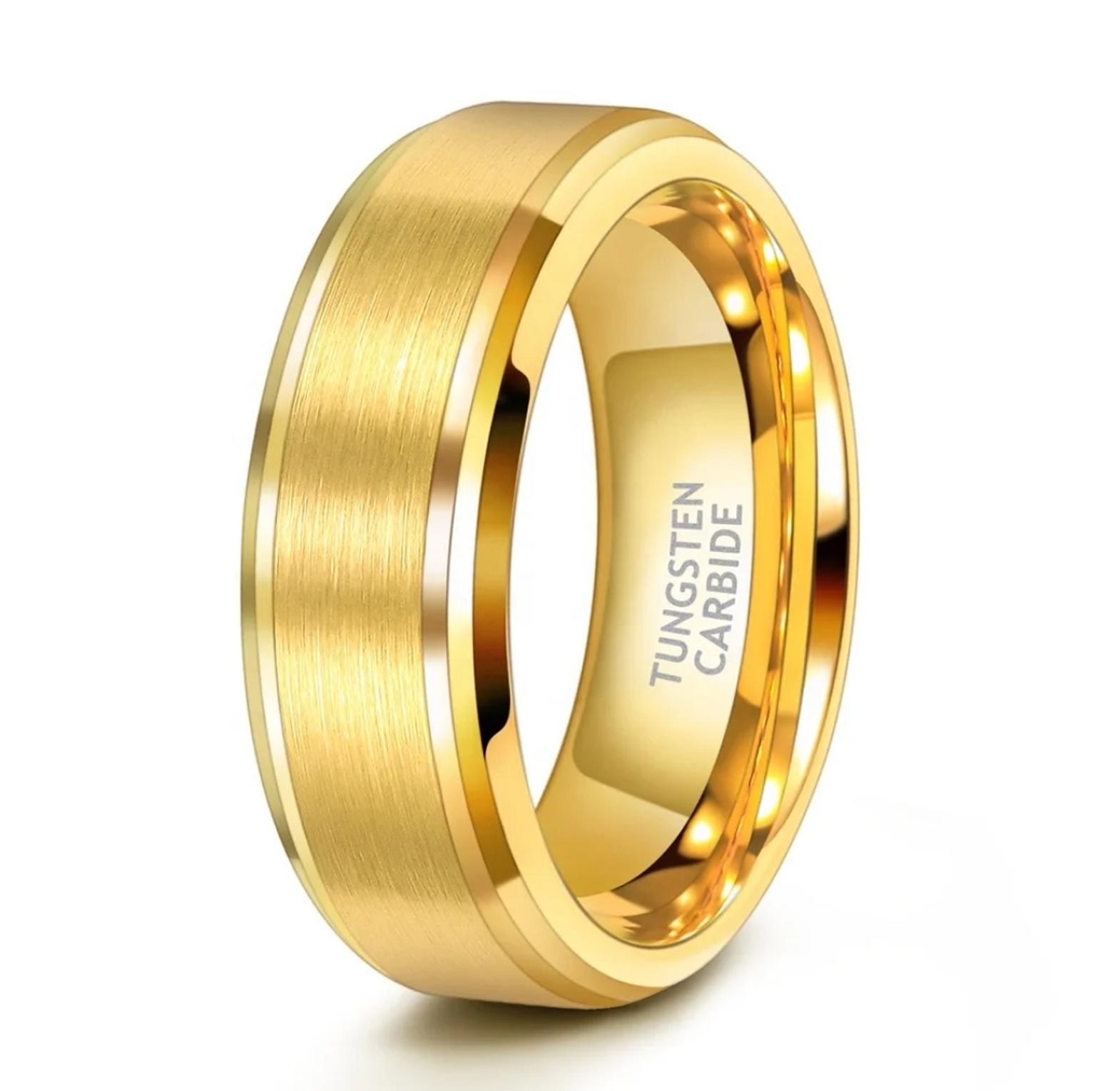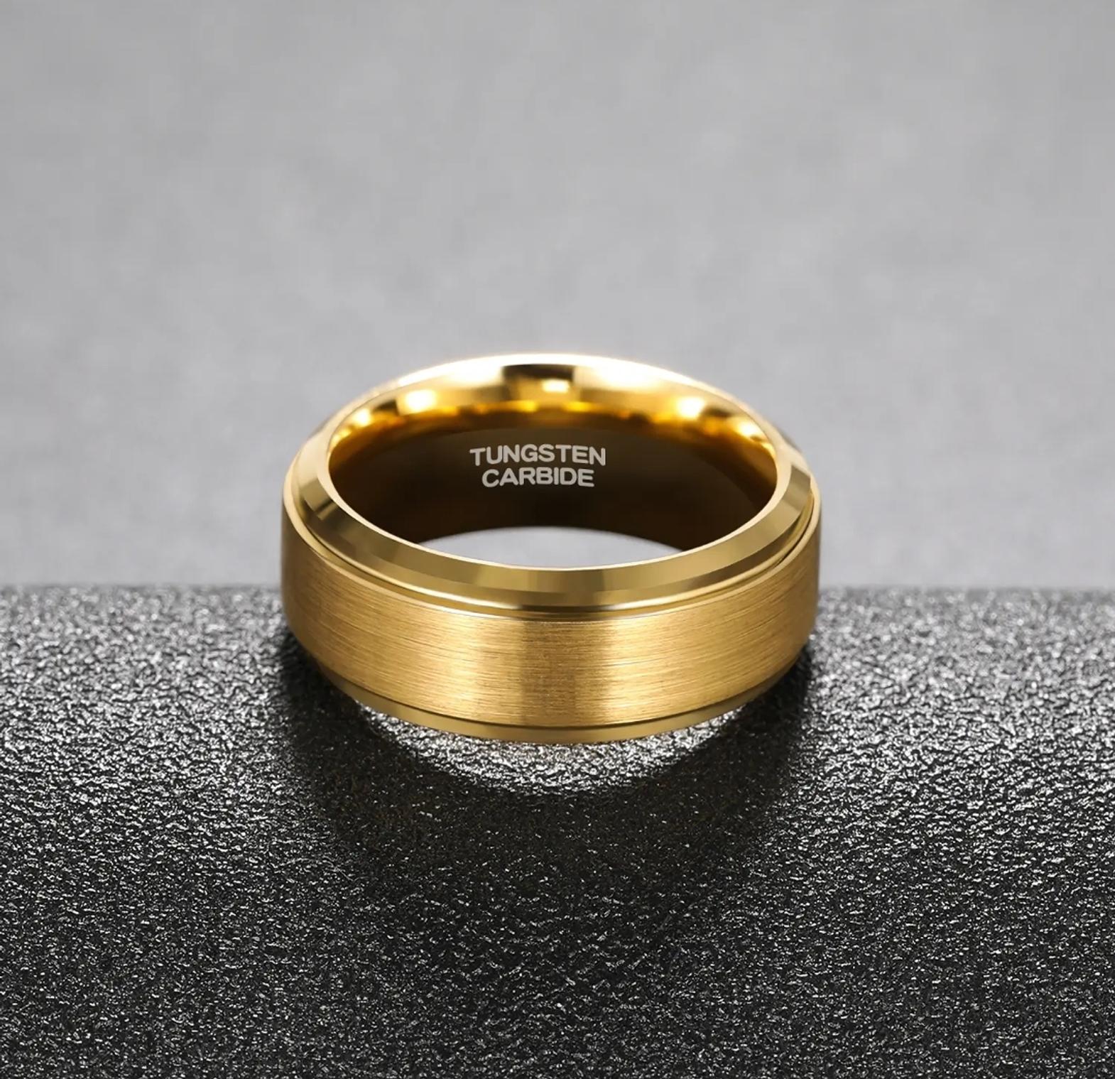 This Tungsten Carbide ring is sleek. It's finish is a textured brush gold plated finish, giving it a unique appearance. Tungsten is anti scratch so this ring will last.