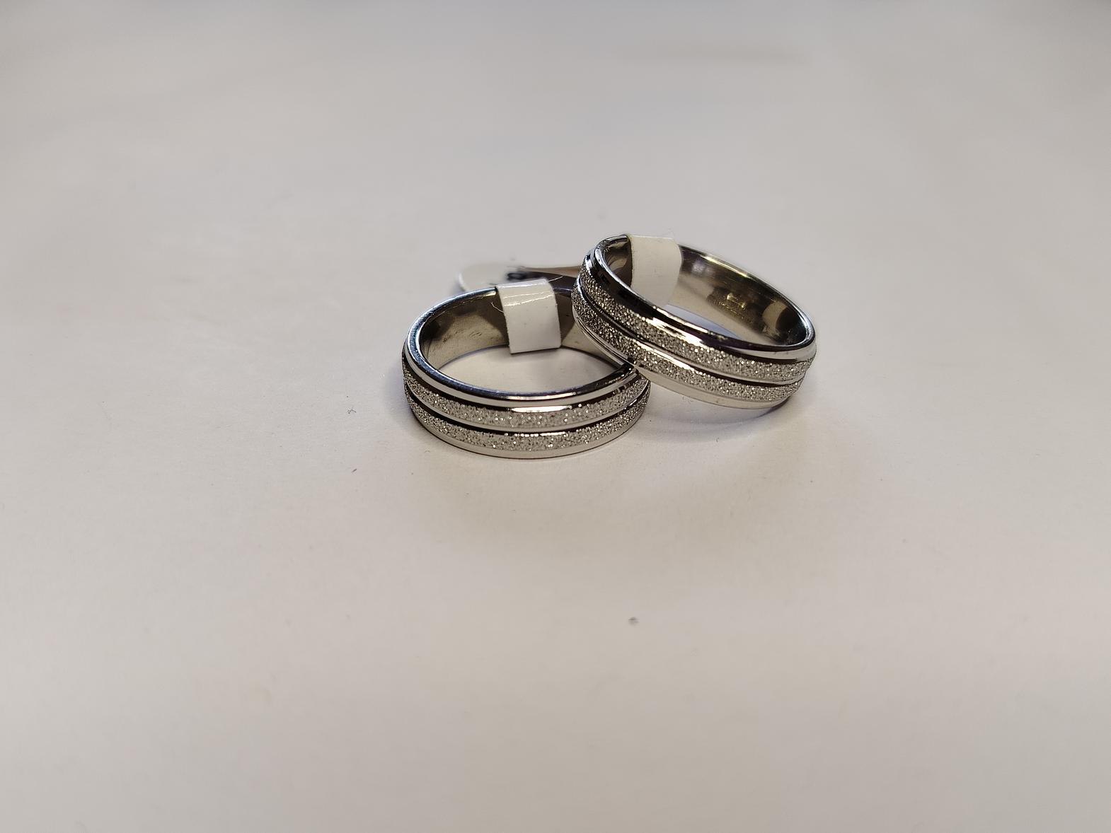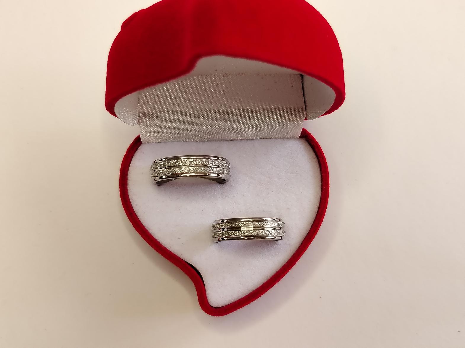 Polished Stainless steel frosted wedding rings. We engrave names and dates.