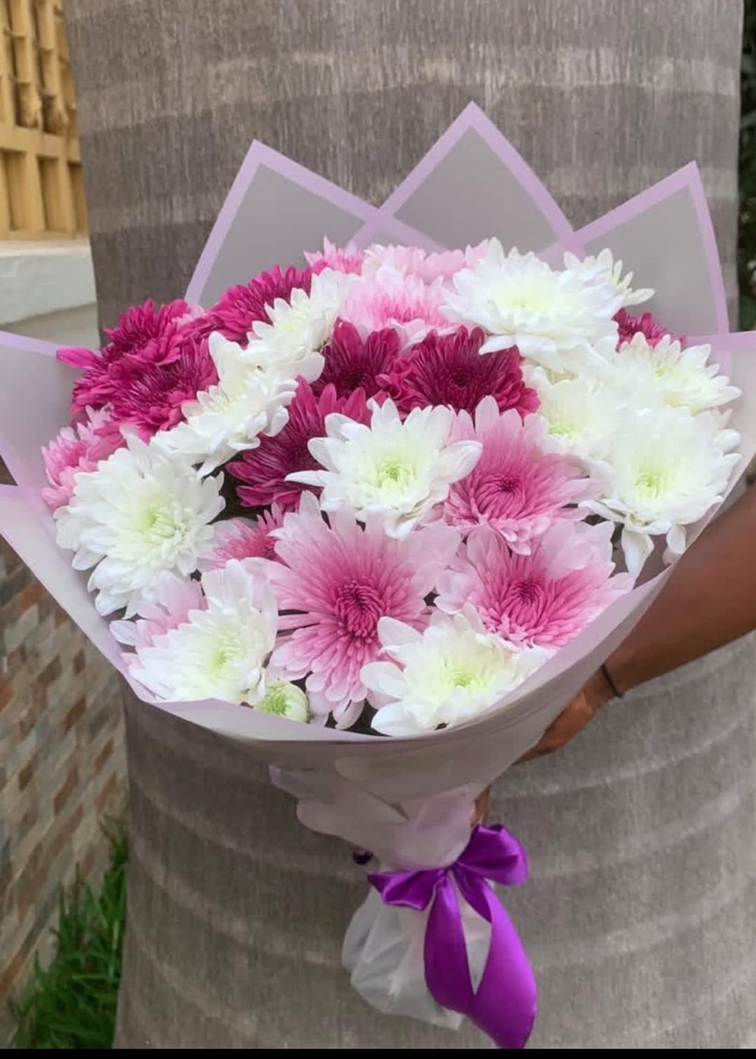 Chrysanthemums instantly brighten your day. Cheer someone up with this purple, pink and white mums bouquet