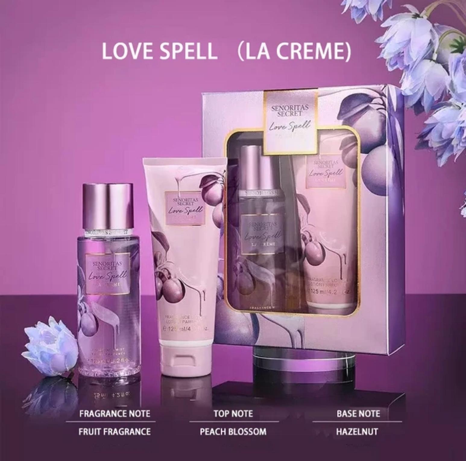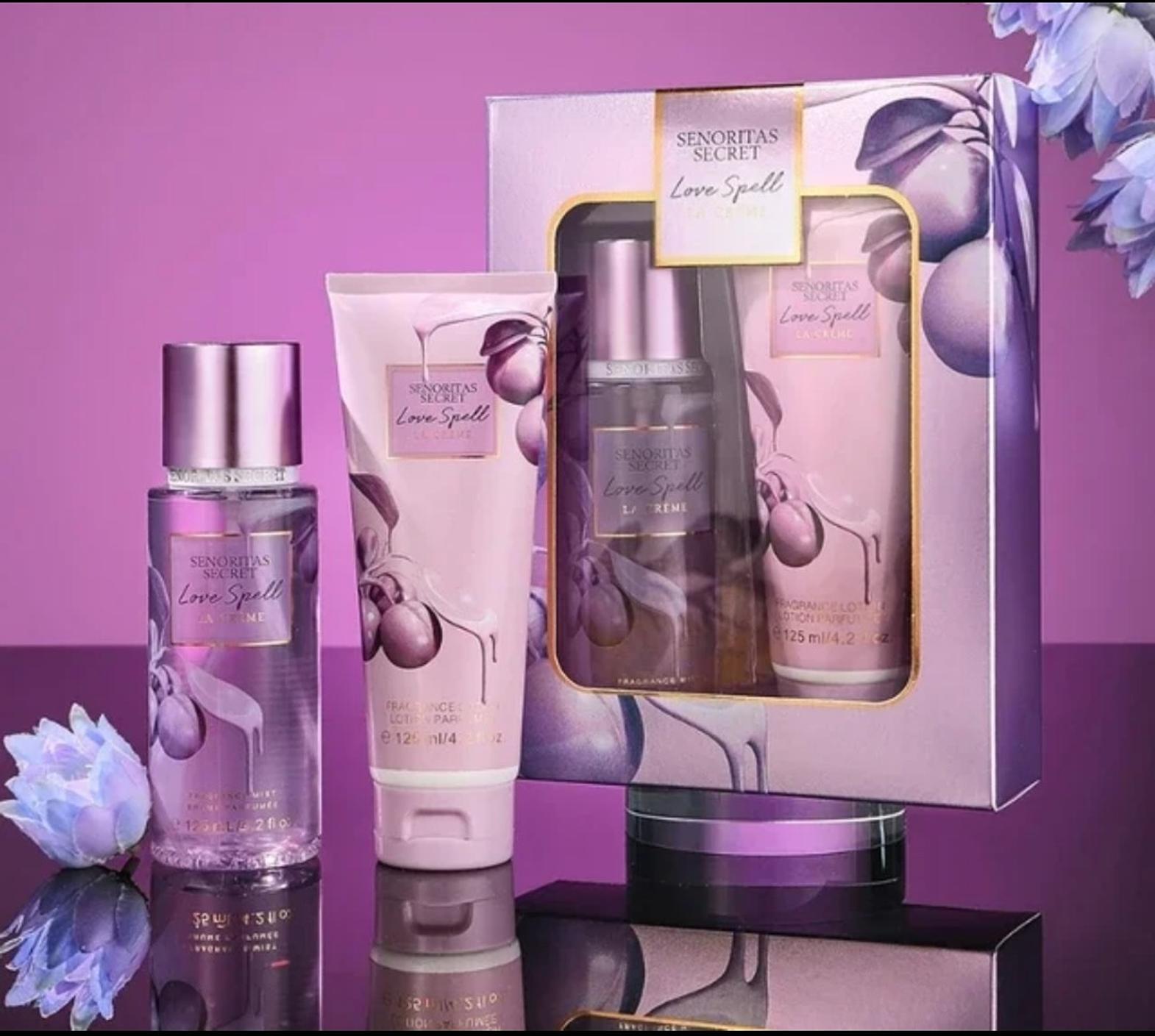 Perfume Gift Set with 125ml Perfume Lotion and 125ml Perfume Body Mist. A fruity fragrance with notes of peach blossom and hazelnut. It's a lovely non irritating and lasting scent. Comes packed as a gift.