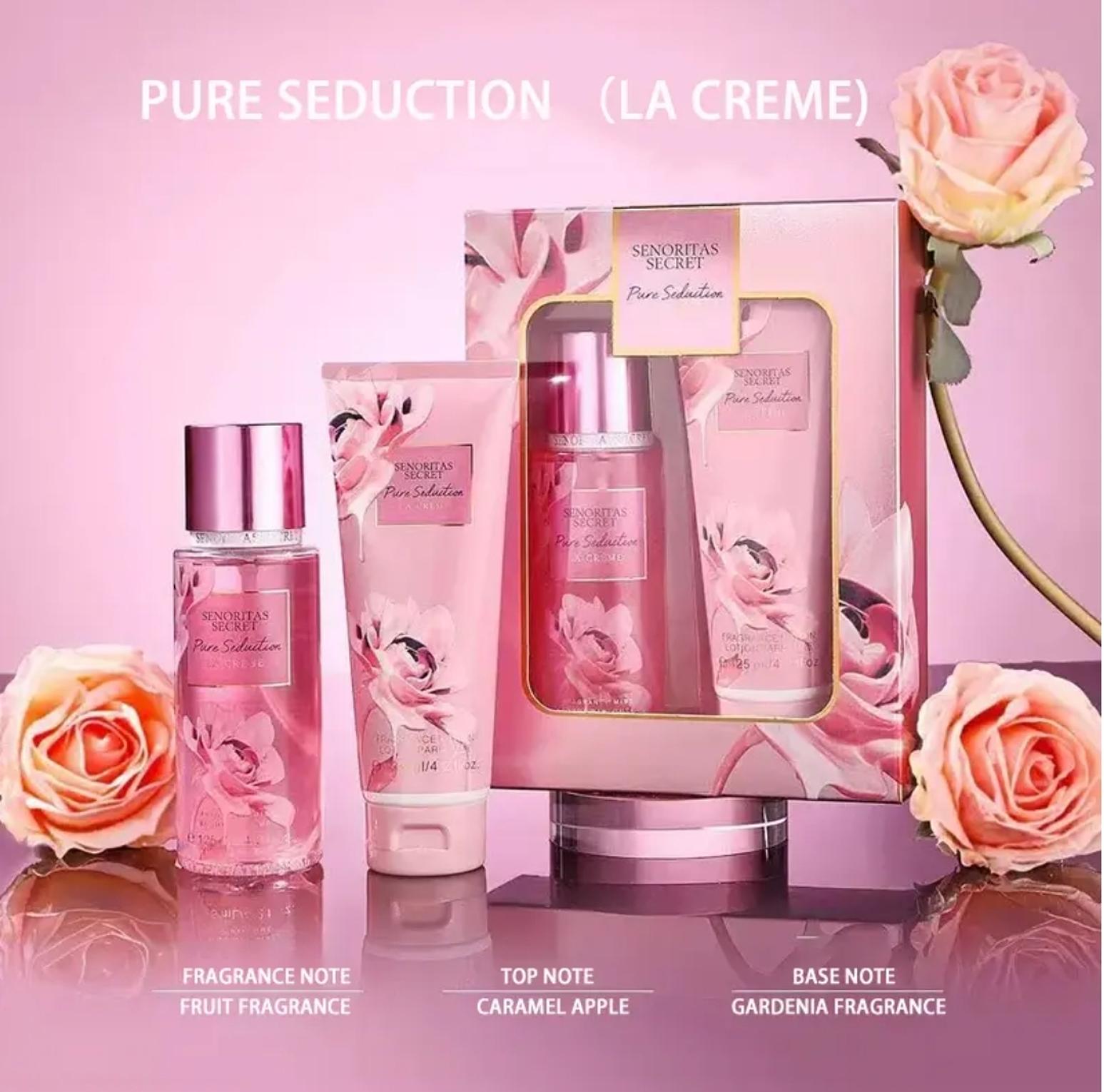 This heavenly perfume box contains 125ml Perfume Body Mist and 125ml Perfume Lotion. It's packed in a beautiful box making it perfect for gifting. It's a fruity fragrance with notes of caramel apple and gardenia.