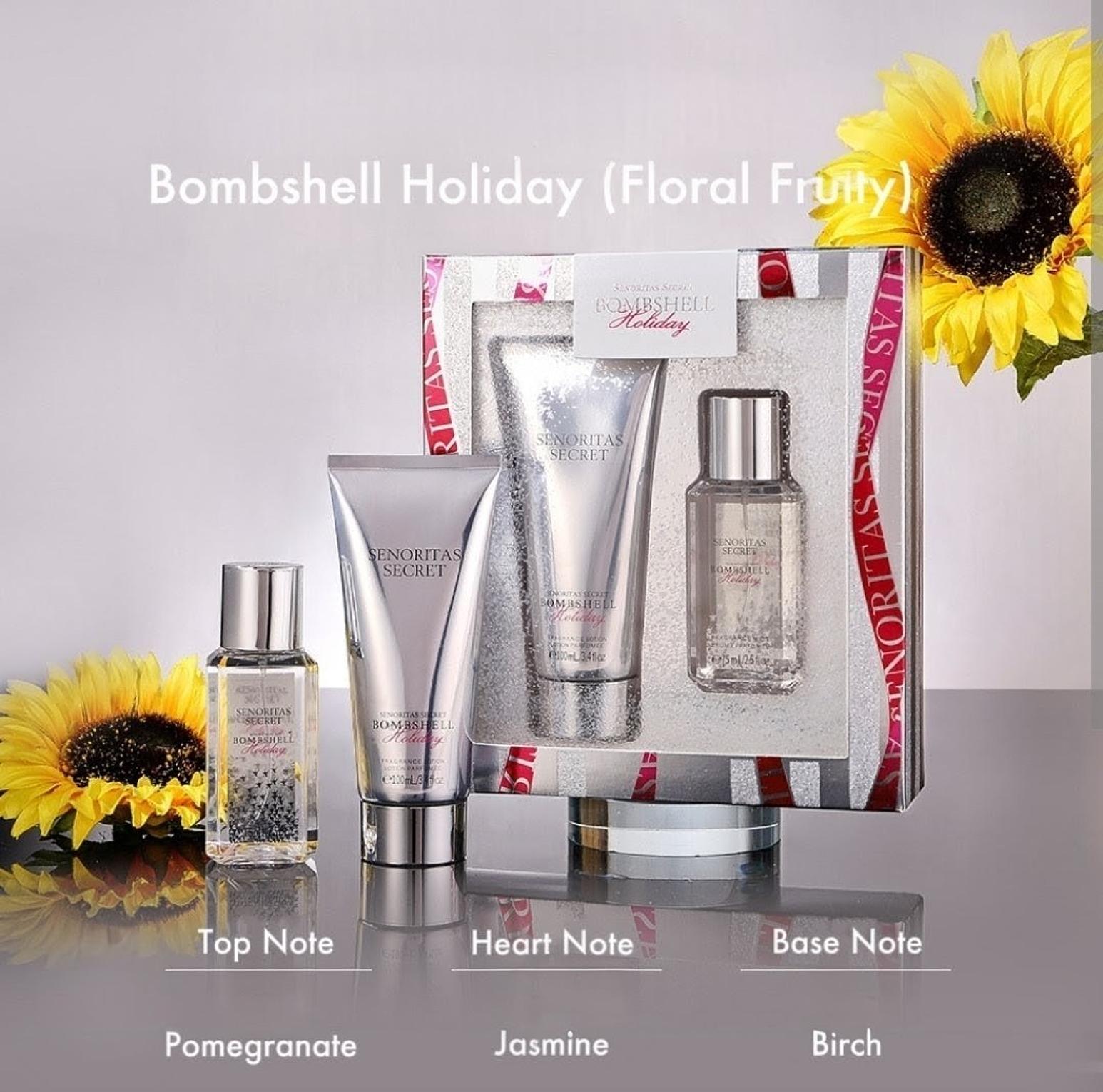 Senoritas Secret Bombshell Holiday is a floral fruity scent with notes of pomegranate, jasmine and birch. The birch adds a little woody twist to the scent making it unique. This luxury scent can be worn all day, every day. The fragrance lasts all day. The package contains 100ml of fragrance lotion and 75ml perfume bottle. Already packed as a gift in a silver box. Perfect for graduation, congratulations, bridal shower, thank you, anniversary, apology, just because, surprise gifting.