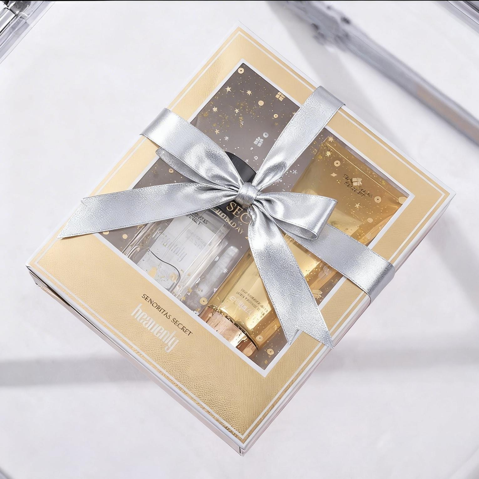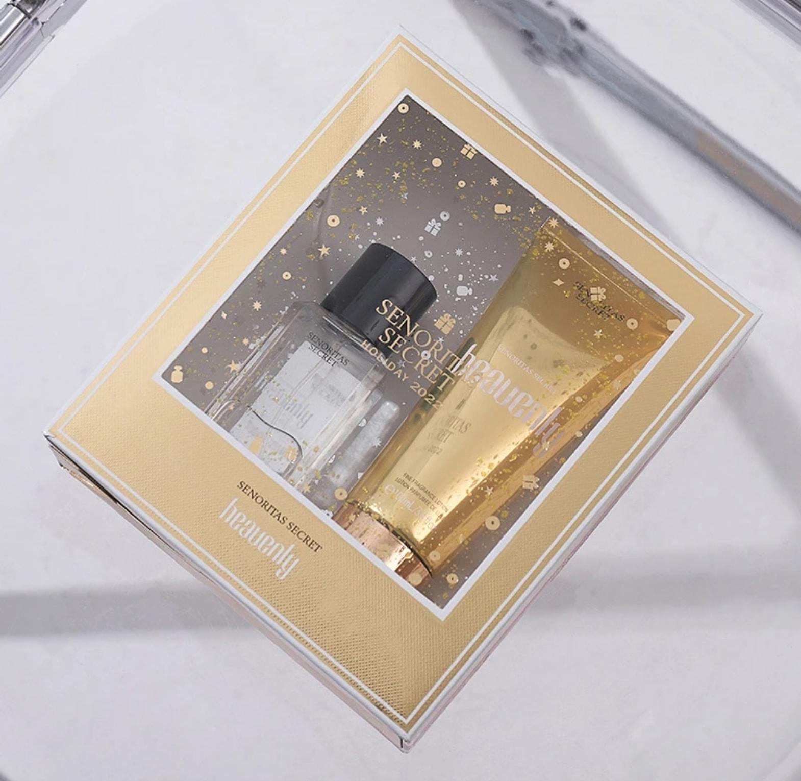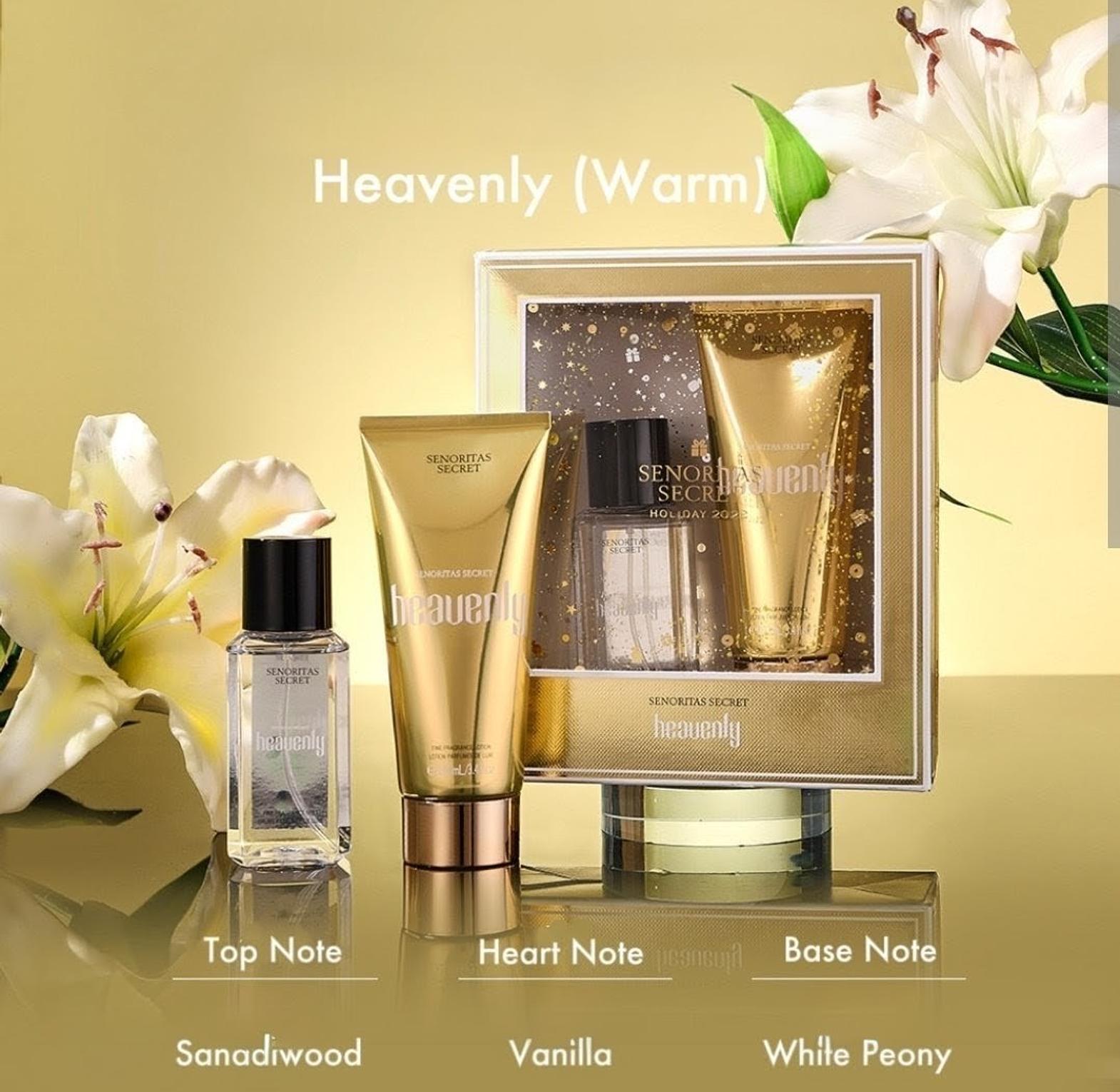 Senoritas Secret Heavenly Perfume Gift Set contains 100ml Fragrance Lotion & 75ml Perfume Body Mist. It's a warm scent with notes of Sandalwood, vanilla & Peony. This combination makes it a unique scent. It's elegant, long lasting and great for daily wear. It comes in a lustrous gold box, making it a perfect gift for any occasion - anniversary, graduation, congratulations, bridal shower, thank you, just because, surprise gift