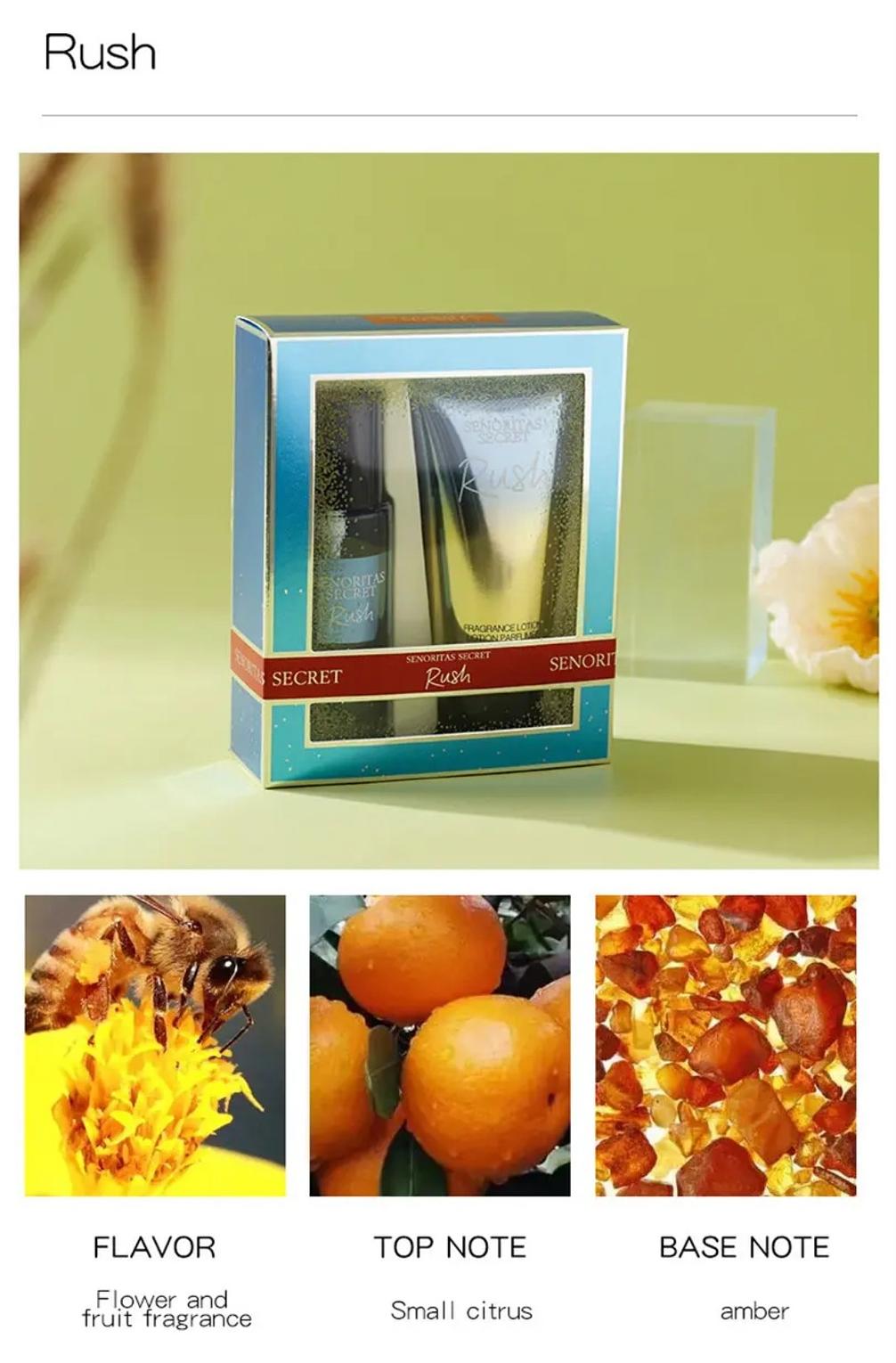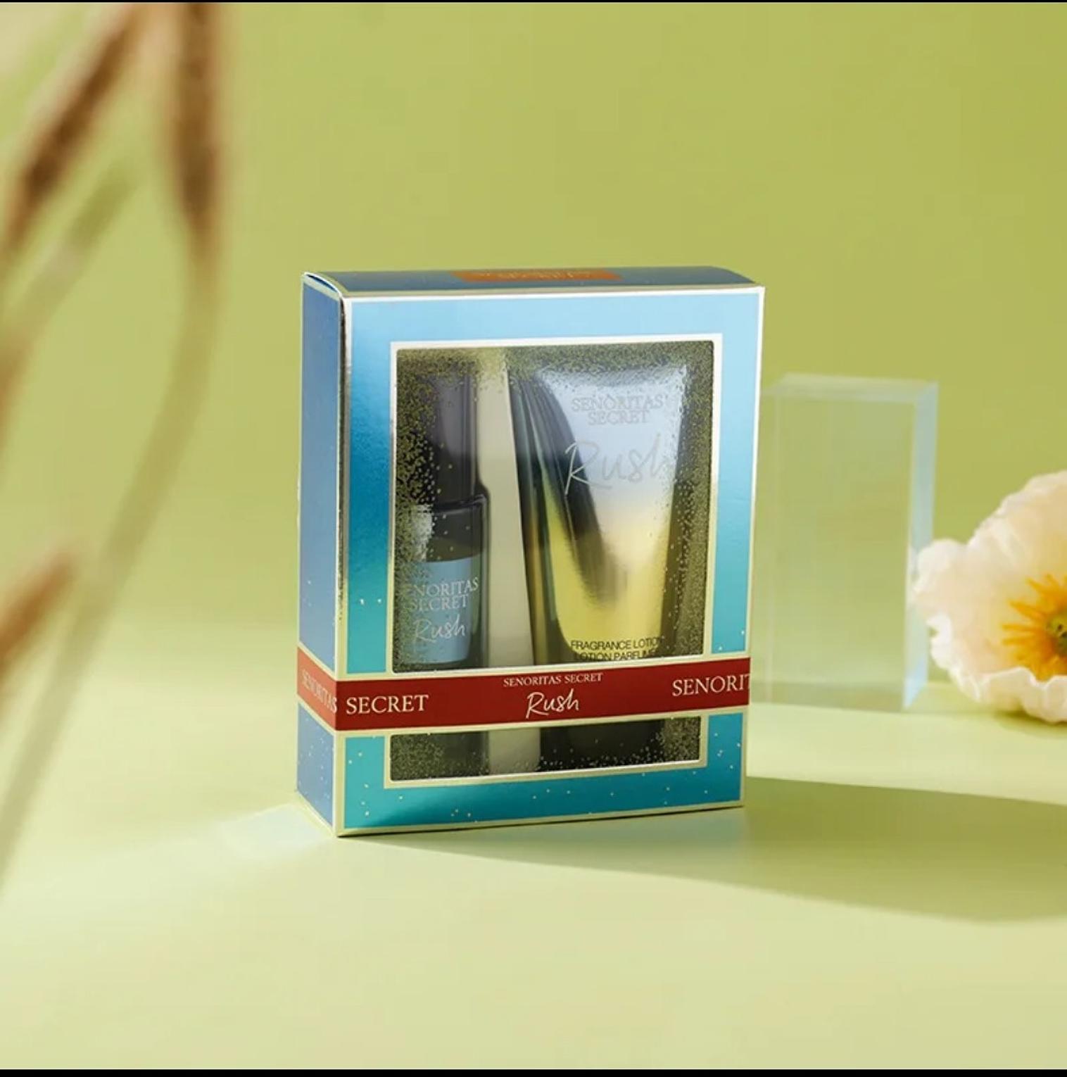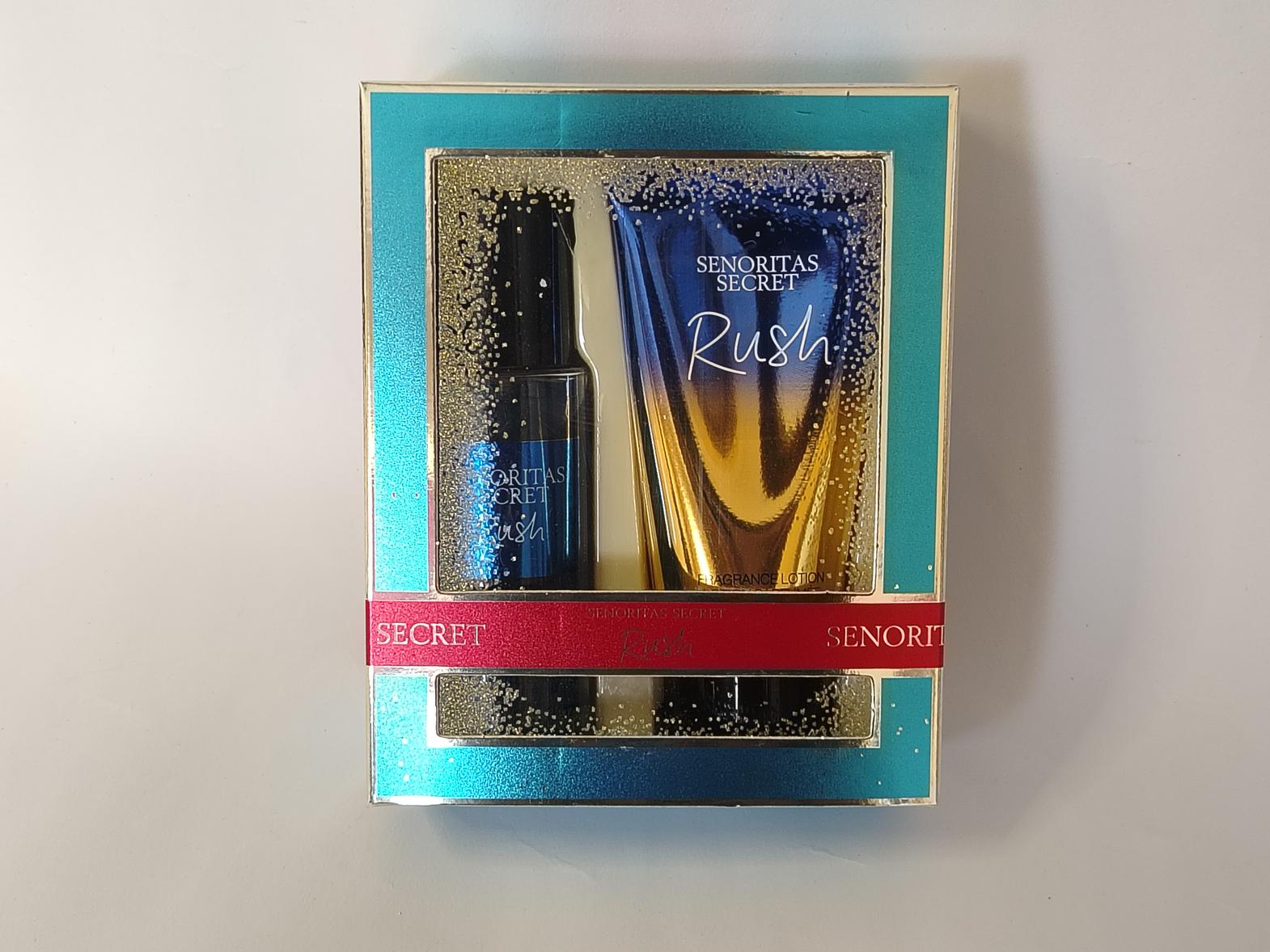 Senoritas Secret Rush Travel Size Perfume Gift Set contains 75ml Perfume Lotion & 75ml Body Mist with notes of flower, fruit, small citrus and amber fragrances.