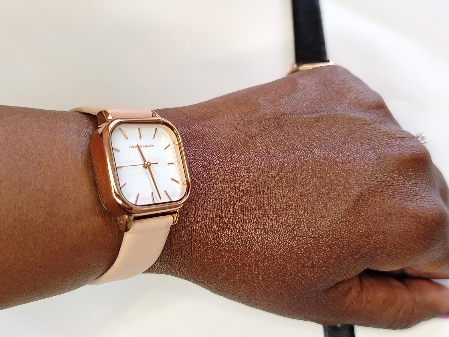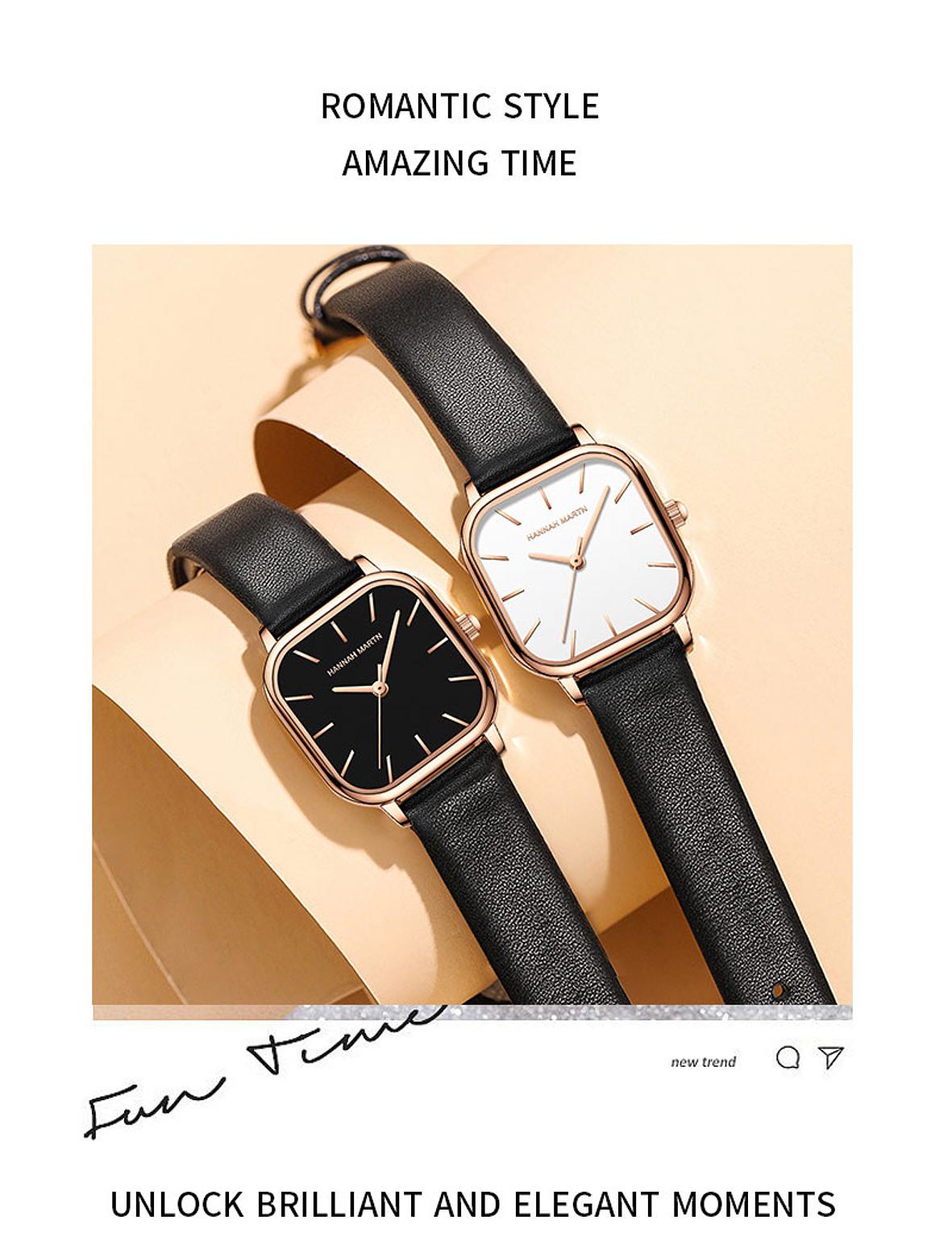 A square rose gold watch with genuine leather straps. Face is Hardlex and bands are made of genuine leather