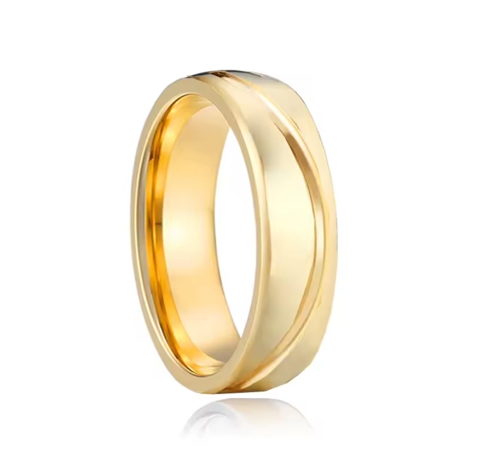 Price is for 1 ring. His and hers stainless steel gold plated wedding rings. Seal your forever with our Wedding Bands, crafted from 18k gold-plated stainless steel and personally engraved with your names and dates. Presented in a luxurious red velvet ring box, these rings are a timeless symbol of your unique love story, designed to last a lifetime.