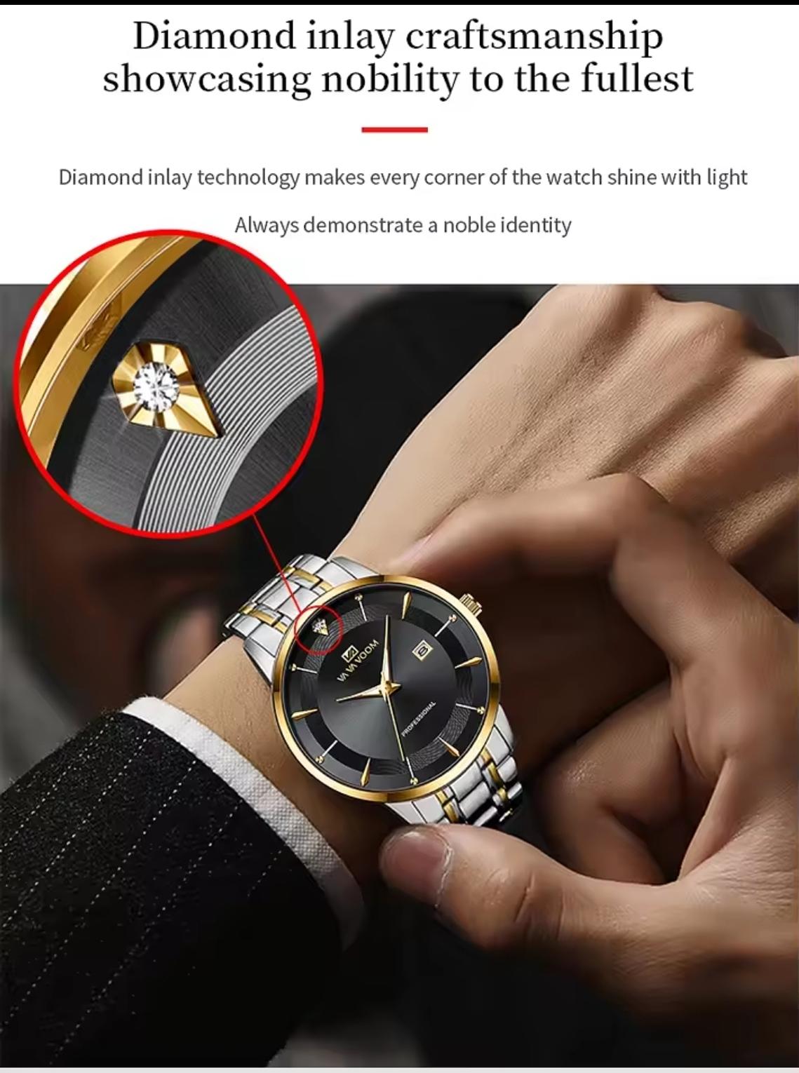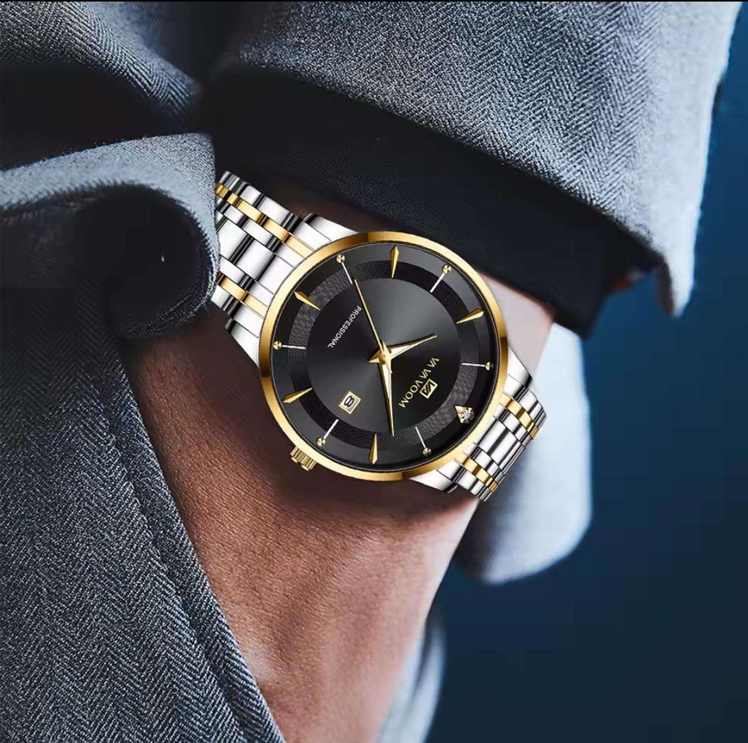 A sleek gentleman's watch for official & casual wear. Crafted with a perfect blend of black, silver and touches of gold. It is stainless steel and water resistant